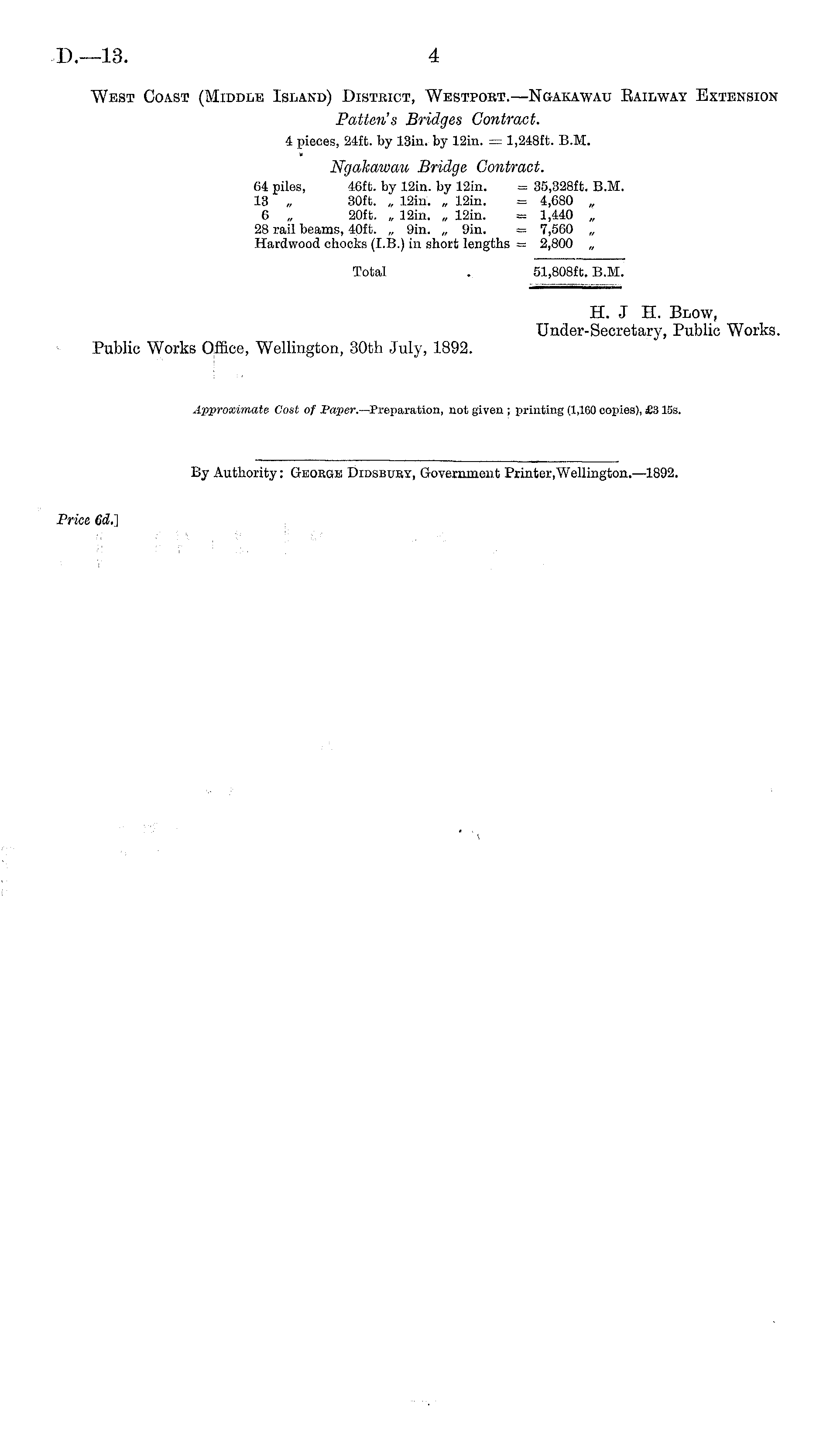 West Coast (Middle Island) District, Westpobt.—Ngakawau Eailway Extension Patten's Bridges Contract. 4 pieces, 24ft. by 13in. by 12in. = 1,248 ft. B.M. 1 Ngakawau Bridge Contract. 64 piles, 46ft. by 12in. by 12in. = 35,328 ft. B.M. 13 „ 30ft. „ 12in. „ 12in. = 4,680 „ 6 „ 20ft. „ 12m, „ 12in. = 1,440 „ 28 rail beams, 40ft. „ 9in. „ 9in. = 7,560 „ Hardwood chocks (I.B.) in short lengths = 2,800 „ Total . 51,808 ft. B.M. H. J H. Blow, Under-Secretary, Public Works. Public Works Office, Wellington, 30th July, 1892. Approximate Cost of Paper.— Preparation, not given ; printing (1,100 copies), Si 15s.