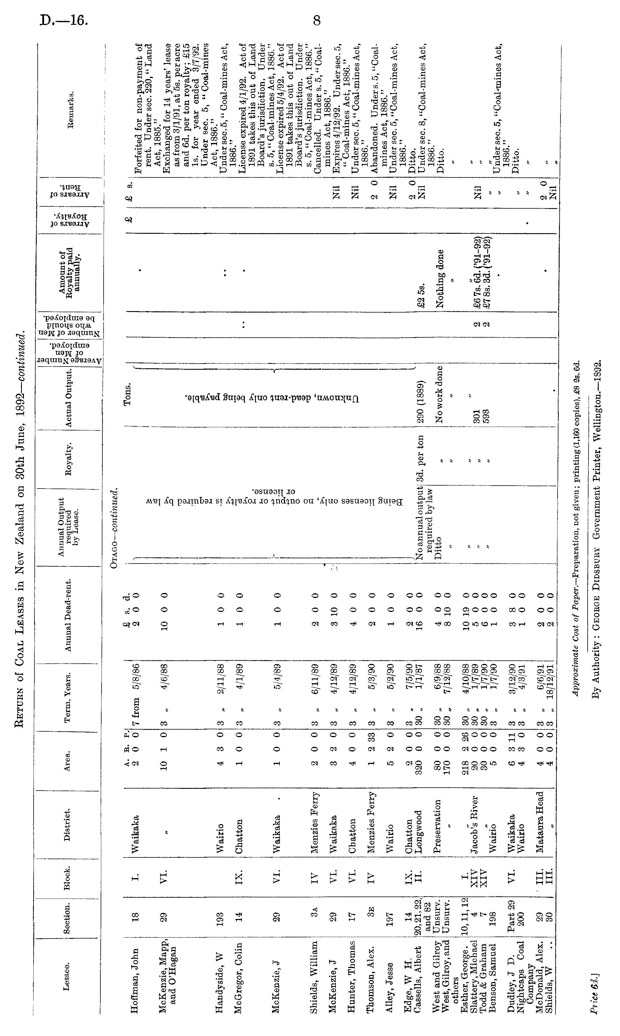 Return of Coal Leases in New Zealand on 30th June, 1892— continued.