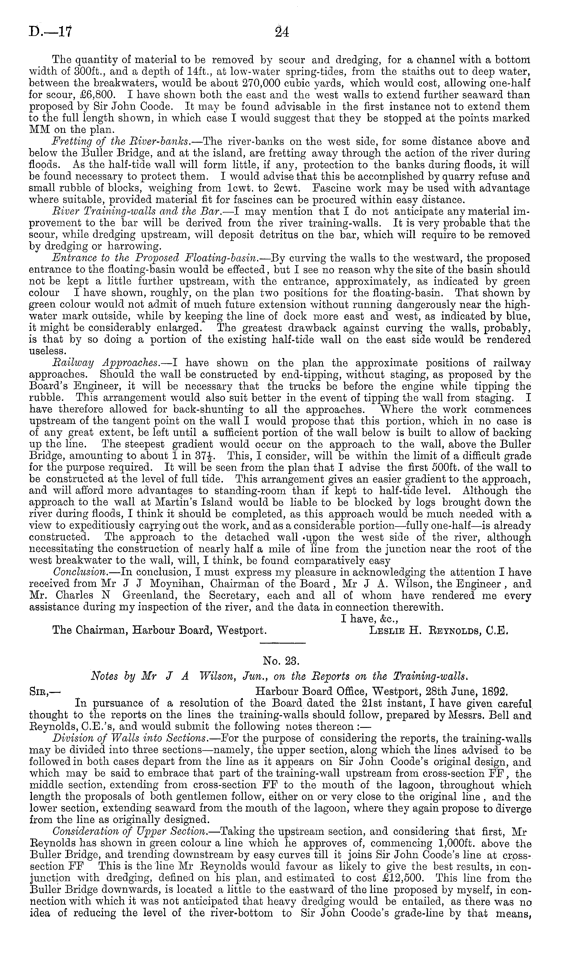 No. 23. Notes by Mr J A Wilson, Jim., on the Reports on the Trcoining-ivalls. Sic,— Harbour Board Office, Westport, 28th June, 1892. In pursuance of a resolution of the Board dated the 21st instant, I have given careful thought to the reports on the lines the training-walls should follow, prepared by Messrs. Bell and Eeynolds, C.B.s, and would submit the following notes thereon :— Division of Walls into Sections. —For the purpose of considering the reports, the training-walls may be divided into three sections—namely, the upper section, along which the lines advised to be followed in both cases depart from the line as it appears on Sir John Coode's original design, and which may be said to embrace that part of the training-wall upstream from cross-section FF, the middle section, extending from cross-section FF to the mouth of the lagoon, throughout which length the proposals of both gentlemen follow, either on or very close to the original line , and the lower section, extending seaward from the mouth of the lagoon, where they again propose to diverge from the line as originally designed. Consideration of Upper Section. —Taking the upstream section, and considering that first, Mr Eeynolds has shown in green colour a line which he approves of, commencing I,OOOft. above the Buller Bridge, and trending downstream by easy curves till it joins Sir John Coode's line at crosssection FF This is the line Mr Eeynolds would favour as likely to give the best results, in conjunction with dredging, defined on his plan, and estimated to cost £12,500. This line from the Buller Bridge downwards, is located a little to the eastward of the line proposed by myself, in connection with which it was not anticipated that heavy dredging would be entailed, as there was no idea of reducing the level of the river-bottom to Sir John Coode's grade-line by that means,