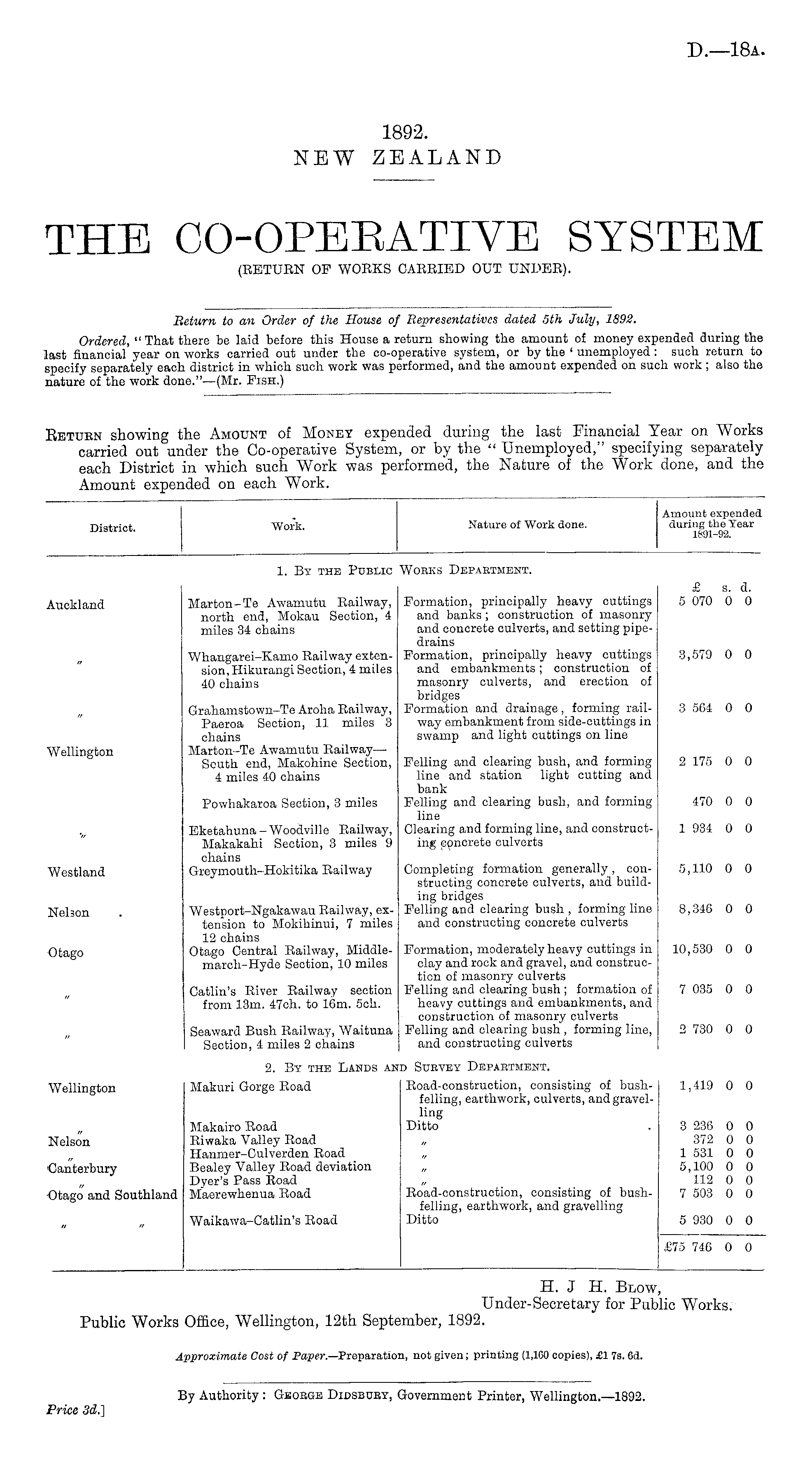 H. J H. Blow, Under-Secretary for Public Works. Public Works Office, Wellington, 12th September, 1892.