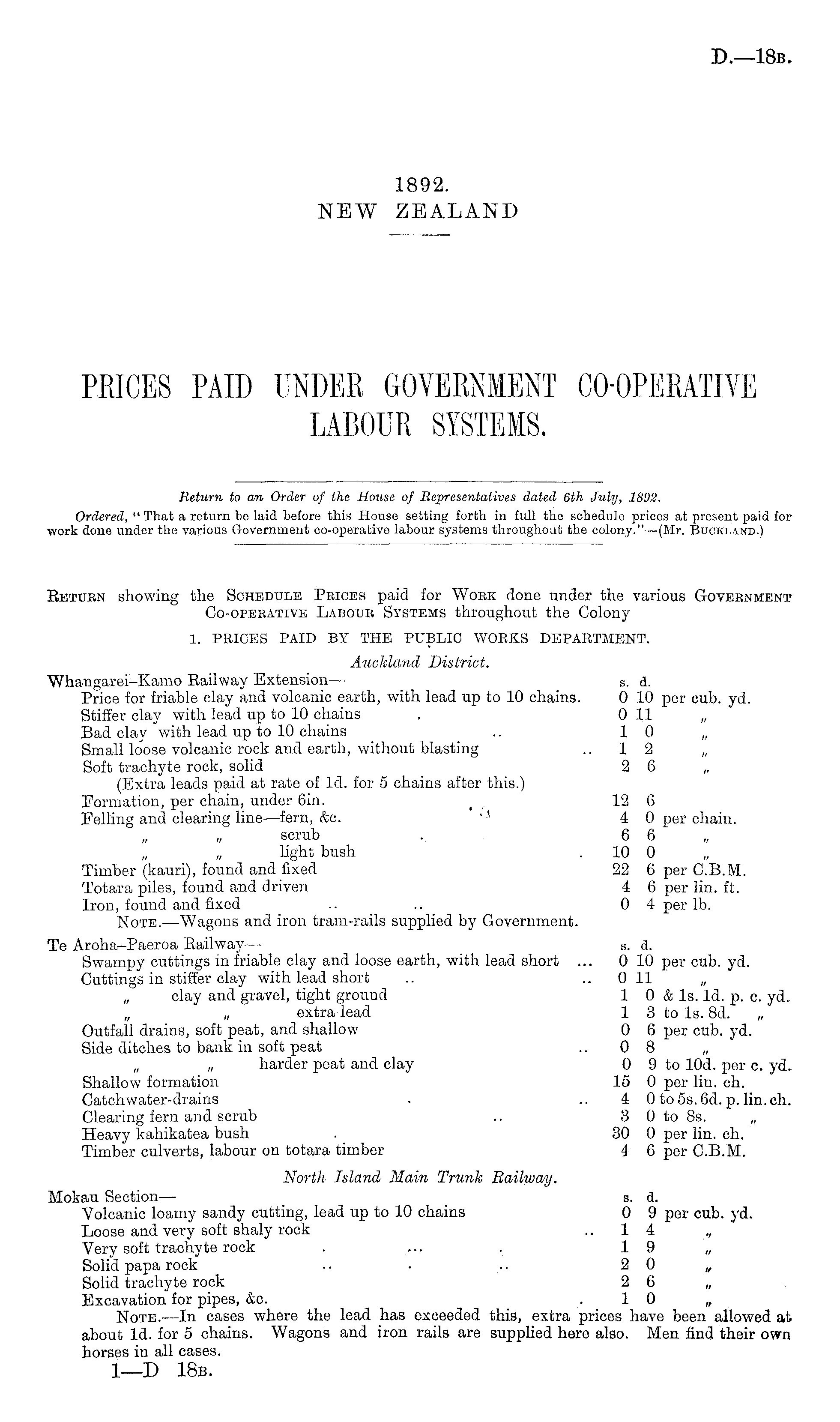 Return to an Order of the House of Representatives dated 6th July, 1892. Ordered, " That a return be laid before this House setting forth in full the schedule prices at present paid for work done under the various Government co-operative labour systems throughout the colony."—(Mr. Buckland.)