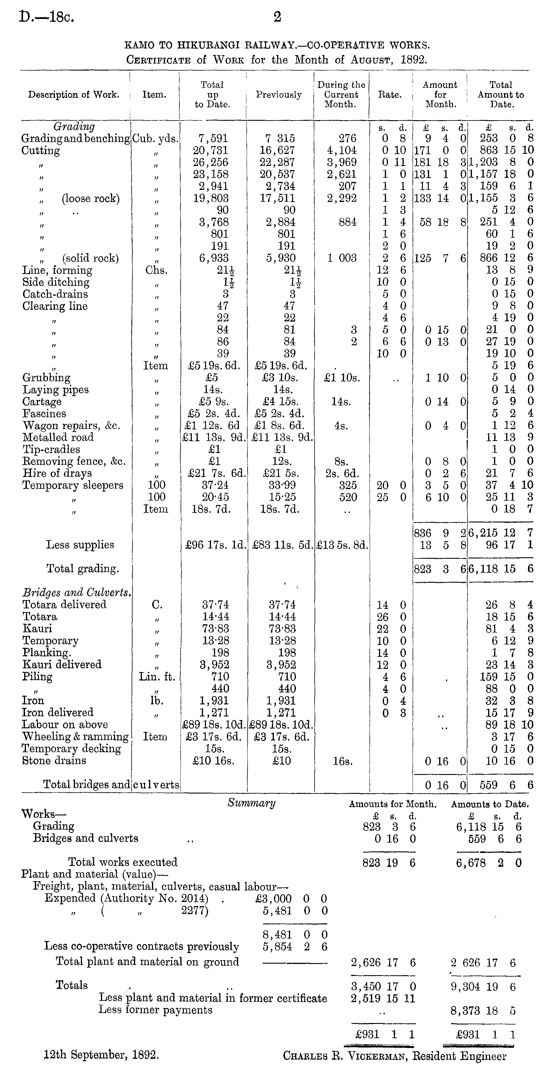 ! I I I I I Summary Amounts for Month. Amounts to Date, Works— £ s. d. £ s, d. Grading 823 3 6 6,118 15 6 Bridges and culverts .. 0 16 0 559 6 6 Total works executed 823 19 6 6,678 2 0 Plant and material (value) — Freight, plant, material, culverts, casual labour—• Expended (Authority No. 2014) . £3,000 0 0 ( „ 2277) 5,481 0 0 8,481 0 0 Less co-operative contracts previously 5,854 2 6 Total plant and material on ground ■ 2,626 17 6 2 626 17 6 Totals . .. 3,450 17 0 9,304 19 6 Less plant and material in former certificate 2,519 15 11 Less former payments .. 8,373 18 5 £931 1 1 £931 1 1 12th September, 1892. Charles E. Vickerman, Eesident Engineer