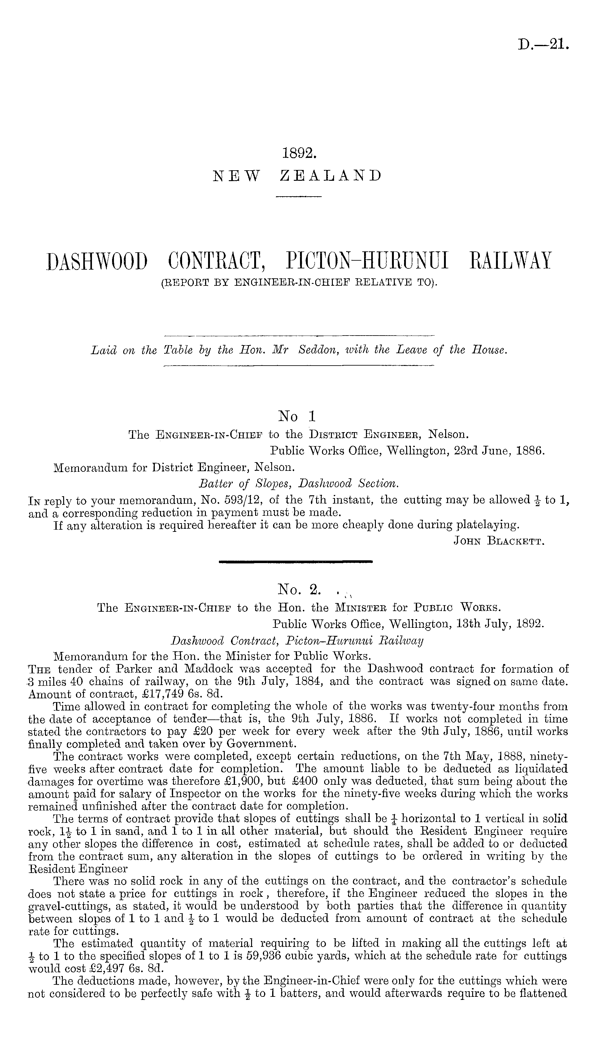 No. 2. The Engineee-in-Chief to the Hon. the Ministeb for Public Woeks. Public Works Office, Wellington, 13th July, 1892. Dashwood Contract, Picton-Hurunui Railway Memorandum for the Hon. the Minister for Public Works. The tender of Parker and Maddock was accepted for the Dashwood contract for formation of 3 miles 40 chains of railway, on the 9th July, 1884, and the contract was signed on same date. Amount of contract, £17,749 6s. Bd. Time allowed in contract for completing the whole of the works was twenty-four months from the date of acceptance of tender —that is, the 9th July, 1886. If works not completed in time stated the contractors to pay £20 per week for every week after the 9th July, 1886, until works finally completed and taken over by Government. The contract works were completed, except certain reductions, on the 7th May, 1888, ninetyfive weeks after contract date for completion. The amount liable to be deducted as liquidated damages for overtime was therefore £1,900, but £400 only was deducted, that sum being about the amount paid for salary of Inspector on the works for the ninety-five weeks during which, the works remained unfinished after the contract date for completion. The terms of contract provide that slopes of cuttings shall be J horizontal to 1 vertical in solid rock, 11 to 1 in sand, and 1 to 1 in all other material, but should the Eesident Engineer require any other slopes the difference in cost, estimated at schedule rates, shall be added to or deducted from the contract sum, any alteration in the slopes of cuttings to be ordered in writing by the Eesident Engineer There was no solid rock in any of the cuttings on the contract, and the contractor's schedule does not state a price for cuttings in rock, therefore, if the Engineer reduced the slopes in the gravel-cuttings, as stated, it would be understood by both parties that the difference in quantity between slopes of 1 to 1 and 1 to 1 would be deducted from amount of contract at the schedule rate for cuttings. The estimated quantity of material requiring to be lifted in making all the cuttings left at 1 to 1 to the specified slopes of 1 to 1 is 59,936 cubic yards, which at the schedule rate for cuttings would cost £2,497 6s. Bd. The deductions made, however, by the Engineer-in-Chief were only for the cuttings which were not considered to be perfectly safe with 1 to 1 batters, and would afterwards require to be flattened