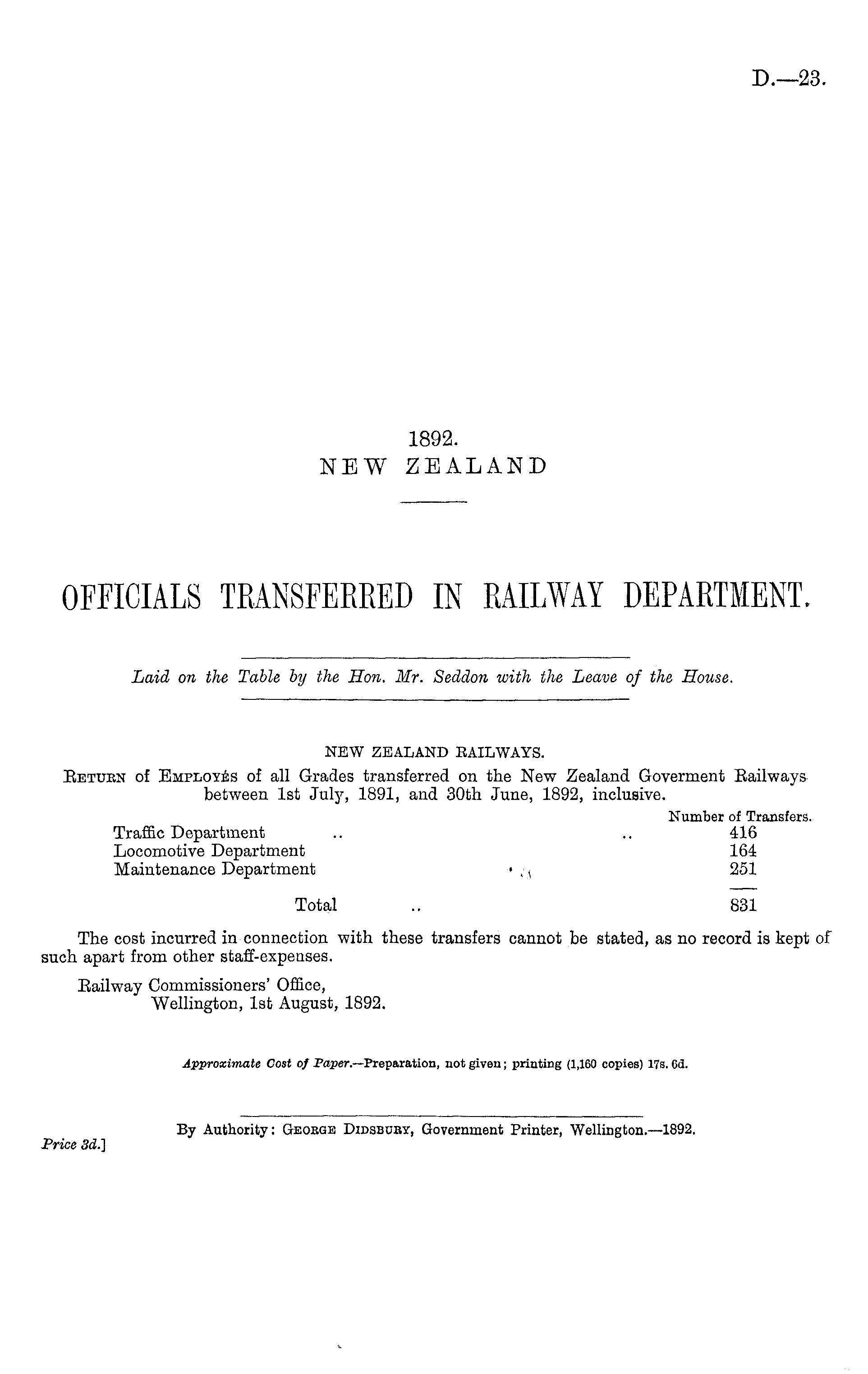 NEW ZEALAND EAILWAYS. Eetuen of Employes of all Grades transferred on the New Zealand Goverment Bailwaysbetween Ist July, 1891, and 30th June, 1892, inclusive. Number of Transfers. Traffic Department .. .. 416 Locomotive Department 164 Maintenance Department • j j 251 Total .. 831 The cost incurred in connection with these transfers cannot be stated, as no record is kept of such apart from other staff-expenses. Bailway Commissioners' Office, Wellington, Ist August, 1892. Approximate Cost of Paper.—Preparation, not given; printing (1,160 copies) 17s. Gd. By Authority: Geobge Didsbuky, Government Printer, Wellington.—lB92. Price 3d.]