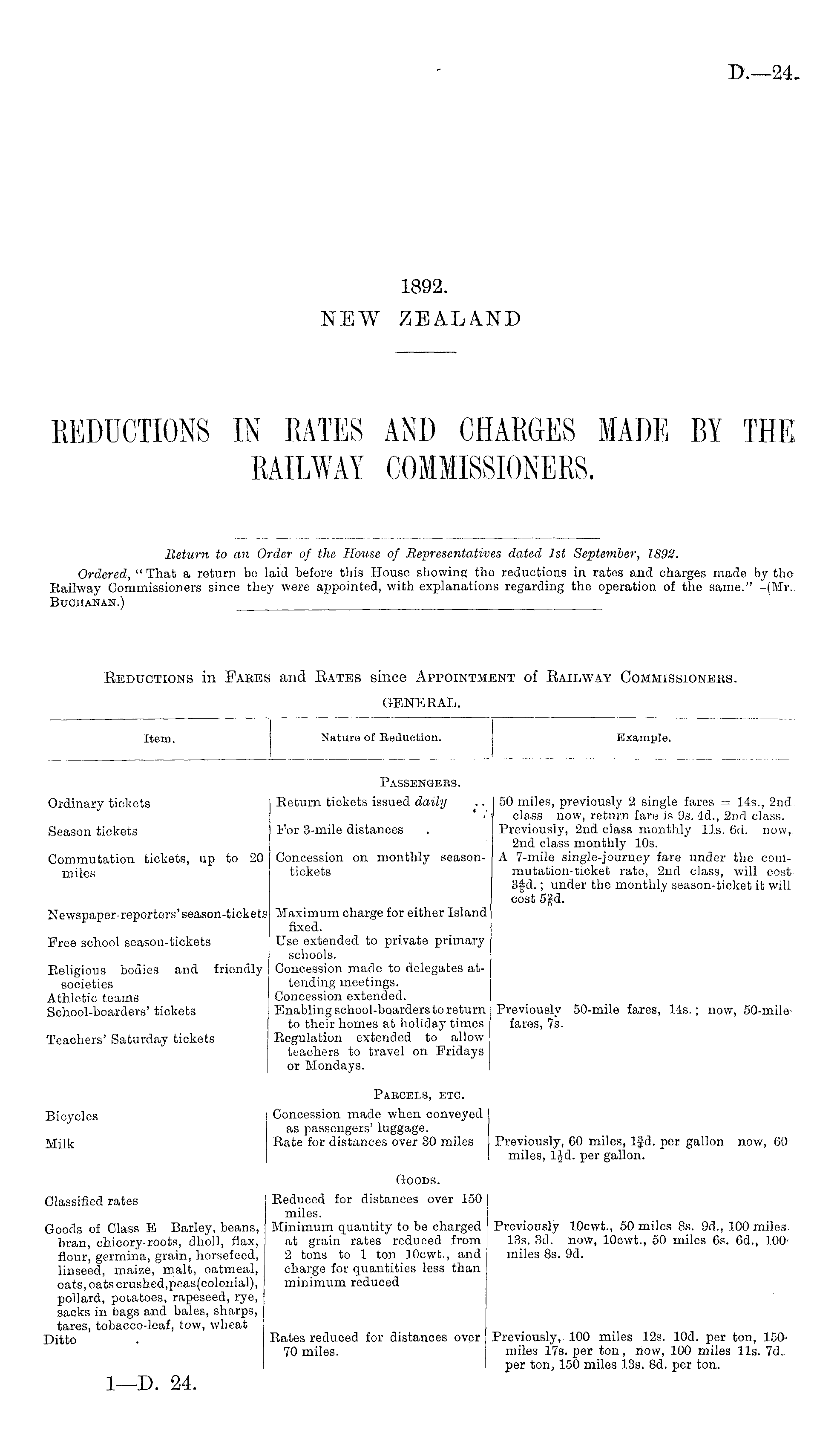 Return to an Order of the House of Representatives dated Ist September, 1892. Ordered, " That a return be laid before this House showing the reductions in rates and charges made by the Eailway Commissioners since they were appointed, with explanations regarding the operation of the same." —(Mr. Buchanan.)