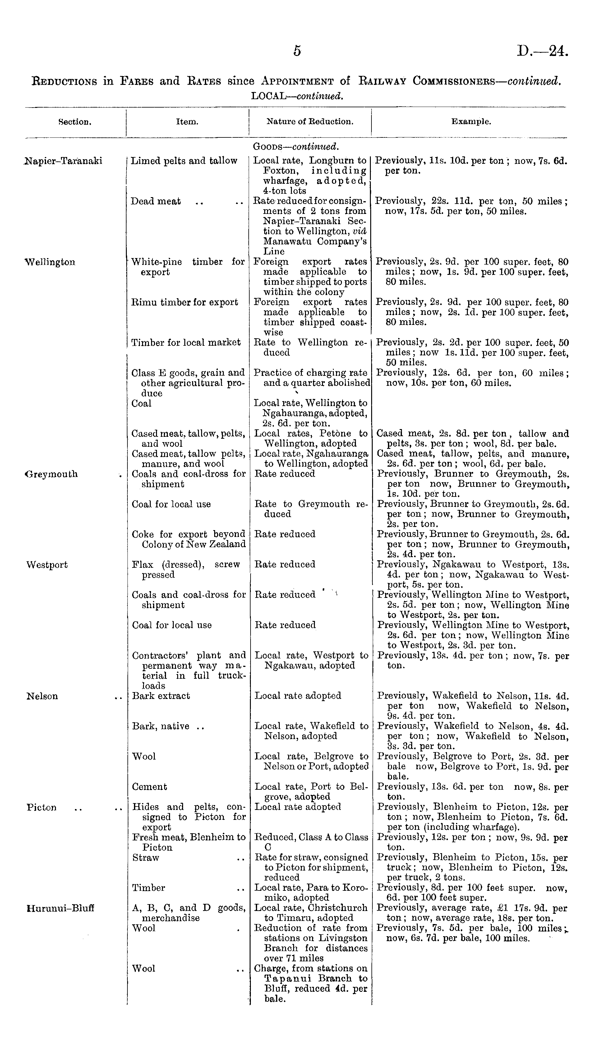 lliCI ;ion. ;em. ;ure ol He: ;ion. Ixampl le. Goods — continued. Previously, 11s. 10d. per ton ; now, 7s. 6d. per ton. apier-Taranaki Wellington Limed pelts and tallow Dead meat White-pine timber for export Local rate, Longburn to Foxton, including wharfage, adopted, 4-ton lots Rate reducedfor consignments of 2 tons from Napier-Taranaki Section to Wellington, via Manawatu Company's Line Foreign export rates made applicable to timber shipped to ports within the colony Foreign export rates made applicable to timber shipped coastwise Bate to Wellington reduced Previously, 22s. lid. per ton, 50 miles; now, 17s. 5d. per ton, 50 miles. Previously, 2s. 9d. per 100 super, feet, 80 miles ; now, Is. 9d. per 100 super, feet, 80 miles. Rimu timber for export Previously, 2s. 9d. per 100 super, feet, 80 miles ; now, 2s. Id. per 100 super, feet, 80 miles. Timber for local market Previously, 2s. 2d. per 100 super, feet, 50 miles ; now Is. lid. per 100 super, feet, 50 miles. Previously, 12s. 6d. per ton, 60 miles; now, 10s. per ton, 60 miles. Class K goods, grain and other agricultural produce Coal Practice of charging rate and a quarter abolished Cased meat, tallow, pelts, and wool Cased meat, tallow pelts, manure, and wool Coals and coal-dross for shipment Local rate, Wellington to Ngahauranga, adopted, 2s. 6d. per ton. Local rates, Petone to Wellington, adopted Local rate, Ngahauranga to Wellington, adopted Rate reduced Cased meat, 2s. 8d. per ton, tallow and pelts, 3s. per ton; wool, 8d. per bale. Cased meat, tallow, pelts, and manure, 2s. 6d. per ton ; wool, 6d. per bale. Previously, Brunner to Greymouth, 2s. per ton now, Brunner to Greymouth, Is. 10d. per ton. Previously, Brunner to Greymouth, 2s. 6d. per ton; now, Brunner to Greymouth, 2s. per ton. Previously, Brunner to Greymouth, 2s. 6d. per ton; now, Brunner to Greymouth, 2s. 4d. per ton. Previously, Ngakawau to Westport, 13s. 4d. per ton; now, Ngakawau to Westport, 5s. per ton. Previously, Wellington Mine to Westport, 2s. 5d. per ton; now, Wellington Mine to Westport, 2s. per ton. Previously, Wellington Mine to Westport, 2s. 6d. per ton; now, Wellington Mine to Westpoit, 2s. 3d. per ton. Previously, 13s. 4d. per ton; now, 7s. per ton. ■Greymouth Coal for local use Rate to Greymouth reduced Westport Coke for export beyond Colony of New Zealand Rate reduced Flax (dressed), screw pressed Rate reduced Coals and coal-dross for shipment Rate reduced Coal for local use Rate reduced Contractors' plant and permanent way material in full truckloads Bark extract Local rate, Westport to Ngakawau, adopted Nelson Picton Bark, native .. Wool Cement Hides and pelts, consigned to Picton for export Fresh meat, Blenheim to Picton Straw Local rate adopted Local rate, Wakefield to Nelson, adopted Local rate, Belgrove to Nelson or Port, adopted Local rate, Port to Belgrove, adopted Local rate adopted Previously, Wakefield to Nelson, 11s. 4d. per ton now, Wakefield to Nelson, 9s. 4d. per ton. Previously, Wakefield to Nelson, 4s. 4d. per ton; now, Wakefield to Nelson, 3s. 3d. per ton. Previously, Belgrove to Port, 2s. 3d. per bale now, Belgrove to Port, Is. 9d. per bale. Previously, 13s. 6d. per ton now, 8s. per ton. Previously, Blenheim to Picton, 12s. per ton ; now, Blenheim to Picton, 7s. 6d. per ton (including wharfage). Previously, 12s. per ton; now, 9s. 9d. per ton. Previously, Blenheim to Picton, 15s. per truck; now, Blenheim to Picton, 12s. per truck, 2 tons. Previously, 8d. per 100 feet super, now, 6d. per 100 feet super. Previously, average rate, £1 17s. 9d. per ton; now, average rate, 18s. per ton. Previously, 7s. 5d. per bale, 100 miles; now, 6s. 7d. per bale, 100 miles. Hurunui-Bluff Timber A, B, C, and D goods, merchandise Wool Reduced, Class A to Class C Rate for straw, consigned to Picton for shipment, reduced Local rate, Para to Koromiko, adopted Local rate, Christchurch to Timaru, adopted Reduction of rate from stations on Livingston Branch for distances over 71 miles Charge, from stations on Tapanui Branch to Bluff, reduced 4d. per bale. Wool