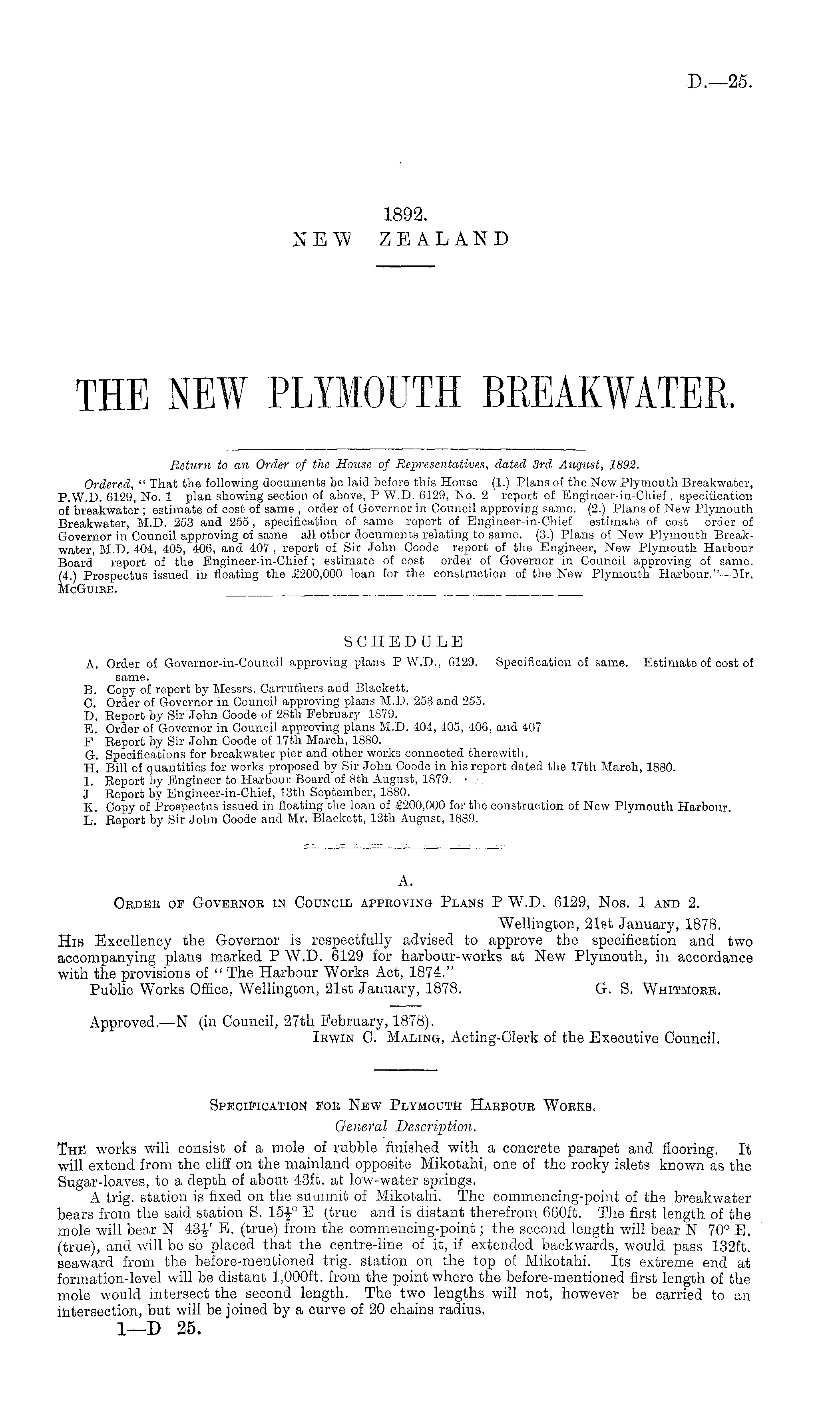 Return to an Order of the House of Representatives, dated 3rd August, 1892. Ordered, " That the following documents be laid before this House (1.) Plans of the New Plymouth Breakwater, P.W.D. 6129, No. 1 plan showing section of above, P W.D. 6129, ]No. 2 report of Engineer-in-Chief, specification of breakwater ; estimate of cost of same , order of Governor in Council approving same. (2.) Plans of New Plymouth Breakwater, M.D. 253 and 255, specification of same report of Engineer-in-Ghief estimate of cost order of Governor in Council approving of same all other documents relating to same. (3.) Plans of New Plymouth Breakwater, M.D. 404, 405, 406, and 407 , report of Sir John Coode report of the Engineer, New Plymouth Harbour Board report of the Engineer-in-Chief; estimate of cost order of Governor in Council approving of same. (4.) Prospectus issued in floating the £200,000 loan for the construction of the New Plymouth Harbour." —Mr. McGuibk.