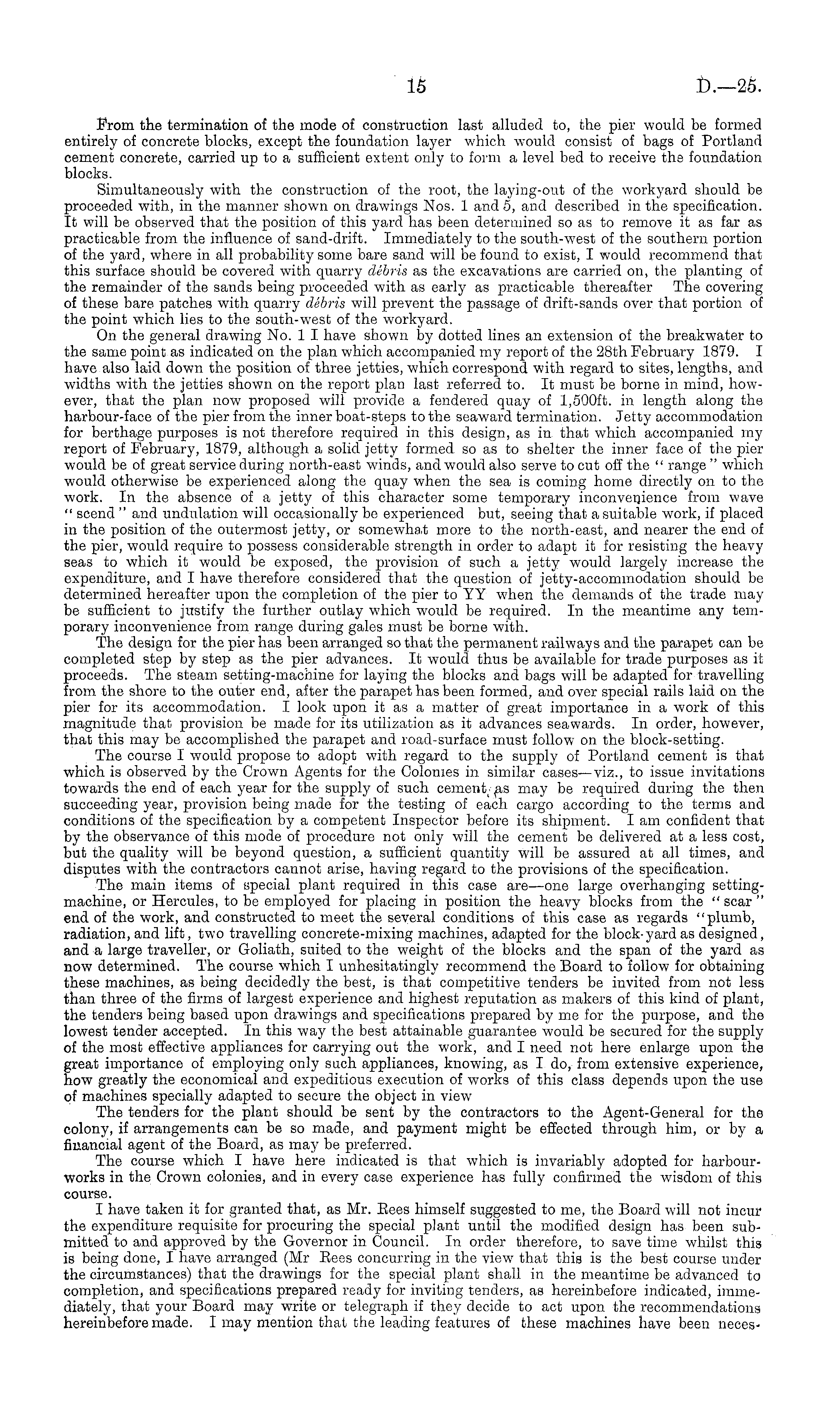 From the termination of the mode of construction last alluded to, the pier would be formed entirely of concrete blocks, except the foundation layer which would consist of bags of Portland cement concrete, carried up to a sufficient extent only to form a level bed to receive the foundation blocks. Simultaneously with the construction of the root, the laying-out of the workyard should be proceeded with, in the manner shown on drawings Nos. 1 and 5, and described in the specification. It will be observed that the position of this yard has been determined so as to remove it as far as practicable from the influence of sand-drift. Immediately to the south-west of the southern portion of the yard, where in all probability some bare sand will be found to exist, I would recommend that this surface should be covered with quarry debris as the excavations are carried on, the planting of the remainder of the sands being proceeded with as early as practicable thereafter The covering of these bare patches with quarry debris will prevent the passage of drift-sands over that portion of the point which lies to the south-west of the workyard. On the general drawing No. 1 I have shown by dotted lines an extension of the breakwater to the same point as indicated on the plan which accompanied my report of the 28th February 1879. I have also laid down the position of three jetties, which correspond with regard to sites, lengths, and widths with the jetties shown on the report plan last referred to. It must be borne in mind, however, that the plan now proposed will provide a fendered quay of 1,500 ft. in length along the harbour-face of the pier from the inner boat-steps to the seaward termination. Jetty accommodation for berthage purposes is not therefore required in this design, as in that which accompanied my report of February, 1879, although a solid jetty formed so as to shelter the inner face of the pier would be of great service during north-east winds, and would also serve to cut off the " range " which would otherwise be experienced along the quay when the sea is coming home directly on to the work. In the absence of a jetty of this character some temporary inconvenience from wave " scend " and undulation will occasionally be experienced but, seeing that a suitable work, if placed in the position of the outermost jetty, or somewhait more to the north-east, and nearer the end of the pier, would require to possess considerable strength in order to adapt it for resisting the heavy seas to which it would be exposed, the provision of such a jetty would largely increase the expenditure, and I have therefore considered that the question of jetty-accommodation should be determined hereafter upon the completion of the pier to YY when the demands of the trade may be sufficient to justify the further outlay which would be required. In the meantime any temporary inconvenience from range during gales must be borne with. The design for the pier has been arranged so that the permanent railways and the parapet can be completed step by step as the pier advances. It would thus be available for trade purposes as it proceeds. The steam setting-machine for laying the blocks and bags will be adapted for travelling from the shore to the outer end, after the parapet has been formed, and over special rails laid on the pier for its accommodation. I look upon it as a matter of great importance in a work of this magnitude that provision be made for its utilization as it advances seawards. In order, however, that this may be accomplished the parapet and road-surface must follow on the block-setting. The course I would propose to adopt with regard to the supply of Portland cement is that which is observed by the Crown Agents for the Colonies in similar cases—viz., to issue invitations towards the end of each year for the supply of such cement <as may be required during the then succeeding year, provision being made for the testing of each cargo according to the terms and conditions of the specification by a competent Inspector before its shipment. lam confident that by the observance of this mode of procedure not only will the cement be delivered at a less cost, but the quality will be beyond question, a sufficient quantity will be assured at all times, and disputes with the contractors cannot arise, having regard to the provisions of the specification. The main items of special plant required in this case are—one large overhanging settingmachine, or Hercules, to be employed for placing in position the heavy blocks from the " scar " end of the work, and constructed to meet the several conditions of this case as regards "plumb, radiation, and lift, two travelling concrete-mixing machines, adapted for the block-yard as designed, and a large traveller, or Goliath, suited to the weight of the blocks and the span of the yard as now determined. The course which I unhesitatingly recommend the Board to follow for obtaining these machines, as being decidedly the best, is that competitive tenders be invited from not less than three of the firms of largest experience and highest reputation as makers of this kind of plant, the tenders being based upon drawings and specifications prepared by me for the purpose, and the lowest tender accepted. In this way the best attainable guarantee would be secured for the supply of the most effective appliances for carrying out the work, and I need not here enlarge upon the great importance of employing only such appliances, knowing, as I do, from extensive experience, how greatly the economical and expeditious execution of works of this class depends upon the use of machines specially adapted to secure the object in view The tenders for the plant should be sent by the contractors to the Agent-General for the colony, if arrangements can be so made, and payment might be effected through him, or by a financial agent of the Board, as may be preferred. The course which I have here indicated is that which is 