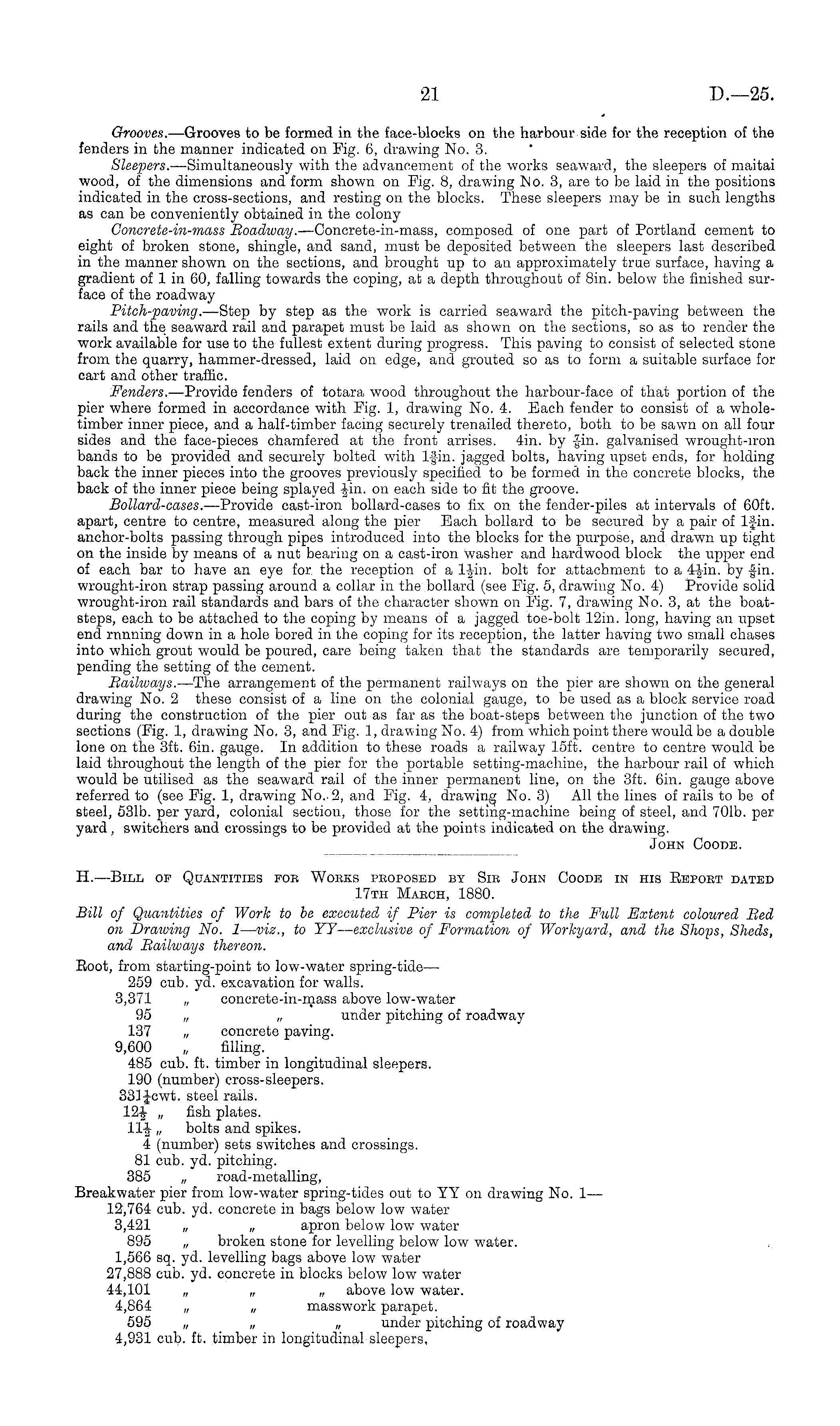 H.—Bill op Quantities poe Works proposed by Sir John Coode in his Repoet dated 17th Maech, 1880. Bill of Quantities of Work to be executed if Pier is completed, to the Full Extent coloured Red on Drawing No. I — viz., to YY — exclusive of Formation of Workyard, and the Shops, Sheds, and Railways thereon. Root, from starting-point to low-water spring-tide— 259 cub. yd. excavation for walls. 3,371 „ concrete-in-mass above low-water 95 „ „ under pitching of roadway 137 „ concrete paving. 9,600 „ filling. 485 cub. ft. timber in longitudinal sleepers. 190 (number) cross-sleepers. 331 Jcwt. steel rails. 12f „ fish plates, llf „ bolts and spikes. 4 (number) sets switches and crossings. 81 cub. yd. pitching. 385 „ road-metalling, Breakwater pier from low-water spring-tides out to YY on drawing No. 1— 12,764 cub. yd. concrete in bags below low water 3,421 „ „ apron below low water 895 „ broken stone for levelling below low water. 1,566 sq. yd. levelling bags above low water 27,888 cub. yd. concrete in blocks below low water 44,101 „ „ „ above low water. 4,864 „ „ masswork parapet. 595 „ „ „ under pitching of roadway 4,931 cub. ft. timber in longitudinal sleepers.