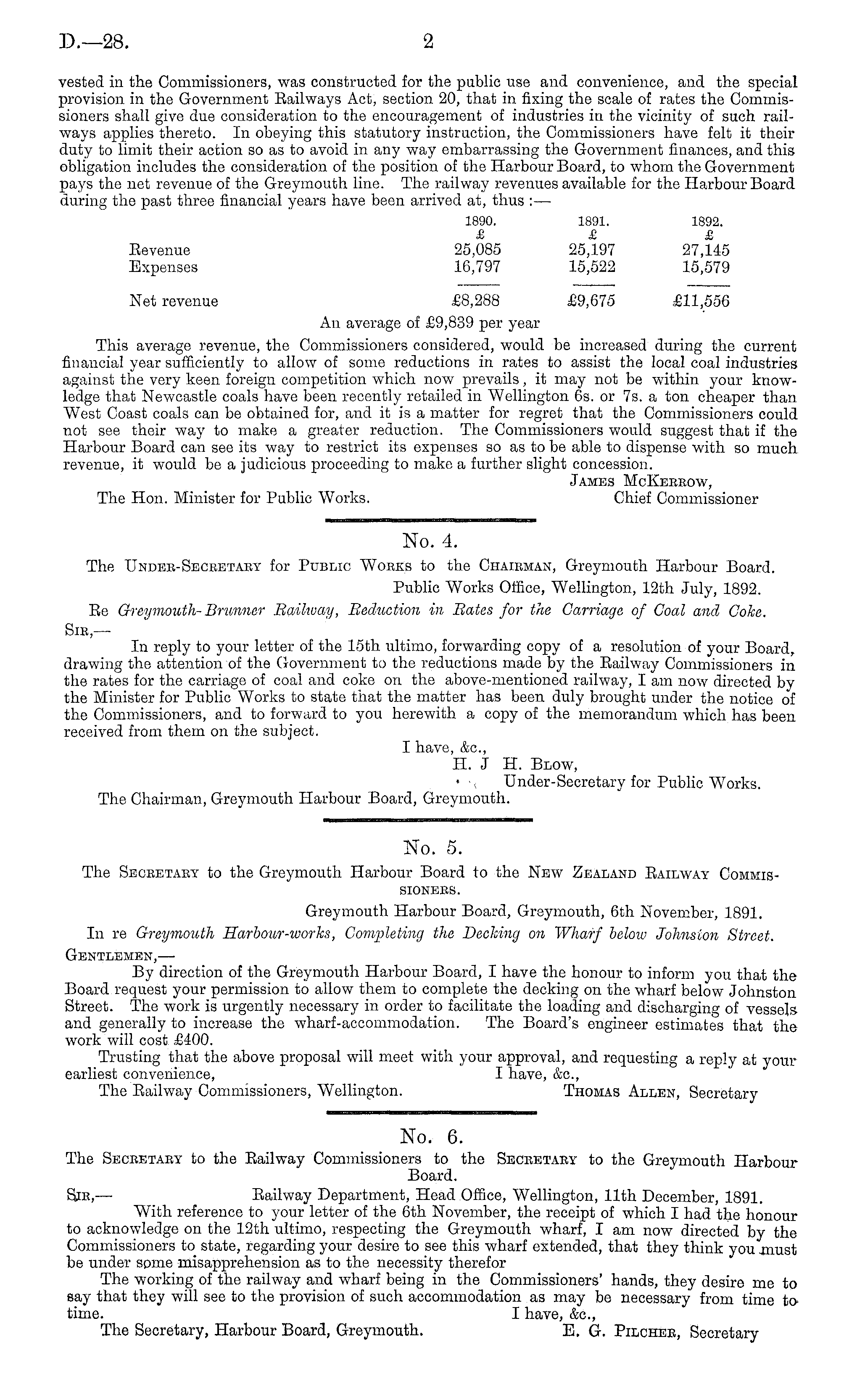 No. 5. The Seceetaey to the Greymouth Harbour Board to the New Zealand Eailway Commissioners. Greymouth Harbour Board, Greymouth, 6th November, 1891. In re Greymouth Harbour-works, Completing the Decking on Wharf below Johnston Street. Gentlemen, — By direction of the Greymouth Harbour Board, I have the honour to inform you that the Board request your permission to allow them to complete the decking on the wharf below Johnston Street. The work is urgently necessary in order to facilitate the loading and discharging of vessels and generally to increase the wharf-accommodation. The Board's engineer estimates that the work will cost £400. Trusting that the above proposal will meet with your approval, and requesting a reply at your earliest convenience, I have, te., The Eailway Commissioners, Wellington. Thomas Allen, Secretary