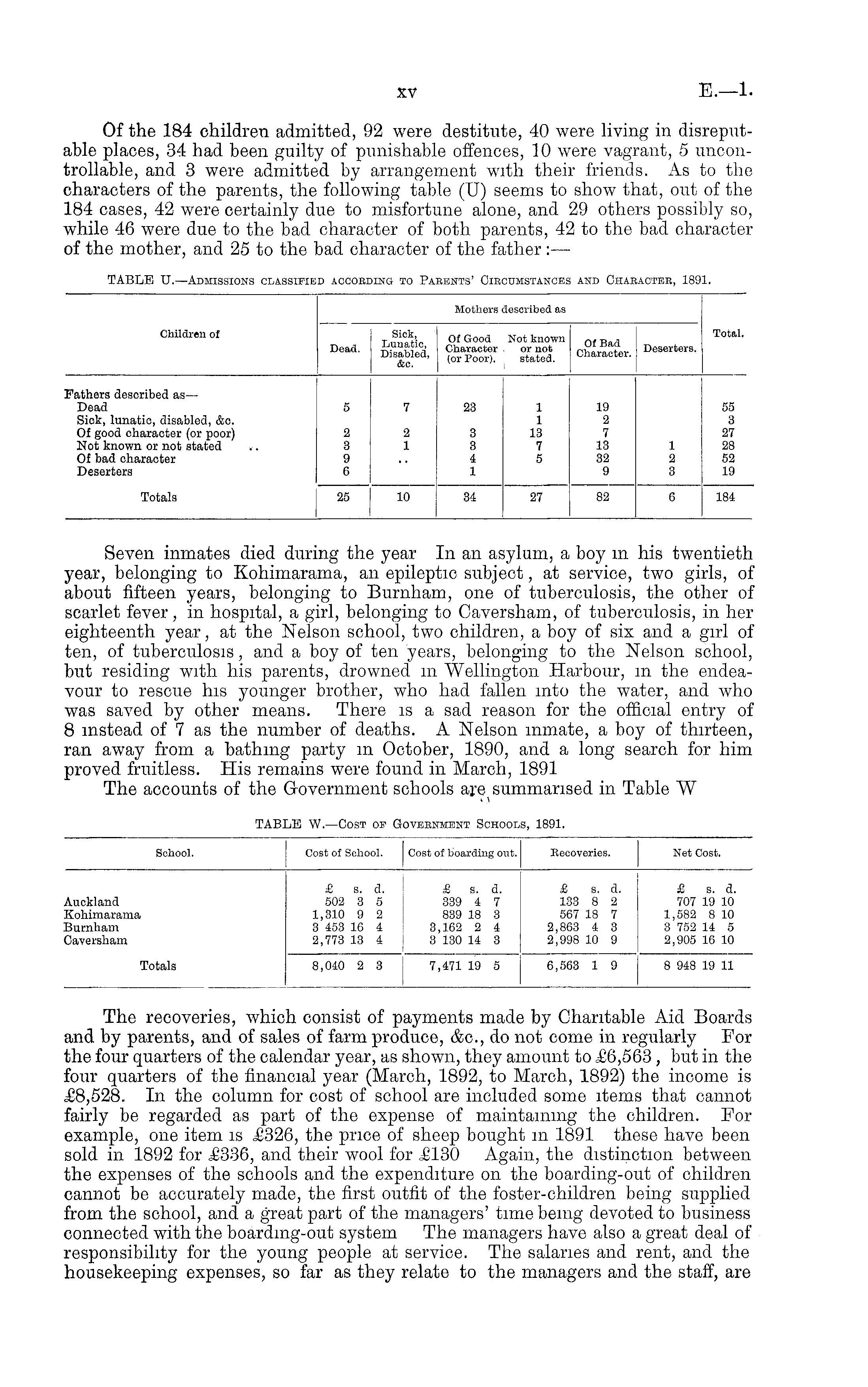 Seven inmates died during the year In an asylum, a boy in his twentieth year, belonging to Kohimarama, an epileptic subject, at service, two girls, of about fifteen years, belonging to Burnham, one of tuberculosis, the other of scarlet fever, in hospital, a girl, belonging to Caversham, of tuberculosis, in her eighteenth year, at the Nelson school, two children, a boy of six and a girl of ten, of tuberculosis, and a boy of ten years, belonging to the Nelson school, but residing with his parents, drowned m Wellington Harbour, in the endeavour to rescue his younger brother, who had fallen into the water, and who was saved by other means. There is a sad reason for the official entry of 8 instead of 7 as the number of deaths. A Nelson inmate, a boy of thirteen, ran away from a bathing party in October, 1890, and a long search for him proved fruitless. His remains were found in March, 1891 The accounts of the Government schools are summarised in Table W