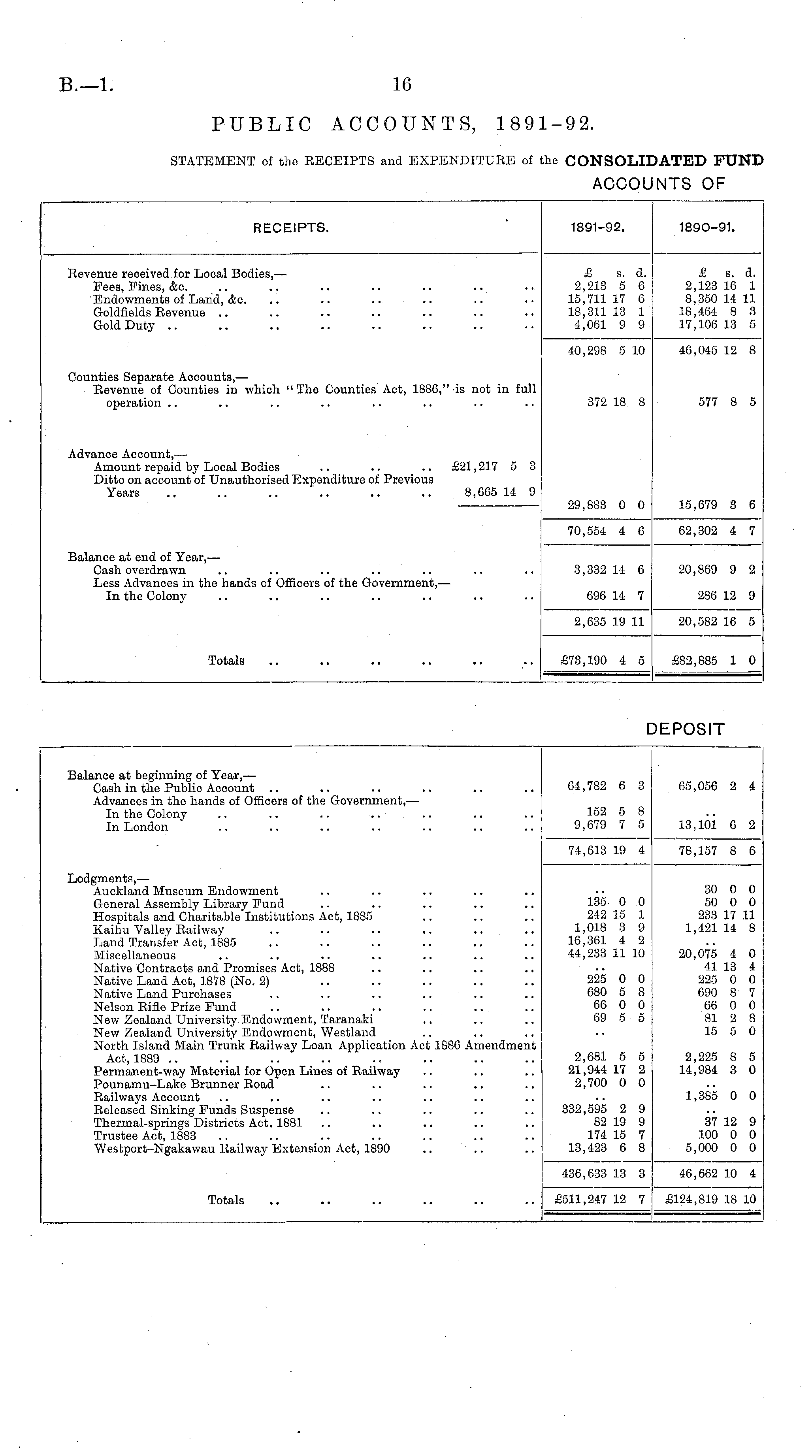 RECEIPTS. 1891-92. 1890-91. tevenue received for Local Bodies, — Fees, Fines, &c. Endowments of Land, &c. Goldfields Revenue Gold Duty .. £ s. d. 2,213 5 6 15,711 17 6 18,311 13 1 4,061 9 9 £ s. a. 2,123 16 1 8,350 14 11 18,464 8 3 17,106 13 5 Jounties Separate Accounts, — Revenue of Counties in which " The Counties Act, 1886," is not in full operation 40,298 5 10 46,045 12 8 372 18 8 577 8 5 idvance Account, — Amount repaid by Local Bodies .. .. .. £21,217 5 3 Ditto on account of Unauthorised Expenditure of Previous Years .. .. .. .. .. .. 8,665 14 9 29,883 0 0 15,679 3 6 ialance at end of Year, — Cash overdrawn Less Advances in the hands of Officers of the Government,- — In the Colony 70,554 4 6 3,332 14 6 62,302 4 7 20,869 9 2 696 14 7 286 12 9 2,635 19 11 20,582 16 5 Totals £73,190 4 5 £82,885 1 0 EPOSIT Ialance at beginning of Year,— Cash in the Public Account .. Aavances in the hands of Officers of the Government, — In the Colony In London 64,782 6 3 152 5 8 9,679 7 5 65,056 2 4 13,101 6 2 74,613 19 4 78,157 8 6 jodgments,— Auckland Museum Endowment General Assembly Library Fund Hospitals and Charitable Institutions Act, 1885 Kaihu Valley Railway .. .. .. .. Land Transfer Act, 1885 Miscellaneous Native Contracts and Promises Act, 1888 Native Land Act, 1878 (No. 2) Native Land Purchases Nelson Rifle Prize Fund New Zealand University Endowment, Taranaki New Zealand University Endowment, Westland North Island Main Trunk Railway Loan Application Act 1886 Amendment Act, 1889 .. .. .. .. Permanent-way Material for Open Lines of Railway Pounamu-Lake Brunner Road Railways Account .. .. .. Released Sinking Funds Suspense Thermal-springs Districts Act, 1881 Trustee Act, 1883 Westport-Ngakawau Railway Extension Act, 1890 135 0 0 242 15 1 1,018 3 9 16,361 4 2 44,233 11 10 225 0 0 680 5 8 66 0 0 69 5 5 30 0 0 50 0 0 233 17 11 1,421 14 8 20,075 4 0 41 13 4 225 0 0 690 8 7 66 0 0 81 2 8 15 5 0 2,681 5 5 21,944 17 2 2,700 0 0 2,225 8 5 14,984 3 0 1,385 0 0 332,595 2 9 82 19 9 174 15 7 13,423 6 8 37 12 9 100 0 0 5,000 0 0 436,633 13 3 46,662 10 4 Totals £511,247 12 7 £124,819 18 10