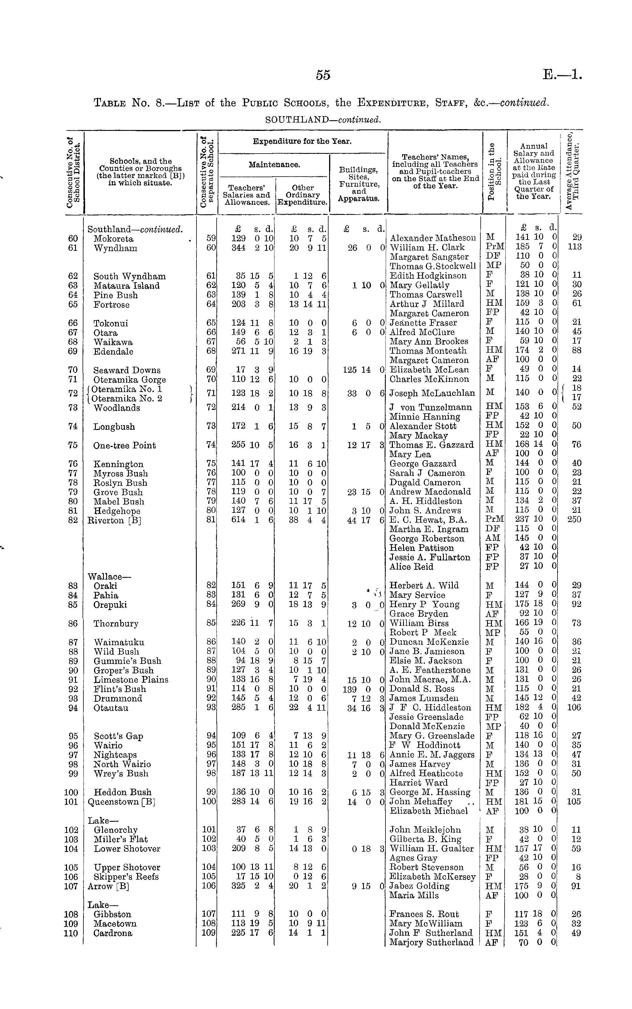 Table No. 8. —List of the Public Schools, the Expenditure, Staff, &c.— continued. SOUTHLAND— continued.