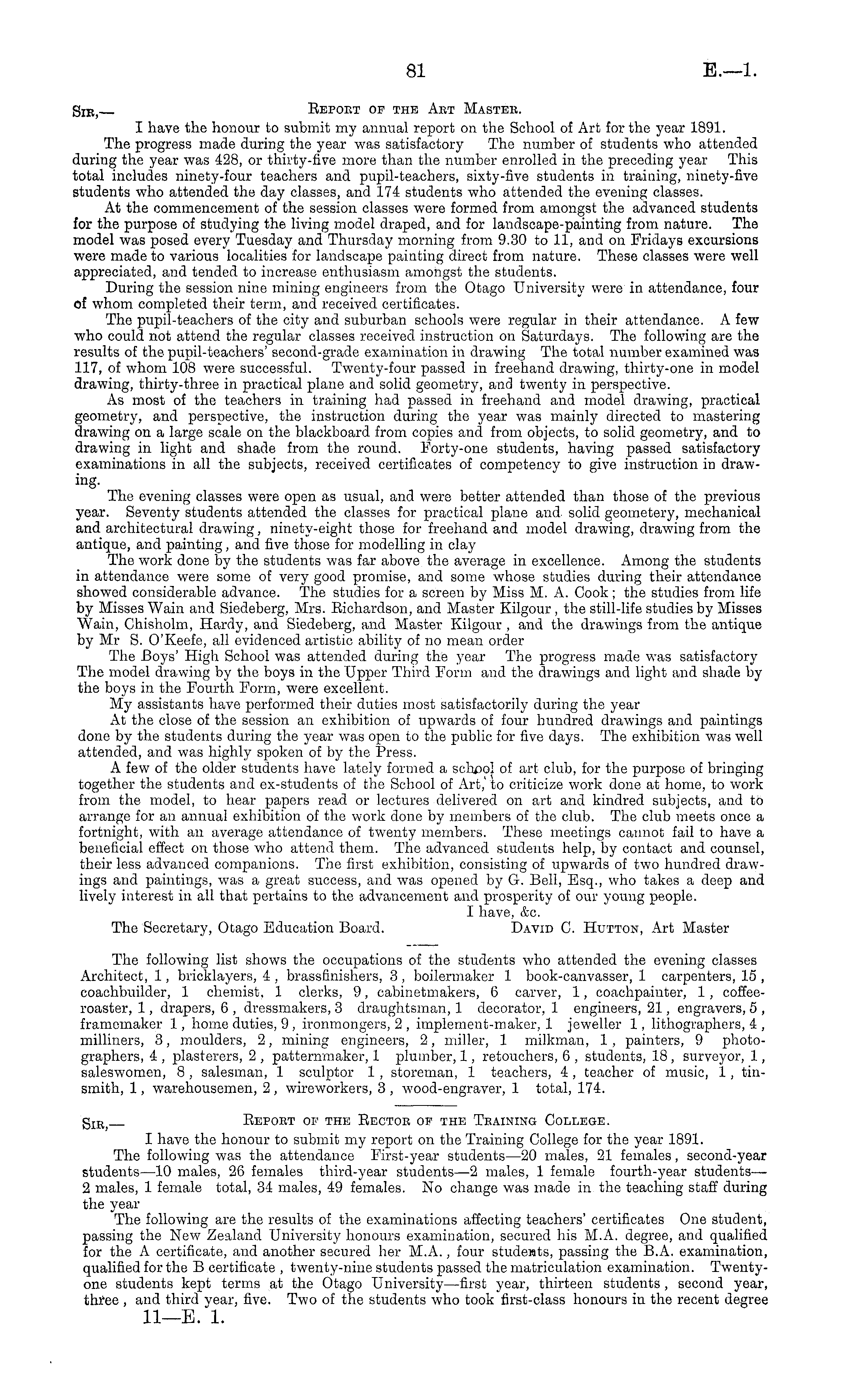 Sir,— Eepoet of the Act Mastee. I have the honour to submit my annual report on the School of Art for the year 1891. The progress made during the year was satisfactory The number of students who attended during the year was 428, or thirty-five more than the number enrolled in the preceding year This total includes ninety-four teachers and pupil-teachers, sixty-five students in training, ninety-five students who attended the day classes, and 174 students who attended the evening classes. At the commencement of the session classes were formed from amongst the advanced students for the purpose of studying the living model draped, and for landscape-painting from nature. The model was posed every Tuesday and Thursday morning from 9.30 to 11, and on Fridays excursions were made to various localities for landscape painting direct from nature. These classes were well appreciated, and tended to increase enthusiasm amongst the students. During the session nine mining engineers from the Otago University were in attendance, four of whom completed their term, and received certificates. The pupil-teachers of the city and suburban schools were regular in their attendance. A few who could not attend the regular classes received instruction on Saturdays. The following are the results of the pupil-teachers' second-grade examination in drawing The total number examined was 117, of whom 108 were successful. Twenty-four passed in freehand drawing, thirty-one in model drawing, thirty-three in practical plane and solid geometry, and twenty in perspective. As most of the teachers in training had passed in freehand and model drawing, practical geometry, and perspective, the instruction during the year was mainly directed to mastering drawing on a large scale on the blackboard from copies and from objects, to solid geometry, and to drawing in light and shade from the round. Forty-one students, having passed satisfactory examinations in all the subjects, received certificates of competency to give instruction in drawing. The evening classes were open as usual, and were better attended than those of the previous year. Seventy students attended the classes for practical plane and solid geometery, mechanical and architectural drawing, ninety-eight those for freehand and model drawing, drawing from the antique, and painting, and five those for modelling in clay The work done by the students was far above the average in excellence. Among the students in attendance were some of very good promise, and some whose studies during their attendance showed considerable advance. The studies for a screen by Miss M. A. Cook; the studies from life by Misses Wain and Siedeberg, Mrs. Eichardson, and Master Kilgour, the still-life studies by Misses Wain, Chisholm, Hardy, and Siedeberg, and Master Kilgour , and the drawings from the antique by Mr S. O'Keefe, all evidenced artistic ability of no mean order The Boys' High School was attended during the year The progress made was satisfactory The model drawing by the boys in the Upper Third Form and the drawings and light and shade by the boys in the Fourth Form, were excellent. My assistants have performed their duties most satisfactorily during the year At the close of the session an exhibition of upwards of four hundred drawings and paintings done by the students during the year was open to the public for five days. The exhibition was well attended, and was highly spoken of by the Press. A few of the older students have lately formed a schpol of art club, for the purpose of bringing together the students and ex-students of the School of Art,' to criticize work done at home, to work from the model, to hear papers read or lectures delivered on art and kindred subjects, and to arrange for an annual exhibition of the work done by members of the club. The club meets once a fortnight, with an average attendance of twenty members. These meetings cannot fail to have a beneficial effect on those who attend them. The advanced students help, by contact and counsel, their less advanced companions. The first exhibition, consisting of upwards of two hundred drawings and paintings, was a great success, and was opened by G. Bell, Esq., who takes a deep and lively interest in all that pertains to the advancement and prosperity of our young people. I have, &c. The Secretary, Otago Education Board. David C. Hutton, Art Master