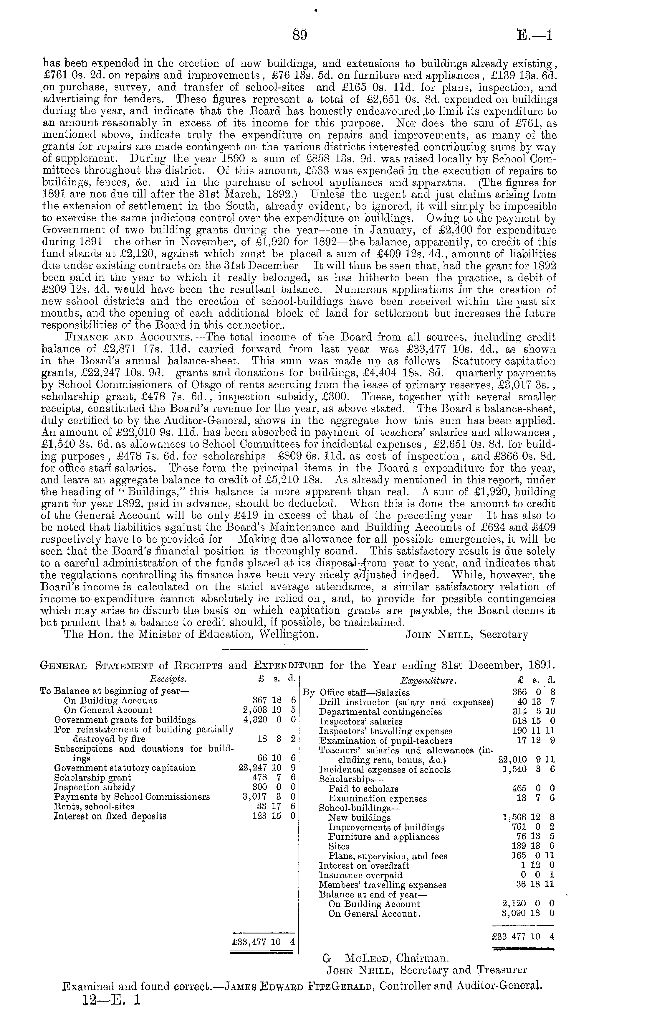 has been expended in the erection of new buildings, and extensions to buildings already existing, £761 Os. 2d. on repairs and improvements, £76 13s. sd. on furniture and appliances , £139 13s. 6d. on purchase, survey, and transfer of school-sites and £165 Os. lid. for plans, inspection, and advertising for tenders. These figures represent a total of £2,651 Os. Bd. expended on buildings during the year, and indicate that the Board has honestly endeavoured .to limit its expenditure to an amount reasonably in excess of its income for this purpose. Nor does the sum of £761, as mentioned above, indicate truly the expenditure on repairs and improvements, as many of the grants for repairs are made contingent on the various districts interested contributing sums by way of supplement. During the year 1890 a sum of £858 13s. 9d. was raised locally by School Committees throughout the district. Of this amount, £533 was expended in the execution of repairs to buildings, fences, &c. and in the purchase of school appliances and apparatus. (The figures for 1891 are not due till after the 31st March, 1892.) Unless the urgent and just claims arising from the extension of settlement in the South, already evident,' be ignored, it will simply be impossible to exercise the same judicious control over the expenditure on buildings. Owing to the payment by Government of two building grants during the year—one in January, of £2,400 for expenditure during 1891 the other in November, of £1,920 for 1892—the balance, apparently, to credit of this fund stands at £2,120, against which must be placed a sum of £409 12s. 4d., amount of liabilities due under existing contracts on the 31st December It will thus be seen that, had the grant for 1892 been paid in the year to which it really belonged, as has hitherto been the practice, a debit of £209 12s. 4d. would have been the resultant balance. Numerous applications for the creation of new school districts and the erection of school-buildings have been received within the past six months, and the opening of each additional block of land for settlement but increases the future responsibilities of the Board in this connection. Finance and Accounts.—The total income of the Board from all sources, including credit balance of £2,871 17s. lid. carried forward from last year was £33,477 10s. 4d., as shown in the Board's annual balance-sheet. This sum was made up as follows Statutory capitation grants, £22,247 10s. 9d. grants and donations for buildings, £4,404 18s. Bd. quarterly payments by School Commissioners of Otago of rents accruing from the lease of primary reserves, £3,017 3s. , scholarship grant, £478 7s. 6d., inspection subsidy, £300. These, together with several smaller receipts, constituted the Board's revenue for the year, as above stated. The Board s balance-sheet, duly certified to by the Auditor-General, shows in the aggregate how this sum has been applied. An amount of £22,010 9s. lid. has been absorbed in payment of teachers' salaries and allowances, £1,540 3s. 6d. as allowances to School Committees for incidental expenses, £2,651 os. Bd. for building purposes , £478 7s. 6d. for scholarships £809 6s. lid. as cost of inspection , and £366 os. Bd. for office staff salaries. These form the principal items in the Board s expenditure for the year, and leave an aggregate balance to credit of £5,210 18s. As already mentioned in this report, under the heading of "Buildings," this balance is more apparent than real. A sum of £1,920, building grant for year 1892, paid in advance, should be deducted. When this is done the amount to credit of the General Account will be only £419 in excess of that of the preceding year It has also to be noted that liabilities against the Board's Maintenance and Building Accounts of £624 and £409 respectively have to be provided for Making due allowance for all possible emergencies, it will be seen that the Board's financial position is thoroughly sound. This satisfactory result is due solely to a careful administration of the funds placed at its disposaJ .from year to year, and indicates that the regulations controlling its finance have been very nicely adjusted indeed. While, however, the Board's income is calculated on the strict average attendance, a similar satisfactory relation of income to expenditure cannot absolutely be relied on, and, to provide for possible contingencies which may arise to disturb the basis on which capitation grants are payable, the Board deems it but prudent that a balance to credit should, if possible, be maintained. The Hon. the Minister of Education, Wellington. John Neill, Secretary