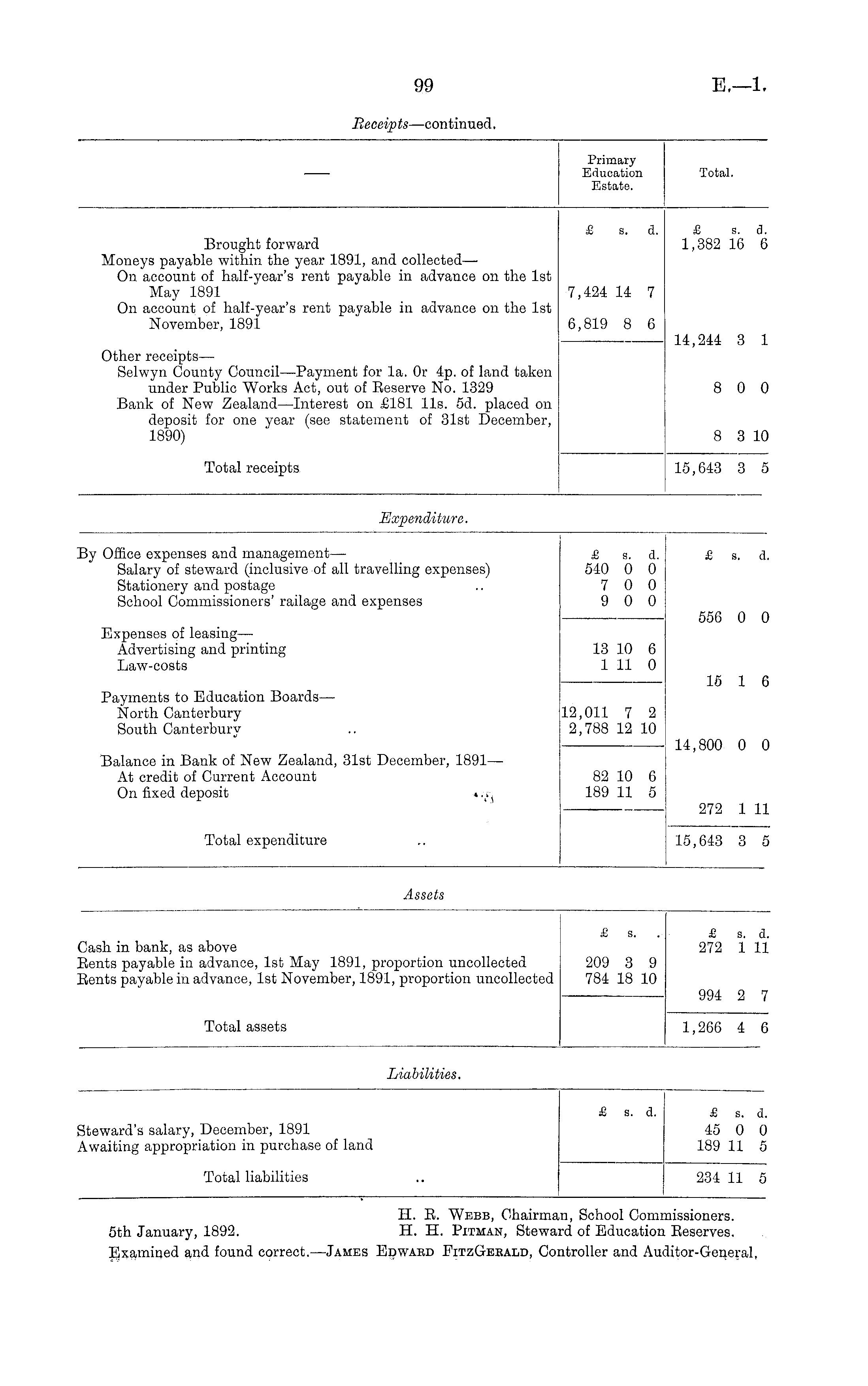 H. E. Webb, Chairman, School Commissioners. sth January, 1892. H. H. Pitman, Steward of Education Eeserves. Examined and found correct. —James Edward PitzGebald, Controller and Auditor-General,