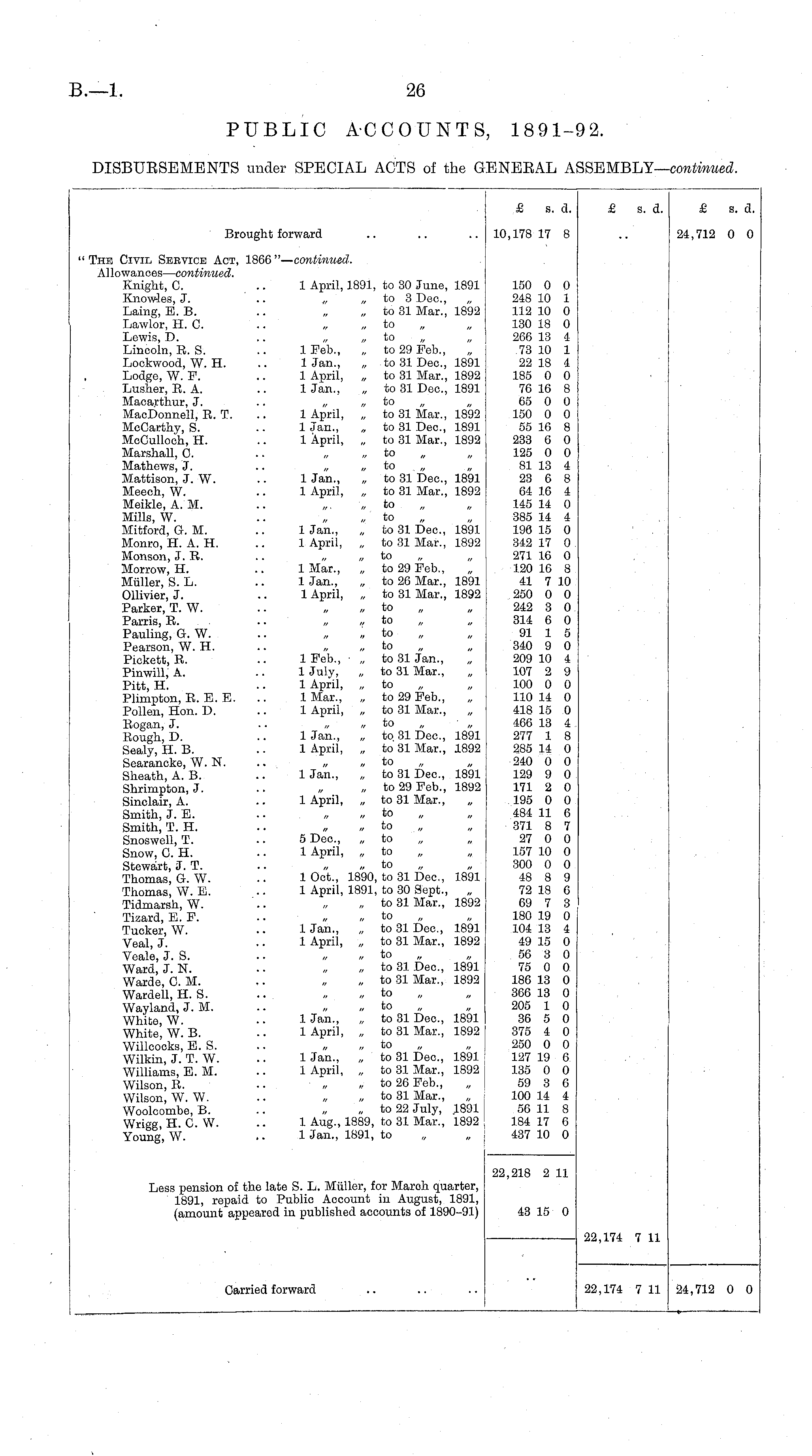 £ s. d. £ s. d. £ s. d. Brought forward 10,178 17 8 24,712 0 0 "The Civil Service Act, 1866"— continued. Allowances— continued. Knight, C. .. 1 April, 1891, to 30 June, 1891 Knowlos, J. .. „ „ to 3 Dec, Laing, E. B. .. „ to 31 Mar., 1892 Lawlor, H. C. .. „ „ to Lewis, D. .. „ „ to „ „ Lincoln, R. S. .. 1 Feb., „ to 29 Feb., Lockwood, W. H. .. 1 Jan., „ to 31 Dec, 1891 Lodge, W. F. .. 1 April, „ to 31 Mar., 1892 Lusher, R. A. .. 1 Jan., „ to 31 Dec, 1891 Macarthur, J. .. „ „ to MacDonnell, R. T. .. 1 April, „ to 31 Mar., 1892 McCarthy, S. .. 1 Jan., „ to 31 Dec, 1891 McCulloch, H. .. 1 April, „ to 31 Mar., 1892 Marshall, C. .. „ „ to Mathews, J. .. „ to „ Mattison, J. W. .. 1 Jan., „ to 31 Dec, 1891 Meech, W. .. 1 April, „ to 31 Mar., 1892 Meikle, A. M. .. „. „ to Mills, W. .. „ „ to Mitford, G. M. .. 1 Jan., „ to 31 Dec, 1891 Monro, H. A. H. .. 1 April, „ to 31 Mar., 1892 Monson, J. R. .. „ „ to Morrow, H. .. 1 Mar., „ to 29 Feb., Miiller, S. L. .. 1 Jan., „ to 26 Mar., 1891 Ollivier, J. .. 1 April, „ to 31 Mar., 1892 Parker, T. W. .. „ „ to Parris, R. . .. „ „ to Pauling, G. W. .. „ „ to Pearson, W. H. .. „ „ to Pickett, R. .. 1 Feb., „ to 31 Jan., Pinwill, A. .. 1 July, „ to 31 Mar., Pitt, H. .. 1 April, „ to Plimpton, R. E. E. .. 1 Mar., „ to 29 Feb., Pollen, Hon. D. .. 1 April, „ to 31 Mar., „ Rogan, J. .. „ „ to „ „ Rough, D. .. 1 Jan., „ to 31 Dec, 1891 Sealy, H. B. .. 1 April, „ to 31 Mar., 1892 Searancke, W.N. .. „ „ to Sheath, A. B. .. 1 Jan., „ to 31 Dec, 1891 Shrimpton, J. .. „ „ to 29 Feb., 1892 Sinclair, A. .. 1 April, „ to 31 Mar., Smith, J. E. .. . „ „ to Smith, T. H. .. „ „ to Snoswell, T. .. 5 Doc, „ to Snow, C. H. .. 1 April, „ to Stewart, J. T. .. „ „ to Thomas, G. W. .. 1 Oct., 1890, to 31 Dec, 1891 Thomas, W. E. .. 1 April, 1891, to 30 Sept., Tidmarsh, W. .. „ „ to 31 Mar., 1892 Tizard, E.F. .. „ to Tucker, W. .. 1 Jan., „ to 31 Dec, 1891 Veal, J. .. 1 April, „ to 31 Mar., 1892 Veale, J. S. .. „ „ to Ward, J. N. .. „ „ to 31 Dec, 1891 Warde, C. M. .. ,, to 31 Mar., 1892 Wardell, H. S. .. „ „ to Wayland, J. M. .. „ to White, W. •• 1 Jan., „ to 31 Dec, 1891 White! W. B. .. 1 April, „ to 31 Mar., 1892 Willcocks, E. S. .. „ „ to Wilkin, J. T. W. .. 1 Jan., „ to 31 Dec, 1891 Williams, E. M. .. 1 April, „ to 31 Mar., 1892 Wilson, R. .. ,i ,, to 26 Feb., Wilson, W. W. .. „ „ to 31 Mar., Woolcombe, B. .. „ „ to 22 July, 1891 Wrigg, H. C. W. .. 1 Aug., 1889, to 31 Mar., 1892 Young, W. .. 1 Jan., 1891, to 150 0 0 248 10 1 112 10 0 130 18 0 266 13 4 73 10 1 22 18 4 185 0 0 76 16 8 65 0 0 150 0 0 55 16 8 233 6 0 125 0 0 81 13 4 23 6 8 64 16 4 145 14 0 385 14 4 196 15 0 342 17 0 271 16 0 120 16 8 41 7 10 250 0 0 242 3 0 314 6 0 91 1 5 340 9 0 209 10 4 107 2 9 100 0 0 110 14 0 418 15 0 466 13 4 277 1 8 285 14 0 240 0 0 129 9 0 171 2 0 195 0 0 484 11 6 371 8 7 27 0 0 157 10 0 300 0 0 48 8 9 72 18 6 69 7 3 180 19 0 104 13 4 49 15 0 56 3 0 75 0 0 186 13 0 366 13 0 205 1 0 36 5 0 375 4 0 250 0 0 127 19 6 135 0 0 59 3 6 100 14 4 56 11 8 184 17 6 437 10 0 Less pension of the late S. L. Miiller, for Maroh quarter, 1891, repaid to Public Account in August, 1891, (amount appeared in published accounts of 1890-91) 22,218 2 11 43 15 0 22,174 7 11 Carried forward 22,174 7 11 24,712 0 0