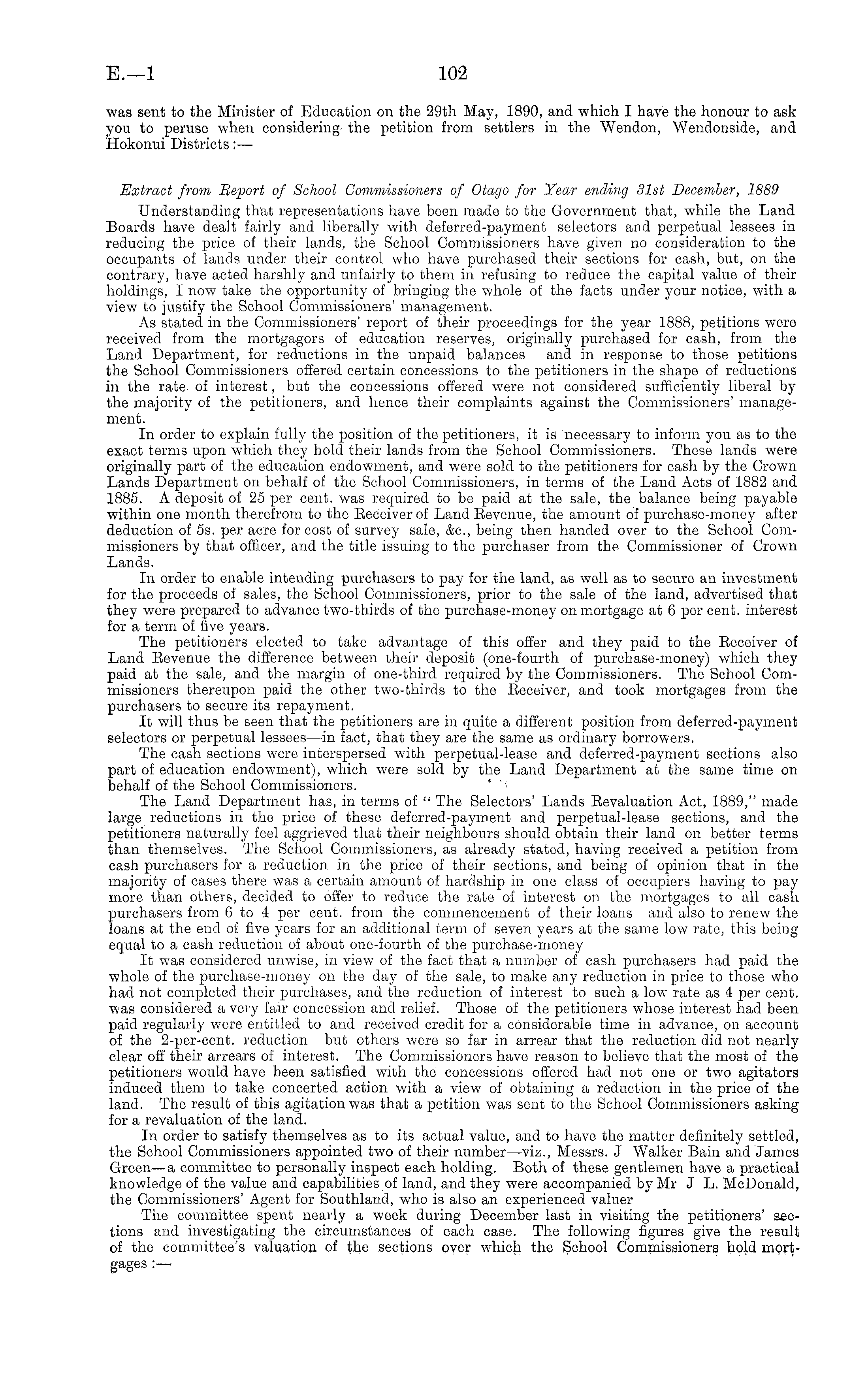 was sent to the Minister of Education on the 29th May, 1890, and which I have the honour to ask you to peruse when considering the petition from settlers in the Wendon, Wendonside, and Hokonui Districts :—■ Extract from Beport of School Commissioners of Otago for Year ending 31st December, 1889 Understanding that representations have been made to the Government that, while the Land Boards have dealt fairly and liberally with deferred-payment selectors and perpetual lessees in reducing the price of their lands, the School Commissioners have given no consideration to the occupants of lands under their control who have purchased their sections for cash, but, on the contrary, have acted harshly and unfairly to them in refusing to reduce the capital value of their holdings, I now take the opportunity of bringing the whole of the facts under your notice, with a view to justify the School Commissioners' management. As stated in the Commissioners' report of their proceedings for the year 1888, petitions were received from the mortgagors of education reserves, originally purchased for cash, from the Land Department, for reductions in the unpaid balances and. in response to those petitions the School Commissioners offered certain concessions to the petitioners in the shape of reductions in the rate, of interest, but the concessions offered were not considered sufficiently liberal by the majority of the petitioners, and hence their complaints against the Commissioners' management. In order to explain fully the position of the petitioners, it is necessary to inform you as to the exact terms upon which they hold their lands from the School Commissioners. These lands were originally part of the education endowment, and were sold to the petitioners for cash by the Crown Lands Department on behalf of the School Commissioners, in terms of the Land Acts of 1882 and 1885. A deposit of 25 per cent, was required to be paid at the sale, the balance being payable within one month therefrom to the Eeceiver of Land Eevenue, the amount of purchase-money after deduction of ss. per acre for cost of survey sale, &c, being then handed over to the School Commissioners by that officer, and the title issuing to the purchaser from the Commissioner of Crown Lands. In order to enable intending purchasers to pay for the land, as well as to secure an investment for the proceeds of sales, the School Commissioners, prior to the sale of the land, advertised that they were prepared to advance two-thirds of the purchase-money on mortgage at 6 per cent, interest for a term of five years. The petitioners elected to take advantage of this offer and they paid to the Eeceiver of Land Eevenue the difference between their deposit (one-fourth of purchase-money) which they paid at the sale, and the margin of one-third required by the Commissioners. The School Commissioners thereupon paid the other two-thirds to the Eeceiver, and took mortgages from the purchasers to secure its repayment. It will thus be seen that the petitioners are in quite a different position from deferred-payment selectors or perpetual lessees —in fact, that they are the same as ordinary borrowers. The cash sections were interspersed with perpetual-lease and deferred-payment sections also part of education endowment), which were sold by the Land Department at the same time on behalf of the School Commissioners. The Land Department has, in terms of " The Selectors' Lands Eevaluation Act, 1889," made large reductions in the price of those deferred-payment and perpetual-lease sections, and the petitioners naturally feel aggrieved that their neighbours should obtain their land on better terms than themselves. The School Commissioners, as already stated, having received a petition from cash purchasers for a reduction in the price of their sections, and being of opinion that in the majority of cases there was a certain amount of hardship in one class of occupiers having to pay more than others, decided to offer to reduce the rate of interest on the mortgages to all cash purchasers from 6to 4 per cent, from the commencement of their loans and also to renew the loans at the end of five years for an additional term of seven years at the same low rate, this being equal to a cash reduction of about one-fourth of the purchase-money It was considered unwise, in view of the fact that a number of cash purchasers had paid the whole of the purchase-money on the day of the sale, to make any reduction in price to those who had not completed their purchases, and the reduction of interest to such a low rate as 4 per cent, was considered a very fair concession and relief. Those of the petitioners whose interest had been paid regularly were entitled to and received credit for a considerable time in advance, on account of the 2-per-cent. reduction but others were so far in arrear that the reduction did not nearly clear off their arrears of interest. The Commissioners have reason to believe that the most of the petitioners would have been satisfied with the concessions offered had not one or two agitators induced them to take concerted action with a view of obtaining a reduction in the price of the land. The result of this agitation was that a petition was sent to the School Commissioners asking for a revaluation of the land. In order to satisfy themselves as to its actual value, and to have the matter definitely settled, the School Commissioners appointed two of their number—viz., Messrs. J Walker Bain and James Green —a committee to personally inspect each holding. Both of these gentlemen have a practical knowledge of the value and capabilities of land, and they were accompanied by Mr J L. McDonald, the Commissioners' Agent for Southland, who is also an experienced valuer The committee spent nearly a week during December last in visiting the petitioners' sections and investigating the circumstances of each case. The following figures give the result of the committee's valuation of
