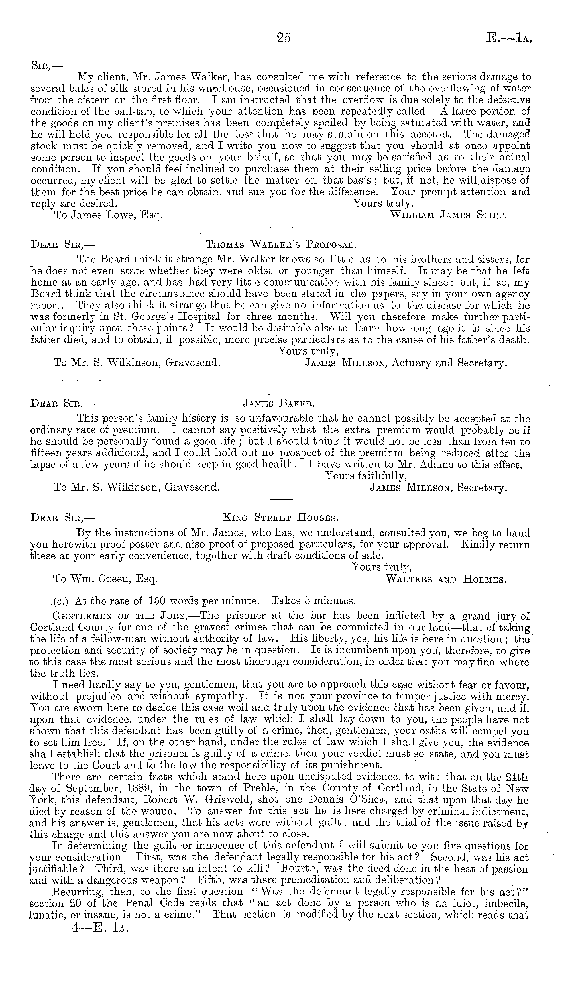 (c.) At the rate of 150 words per minute. Takes 5 minutes. Gentlemen of the Jtjby,—The prisoner at the bar has been indicted by a grand jury of Cortland County for one of the gravest crimes that can be committed in our land—that of taking the life of a fellow-man without authority of law. His liberty, yes, his life is here in question ; the protection and security of society may be in question. It is incumbent upon you, therefore, to give to this case the most serious and the most thorough consideration,, in order that you may find where the truth lies. I need hardly say to you, gentlemen, that you are to approach this case without fear or favour, without prejudice and without sympathy.- It is not your province to temper justice with mercy. You are sworn here to decide this case well and truly upon the evidence that has been given, and if, upon that evidence, under the rules of law which I shall lay down to you, the people have not shown that this defendant has been guilty of a crime, then, gentlemen, your oaths will compel you to set him free. If, on the other hand, under the rules of law which I shall give you, the evidence shall establish that the prisoner is guilty of a crime, then your verdict must so state, and you must leave to the Court and to the law the responsibility of its punishment. There are certain facts which stand here upon undisputed evidence, to wit: that on the 24th day of September, 1889, in the town of Preble, in the County of Cortland, in the State of New York, this defendant, Eobert W. Griswold, shot one Dennis O'Shea, and that upon that day he died by reason of the wound. To answer for this act he is here charged by criminal indictment, and his answer is, gentlemen, that his acts were without guilt; and the trial of the issue raised by this charge and this answer you are now about to close. In determining the guilt or innocence of this defendant I will submit to you five questions for your consideration. First, was the defendant legally responsible for his act? Second, was his act justifiable? Third, was there an intent to kill? Fourth, was the deed done in the heat of passion and with a dangerous weapon ? Fifth, was there premeditation and deliberation ? Eecurring, then, to the first question, "Was the defendant legally responsible for his act?" section 20 of the Penal Code reads that " an act done by a person who is an idiot, imbecile, lunatic, or insane, is not a crime." That section is modified by the next section, which reads that 4—E. lα.