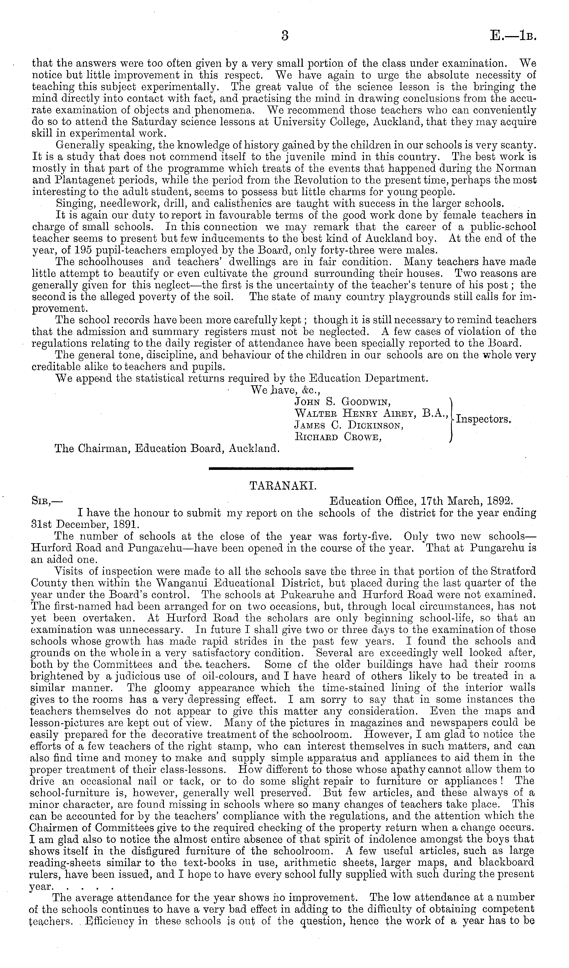 TAEANAKI. Sib,— Education Office, 17th March, 1892. I have the honour to submit my report on the schools of the district for the year ending 31st December, 1891. The number of schools at the close of the year was forty-five. Only two new schools— Hurford Eoad and Pungaiehu—have been opened in the course of the year. That at Pungarehu is an aided one. Visits of inspection were made to all the schools save the three in that portion of the Stratford County then within the Wanganui Educational District, but placed during the last quarter of the year under the Board's control. The schools at Pukearuhe and Hurford Eoad were not examined. The first-named had been arranged for on two occasions, but, through local circumstances, has not yet been overtaken. At Hurford Eoad the scholars are only beginning school-life, so that an examination was unnecessary. In future I shall give two or three days to the examination of those schools whose growth has made rapid strides in the past few years. I found the schools and grounds on the whole in a very satisfactory condition. Several are exceedingly well looked after, both by the Committees and the, teachers. Some cf the older buildings have had their rooms brightened by a judicious use of oil-colours, and I have heard of others likely to be treated in a similar manner. The gloomy appeara/nce which the time-stained lining of the interior walls gives to the rooms has a very depressing effect. I am sorry to say that in some instances the teachers themselves do not appear to give this matter any consideration. Even the maps and lesson-pictures are kept out of view. Many of the pictures in magazines and newspapers could be easily prepared for the decorative treatment of the schoolroom. However, lam glad to notice the efforts of a few teachers of the right stamp, who can interest themselves in such matters, and can also find time and money to make and supply simple apparatus and appliances to aid them in the proper treatment of their class-lessons. Plow different to those whose apathy cannot allow them to drive an occasional nail or tack, or to do some slight repair to furniture or appliances ! The school-furniture is, however, generally well preserved. But few articles, and these always of a minor character, are found missing in schools where so many changes of teachers take place. This can be accounted for by the teachers' compliance with the regulations, and the attention which the Chairmen of Committees give to the required checking of the property return when a change occurs. I am glad also to notice the almost entire absence of that spirit of indolence amongst the boys that shows itself in the disfigured furniture of the schoolroom. A few useful articles, such as large reading-sheets similar to the text-books in use, arithmetic sheets, larger maps, and blackboard rulers, have been issued, and I hope to have every school fully supplied with such during the present year The average attendance for the year shows ho improvement. The low attendance at a number of the schools continues to have a very bad effect in adding to the difficulty of obtaining competent teachers. Efficiency in these schools is ouf of the question, hence the work of a year has to be