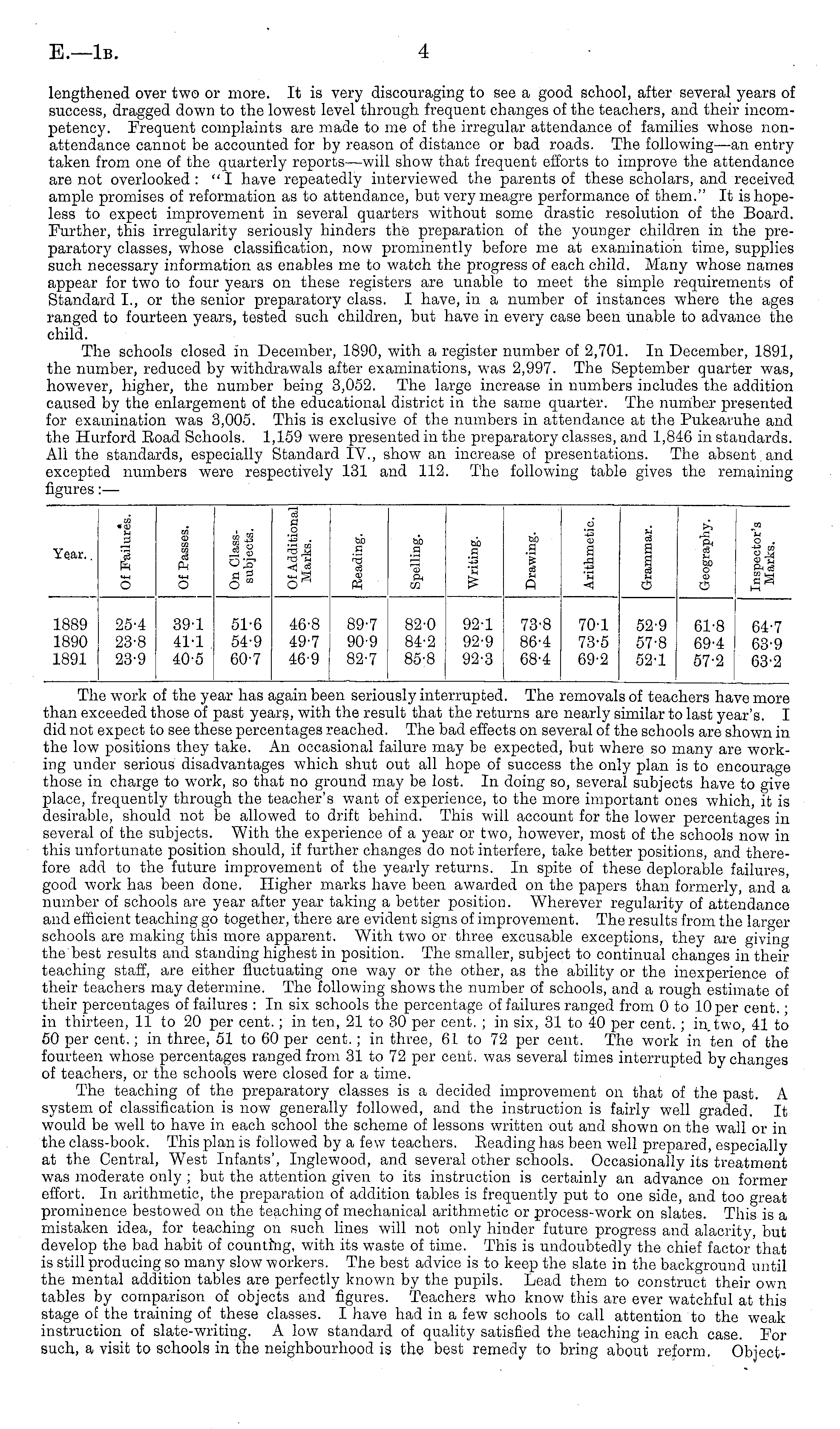 lengthened over two or more. It is very discouraging to see a good school, after several years of success, dragged down to the lowest level through frequent changes of the teachers, and their incompetency. Frequent complaints are made to me of the irregular attendance of families whose nonattendance cannot be accounted for by reason of distance or bad roads. The following—an entry taken from one of the quarterly reports —will show that frequent efforts to improve the attendance are not overlooked: "I have repeatedly interviewed the parents of these scholars, and received ample promises of reformation as to attendance, but very meagre performance of them." It is hopeless to expect improvement in several quarters without some drastic resolution of the Board. Further, this irregularity seriously hinders the preparation of the younger children in the preparatory classes, whose classification, now prominently before me at examination time, supplies such necessary information as enables me to watch the progress of each child. Many whose names appear for two to four years on these registers are unable to meet the simple requirements of Standard 1., or the senior preparatory class. I have, in a number of instances where the ages ranged to fourteen years, tested such children, but have in every case been unable to advance the child. The schools closed in December, 1890, with a register number of 2,701. In December, 1891, the number, reduced by withdrawals after examinations, was 2,997. The September quarter was, however, higher, the number being 3,052. The large increase in numbers includes the addition caused by the enlargement of the educational district in the same quarter. The number presented for examination was 3,005. This is exclusive of the numbers in attendance at the Pukearuhe and the Hurford Eoad Schools. 1,159 were presented in the preparatory classes, and 1,846 in standards. All the standards, especially Standard IV., show an increase of presentations. The absent, and excepted numbers were respectively 131 and 112. The following table gives the remaining figures:—