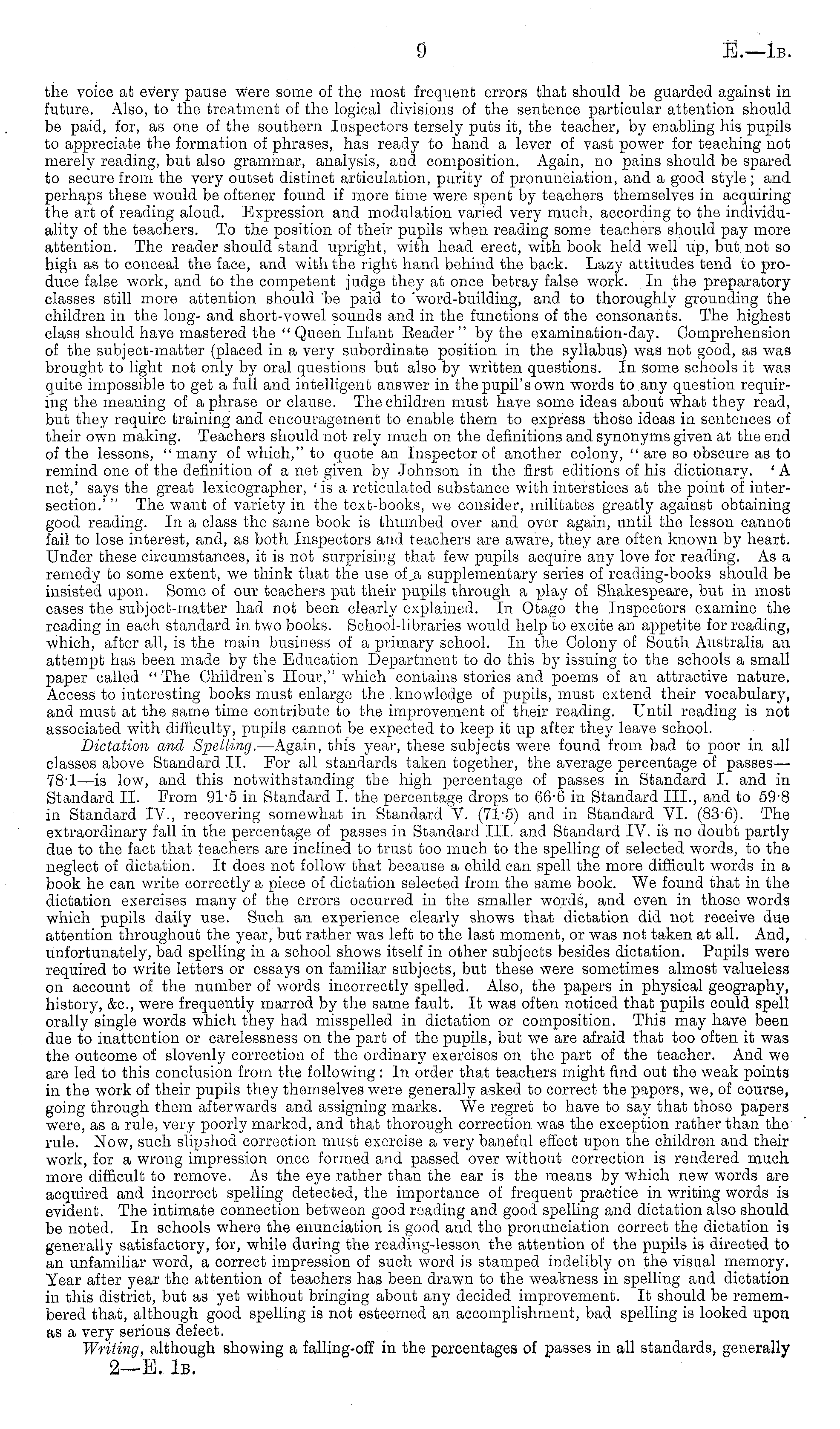 the voice at every paiise were some of the most frequent errors that should be guarded against in future. Also, to the treatment of the logical divisions of the sentence particular attention should be paid, for, as one of the southern Inspectors tersely puts it, the teacher, by enabling his pupils to appreciate the formation of phrases, has ready to hand a lever of vast power for teaching not merely reading, but also grammar, analysis, and composition. Again, no pains should be spared to secure from the very outset distinct articulation, purity of pronunciation, and a good style; and perhaps these would be oftener found if more time were spent by teachers themselves in acquiring the art of reading aloud. Expression and modulation varied very much, according to the individuality of the teachers. To the position of their pupils when reading some teachers should pay more attention. The reader should stand upright, with head erect, with book held well up, but not so high as to conceal the face, and with the right hand behind the back. Lazy attitudes tend to produce false work, and to the competent judge they at once betray false work. In the preparatory classes still more attention should 'be paid to 'word-building, and to thoroughly grounding the children in the long- and short-vowel sounds and in the functions of the consonants. The highest class should have mastered the " Queen Infant Eeader" by the examination-day. Comprehension of the subject-matter (placed in a very subordinate position in the syllabus) was not good, as was brought to light not only by oral questions but also by written questions. In some schools it was quite impossible to get a full and intelligent answer in the pupil's own words to any question requiring the meaning of a phrase or clause. The children must have some ideas about what they read, but they require training and encouragement to enable them to express those ideas in sentences of their own making. Teachers should not rely much on the definitions and synonyms given at the end of the lessons, "many of which," to quote an Inspector oE another colony, " are so obscure as to remind one of the definition of a net given by Johnson in the first editions of his dictionary. ' A net,' says the great lexicographer, 'is a reticulated substance with interstices at the point of intersection.' " The want of variety in the text-books, we consider, militates greatly against obtaining good reading. In a class the same book is thumbed over and over again, until the lesson cannot fail to lose interest, and, as both Inspectors and teachers are aware, they are often known by heart. Under these circumstances, it is not surprising that few pupils acquire any love for reading. As a remedy to some extent, we think that the use of .a supplementary series of reading-books should be insisted upon. Some of our teachers put their pupils through a play of Shakespeare, but in most cases the subject-matter had not been clearly explained. In Otago the Inspectors examine the reading in each standard in two books. School-libraries would help to excite an appetite for reading, which, after all, is the main business of a primary school. In the Colony of South Australia an attempt has been made by the Education Department to do this by issuing to the schools a small paper called "The Children's Hour," which contains stories and poems of an attractive nature. Access to interesting books must enlarge the knowledge of pupils, must extend their vocabulary, and must at the same time contribute to the improvement of their reading. Until reading is not associated with difficulty, pupils cannot be expected to keep it up after they leave school. Dictation and Spelling. —Again, this year, these subjects were found from bad to poor in all classes above Standard 11. For all standards taken together, the average percentage of passes— 78-1 —is low, and this notwithstanding the high percentage of passes in Standard I. and in Standard 11. Erom 91"5 in Standard I. the percentage drops to 666 in Standard 111., and to 598 in Standard IV., recovering somewhat in Standard V. (71"5) and in Standard VI. (836). The extraordinary fall in the percentage of passes in Standard 111. and Standard IV. is no doubt partly due to the fact that teachers are inclined to trust too much to the spelling of selected words, to the neglect of dictation. It does not follow that because a child can spell the more difficult words in a book he can write correctly a piece of dictation selected from the same book. We found that in the dictation exercises many of the errors occurred in the smaller words, and even in those words which pupils daily use. Such an experience clearly shows that dictation did not receive due attention throughout the year, but rather was left to the last moment, or was not taken at all. And, unfortunately, bad spelling in a school shows itself in other subjects besides dictation. Pupils were required to write letters or essays on familiar subjects, but these were sometimes almost valueless on account of the number of words incorrectly spelled. Also, the papers in physical geography, history, &c, were frequently marred by the same fault. It was often noticed that pupils could spell orally single words which they had misspelled in dictation or composition. This may have been due to inattention or carelessness on the part of the pupils, but we are afraid that too often it was the outcome of slovenly correction of the ordinary exercises on the part of the teacher. And we are led to this conclusion from the following: In order that teachers might find out the weak points in the work of their pupils they themselves were generally asked to correct the papers, we, of course, going through them afterwards and assigning marks. We regret to have to say that those papers were, as a rule, very poorly marked, and that thorough correction was the exception rather than the rule. Now, such slipshod correction must exercise a very 
