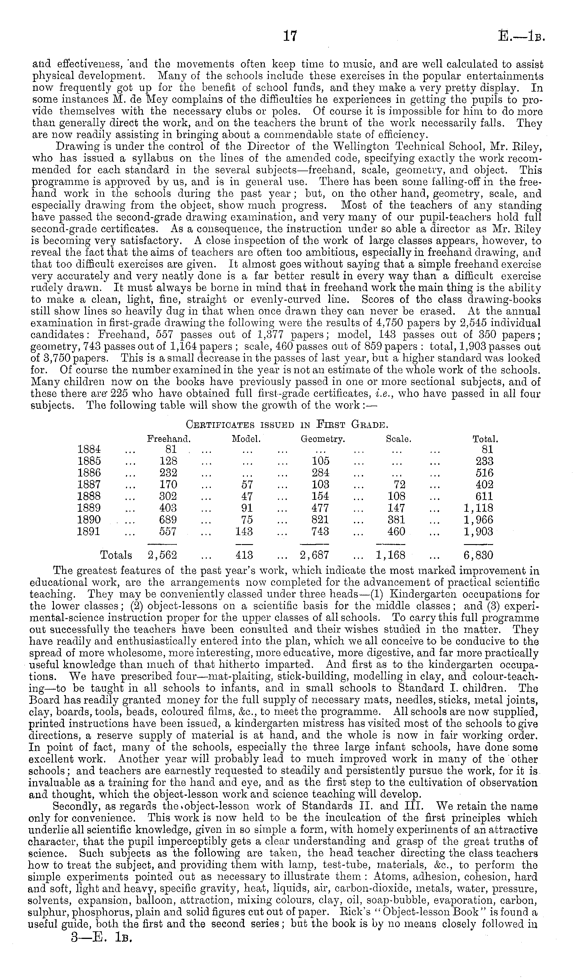 and effectiveness, 'and the movements often keep time to music, and are well calculated to assist physical development. Many of the schools include these exercises in the popular entertainments now frequently got up for the benefit of school funds, and they make a very pretty display. In some instances M. de Mey complains of the difficulties he experiences in getting the pupils to provide themselves with the necessary clubs or poles. Of course it is impossible for him to do more than generally direct the work, and on the teachers the brunt of the work necessarily falls. They are now readily assisting in bringing about a commendable state of efficiency. Drawing is under the control of the Director of the Wellington Technical School, Mr. Eiley, who has issued a syllabus on the lines of the amended code, specifying exactly the work recommended for each standard in the several subjects—freehand, scale, geometry, and object. This programme is approved by us, and is in general use. There has been some falling-off in the freehand work in the schools during the past year ; but, on the other hand, geometry, scale, and especially drawing from the object, show much progress. Most of the teachers of any standing have passed the second-grade drawing examination, and very many of our pupil-teachers hold full second-grade certificates. As a consequence, the instruction under so able a director as Mr. Riley is becoming very satisfactory. A close inspection of the work of large classes appears, however, to reveal the fact that the aims of teachers are often too ambitious, especially in freehand drawing, and that too difficult exercises are given. It almost goes without saying that a simple freehand exercise very accurately and very neatly done is a far better result in every way than a difficult exercise rudely drawn. It must always be borne in mind that in freehand work the main thing is the ability to make a clean, light, fine, straight or evenly-curved line. Scores of the class drawing-books still show lines so heavily dug in that when once drawn they can never be erased. At the annual examination in first-grade drawing the following were the results of 4,750 papers by 2,545 individual candidates: Freehand, 557 passes out of 1,377 papers; model, 143 passes out of 350 papers; geometry, 743 passes out of 1,164 papers ; scale, 460 passes out of 859 papers : total, 1,903 passes out of 3,750 papers. This is a small decrease in the passes of last year, but a higher standard was looked for. Of course the number examined in the year is not an estimate of the whole work of the schools. Many children now on the books have previously passed in one or more sectional subjects, and of these there are- 225 who have obtained full first-grade certificates, i.e., who have passed in all four subjects. The following table will show the growth of the w T ork: — Certificates issued in First Geade. Freehand. Model. Geometry. Scale. Total. 1884 ... 81 81 1885 ... 128 105 233 1886 ... 232 284 516 1887 ... 170 ... 57 ... 103 ... 72 ... 402 1888 ... 302 ... 47 ... 154 ... 108 ... 611 1889 ... 403 ... 91 ... 477 ... 147 ... 1,118 1890 ... 689 ... 75 ... 821 ... 381 ... 1,966 1891 ... 557 ... 143 ... 743 ... 460 ... 1,903 Totals 2,562 ... 413 ... 2,687 ... 1,168 ... 6,830 The greatest features of the past year's work, which indicate the most marked improvement in educational work, are the arrangements now completed for the advancement of practical scientific teaching. They may be conveniently classed under three heads—(l) Kindergarten occupations for the lower classes; (2) object-lessons on a scientific basis for the middle classes; and (3) experi-mental-science instruction proper for the upper classes of all schools. To carry this full programme out successfully the teachers have been consulted and their wishes studied in the matter. They have readily and enthusiastically entered into the plan, which we all conceive to be conducive to the spread of more wholesome, more interesting, more educative, more digestive, and far more practically useful knowledge than much of that hitherto imparted. And first as to the kindergarten occupations. We have prescribed four—mat-plaiting, stick-building, modelling in clay, and colour-teach-ing—to be taught in all schools to infants, and in small schools to Standard I. children. The Board has readily granted money for the full supply of necessary mats, needles, sticks, metal joints, clay, boards, tools, beads, coloured films, &c, to meet the programme. All schools are now supplied, printed instructions have been issued, a kindergarten mistress has visited most of the schools to give directions, a reserve supply of material is at hand, and the whole is now in fair working order. In point of fact, many of the schools, especially the three large infant schools, have done some excellent work. Another year will probably lead to much improved work in many of the other schools; and teachers are earnestly requested to steadily and persistently pursue the work, for it is invaluable as a training for the hand and eye, and as the first step to the cultivation of observation and thought, which the object-lesson work and science teaching will develop. Secondly, as regards the.object-lesson work of Standards 11. and 111. We retain the name only for convenience. This work is now held to be the inculcation of the first principles which underlie all scientific knowledge, given in so simple a form, with homely experiments of an attractive character, that the pupil imperceptibly gets a clear understanding and grasp of the great truths of science. Such subjects as the following are taken, the head teacher directing the class teachers how to treat the subject, and providing them with lamp, test-tube, materials, &c, to perform the simple experiments pointed out as necessary to illustrate them : Atoms, adhesion, cohesion, hard and soft, light and heavy, specific gravity, heat, liquids, air, carbon-dioxide, m