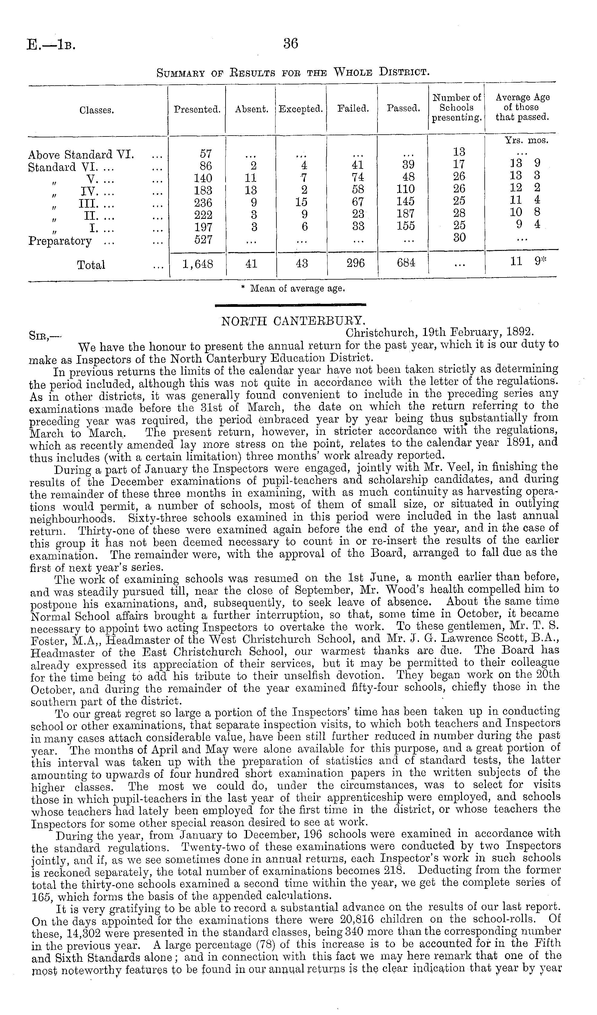 NOETH CANTEEBUEY. Sib,— Christchurch, 19th February, 1892. We have the honour to present the annual return for the past year, which it is our duty to make as Inspectors of the North Canterbury Education District. In previous returns the limits of the calendar year have not been taken strictly as determining the period included, although this was not quite in accordance with the letter of the regulations. As in other districts, it was generally found convenient to include in the preceding series any examinations made before the 31st of March, the date on which the return referring to the preceding year was required, the period embraced year by year being thus substantially from March to March. The present return, however, in stricter accordance with the regulations, which as recently amended lay more stress on the point, relates to the calendar year 1891, and thus includes (with a certain limitation) three months' work already reported. During a part of January the Inspectors were engaged, jointly with Mr. Veel, in finishing the results of the December examinations of pupil-teachers and scholarship candidates, and during the remainder of these three months in examining, with as much continuity as harvesting operations would permit, a number of schools, most of them of small size, or situated in outlying neighbourhoods. Sixty-three schools examined in this period were included in the last annual return. Thirty-one of these were examined again before the end of the year, and in the case of this group it has not been deemed necessary to count in or re-insert the results of the earlier examination. The remainder were, with the approval of the Board, arranged to fall due as the first of next year's series. The work of examining schools was resumed on the Ist June, a month earlier than before, and was steadily pursued till, near the close of September, Mr. Wood's health compelled him to postpone his examinations, and, subsequently, to seek leave of absence. About the same time Normal School affairs brought a further interruption, so that, some time in October, it became necessary to appoint two acting Inspectors to overtake the work. To these gentlemen, Mr. T. S. Foster, M.A„ Headmaster of the West Christchurch School, and Mr. J. G. Lawrence Scott, 8.A., Headmaster of the East Christchurch School, our warmest thanks are due. The Board has already expressed its appreciation of their services, but it may be permitted to their colleague for the time being to add his tribute to their unselfish devotion. They began work on the 20th October, and during the remainder of the year examined fifty-four schools, chiefly those in the southern part of the district. To our great regret so large a portion of the Inspectors' time has been taken up in conducting school or other examinations, that separate inspection visits, to which both teachers and Inspectors in many cases attach considerable value, have been still further reduced in number during the past year. The months of April and May were alone available for this purpose, and a great portion of this interval was taken up with the preparation of statistics and of standard tests, the latter amounting to upwards of four hundred short examination papers in the written subjects of the higher classes. The most we could do, under the circumstances, was to select for visits those in which pupil-teachers in the last year of their apprenticeship were employed, and schools whose teachers had lately been employed for the first time in the district, or whose teachers the Inspectors for some other special reason desired to see at work. During the year, from January to December, 196 schools were examined in accordance with the standard regulations. Twenty-two of these examinations were conducted by two Inspectors jointly, and if, as we see sometimes done in annual returns, each Inspector's work in such schools is reckoned separately, the total number of examinations becomes 218. Deducting from the former total the thirty-one schools examined a second time within the year, we get the complete series of 165, which forms the basis of the appended calculations. It is very gratifying to be able to record a substantial advance on the results of our last report. On the days "appointed for the examinations there were 20,816 children on the school-rolls. Of these, 14,302 were presented in the standard classes, being 340 more than the corresponding number in the previous year. A large percentage (78) of this increase is to be accounted for in the Fifth and Sixth Standards alone; and in connection with this fact we may here remark that one of the most noteworthy features to be found in our annual returns is the clear indication that year by year