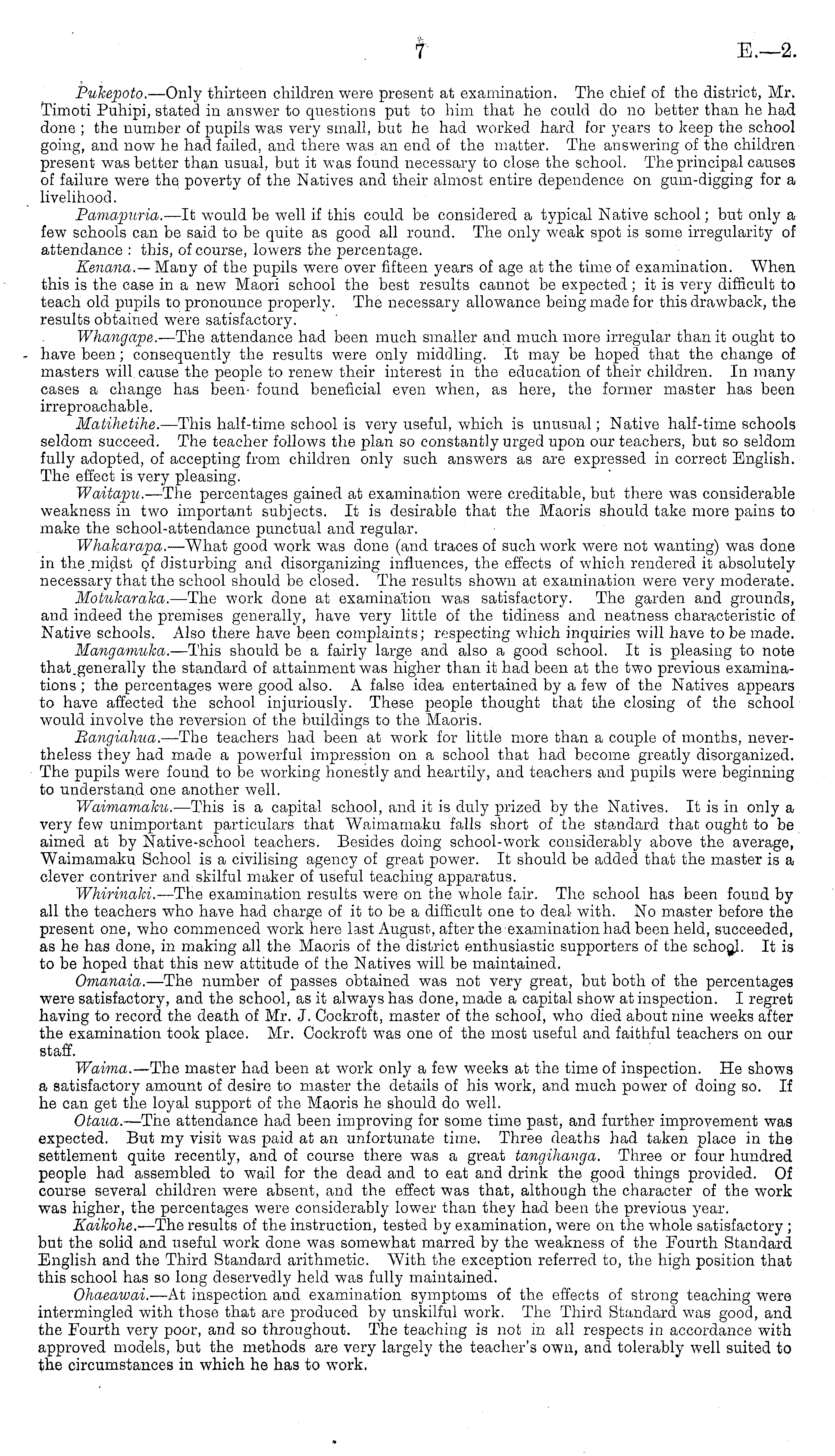 Pukepoto. —Only thirteen children were present at examination. The chief of the district, Mr. Timoti Puhipi, stated in answer to questions put to him that he could do no better than he had done ; the number of pupils was very small, but he had worked hard for years to keep the school going, and now he had failed, and there was an end of the matter. The answering of the children present was better than usual, but it was found necessary to close the school. The principal causes of failure were the poverty of the Natives and their almost entire dependence on gum-digging for a livelihood. Pamapuria. —lt would be well if this could be considered a typical Native school; but only a few schools can be said to be quite as good all round. The only weak spot is some irregularity of attendance : this, of course, lowers the percentage. Kenana.— Many of the pupils were over fifteen years of age at the time of examination. When this is the case in a new Maori school the best results cannot be expected ; it is very difficult to teach old pupils to pronounce properly. The necessary allowance being made for this drawback, the results obtained were satisfactory. Whangape. —The attendance had been much smaller and much more irregular than it ought to have been; consequently the results were only middling. It may be hoped that the change of masters will cause the people to renew their interest in the education of their children. In many cases a change has been- found beneficial even when, as here, the former master has been irreproachable. Matihetihe. —This half-time school is very useful, which is unusual; Native half-time schools seldom succeed. The teacher follows the plan so constantly urged upon our teachers, but so seldom fully adopted, of accepting from children only such answers as are expressed in correct English. The effect is very pleasing. Waitapu. —The percentages gained at examination were creditable, but there was considerable weakness in two important subjects. It is desirable that the Maoris should take more pains to make the school-attendance punctual and regular. Whakarapa. —What good work was done (and traces of such work were not wanting) was done in the midst of disturbing and disorganizing influences, the effects of which rendered it absolutely necessary that the school should be closed. The results shown at examination were very moderate. Motukaraka. —The work done at examination was satisfactory. The garden and grounds, and indeed the premises generally, have very little of the tidiness and neatness characteristic of Native schools. Also there have been complaints; respecting which inquiries will have to be made. Mangamuka. —This should be a fairly large and also a good school. It is pleasing to note that.generally the standard of attainment was higher than it had been at the two previous examinations ; the percentages were good also. A false idea entertained by a few of the Natives appears to have affected the school injuriously. These people thought that the closing of the school would involve the reversion of the buildings to the Maoris. Rangiahua. —The teachers had been at work for little more than a couple of months, nevertheless they had made a powerful impression on a school that had become greatly disorganized. The pupils were found to be working honestly and heartily, and teachers and pupils were beginning to understand one another well. Waimamakit. —This is a capital school, and it is duly prized by the Natives. It is in only a very few unimportant particulars that Waimamaku falls short of the standard that ought to be aimed at by Native-school teachers. Besides doing school-work considerably above the average, Waimamaku School is a civilising agency of great power. It should be added that the master is a clever contriver and skilful maker of useful teaching apparatus. Whirinaki. —The examination results were on the whole fair. The school has been found by all the teachers who have had charge of it to bo a difficult one to deal with. No master before the present one, who commenced work here last August, after the examination had been held, succeeded, as he has done, in making all the Maoris of the district enthusiastic supporters of the school. It is to be hoped that this new attitude of the Natives will be maintained. Omanaia. —The number of passes obtained was not very great, but both of the percentages were satisfactory, and the school, as it always has done, made a capital show at inspection. I regret having to record the death of Mr. J. Cockroft, master of the school, who died about nine weeks after the examination took place. Mr. Cockroft was one of the most useful and faithful teachers on our staff. Waima. —The master had been at work only a few weeks at the time of inspection. He shows a satisfactory amount of desire to master the details of his work, and much power of doing so. If he can get the loyal support of the Maoris he should do well. Otaua. —The attendance had been improving for some time past, and further improvement was expected. But my visit was paid at an unfortunate time. Three deaths had taken place in the settlement quite recently, and of course there was a great tangihanga. Three or four hundred people had assembled to wail for the dead and to eat and drink the good things provided. Of course several children were absent, and the effect was that, although the character of the work was higher, the percentages were considerably lower than they had been the previous year. Eaikohe. —The results of the instruction, tested by examination, were on the whole satisfactory ; but the solid and useful work done was somewhat marred by the weakness of the Fourth Standard English and the Third Standard arithmetic. With the exception referred to, the high position that this school has so long deservedly held was fully maintained. Ohaeawai. —At inspection and examination symptoms of the effects of strong teaching were intermingled 