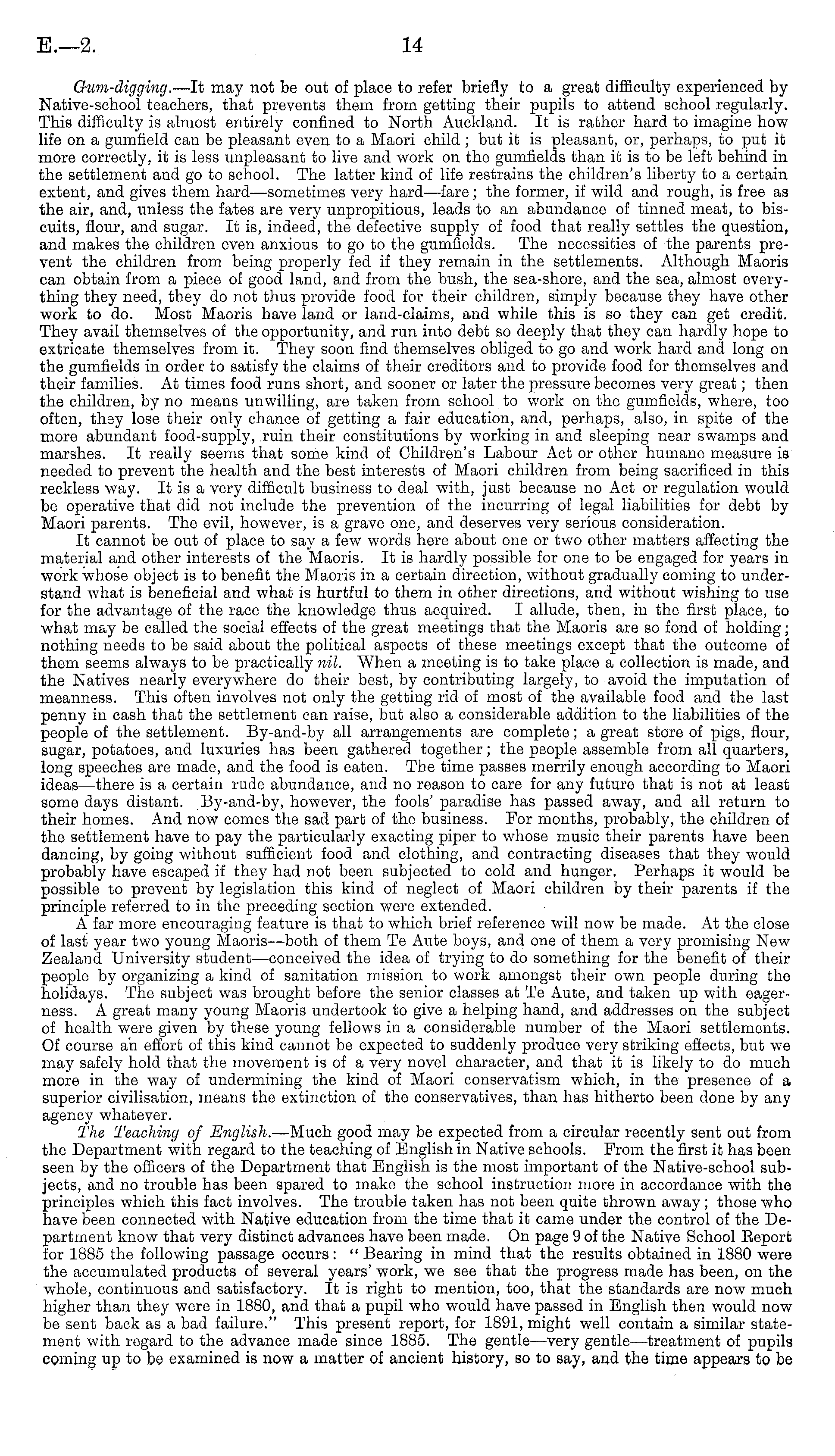 Gum-digging. —lt may not be out of place to refer briefly to a great difficulty experienced by Native-school teachers, that prevents them from getting their pupils to attend school regularly. This difficulty is almost entirely confined to North Auckland. It is rather hard to imagine how life on a gumfield can be pleasant even to a Maori child ; but it is pleasant, or, perhaps, to put it more correctly, it is less unpleasant to live and work on the gumfields than it is to be left behind in the settlement and go to school. The latter kind of life restrains the children's liberty to a certain extent, and gives them hard—sometimes very hard—fare; the former, if wild and rough, is free as the air, and, unless the fates are very unpropitious, leads to an abundance of tinned meat, to biscuits, flour, and sugar. It is, indeed, the defective supply of food that really settles the question, and makes the children even anxious to go to the gumfields. The necessities of the parents prevent the children from being properly fed if they remain in the settlements. Although Maoris can obtain from a piece of good land, and from the bush, the sea-shore, and the sea, almost everything they need, they do not thus provide food for their children, simply because they have other work to do. Most Maoris have land or land-claims, and while this is so they can get credit. They avail themselves of the opportunity, and run into debt so deeply that they can hardly hope to extricate themselves from it. They soon find themselves obliged to go and work hard and long on the gumfields in order to satisfy the claims of their creditors and to provide food for themselves and their families. At times food runs short, and sooner or later the pressure becomes very great; then the children, by no means unwilling, are taken from school to work on the gumfields, where, too often, they lose their only chance of getting a fair education, and, perhaps, also, in spite of the more abundant food-supply, ruin their constitutions by working in and sleeping near swamps and marshes. It really seems that some kind of Children's Labour Act or other humane measure is needed to prevent the health and the best interests of Maori children from being sacrificed in this reckless way. It is a very difficult business to deal with, just because no Act or regulation would be operative that did not include the prevention of the incurring of legal liabilities for debt by Maori parents. The evil, however, is a grave one, and deserves very serious consideration. It cannot be out of place to say a few words here about one or two other matters affecting the material and other interests of the Maoris. It is hardly possible for one to be engaged for years in work whose object is to benefit the Maoris in a certain direction, without gradually coming to understand what is beneficial and what is hurtful to them in other directions, and without wishing to use for the advantage of the race the knowledge thus acquired. I allude, then, in the first place, to what may be called the social effects of the great meetings that the Maoris are so fond of holding; nothing needs to be said about the political aspects of these meetings except that the outcome of them seems always to be practically nil. When a meeting is to take place a collection is made, and the Natives nearly everywhere do their best, by contributing largely, to avoid the imputation of meanness. This often involves not only the getting rid of most of the available food and the last penny in cash that the settlement can raise, but also a considerable addition to the liabilities of the people of the settlement. By-and-by all arrangements are complete; a great store of pigs, flour, sugar, potatoes, and luxuries has been gathered together; the people assemble from all quarters, long speeches are made, and the food is eaten. The time passes merrily enough according to Maori ideas —there is a certain rude abundance, and no reason to care for any future that is not at least some days distant. By-and-by, however, the fools' paradise has passed away, and all return to their homes. And now comes the sad part of the business. For months, probably, the children of the settlement have to pay the particularly exacting piper to whose music their parents have been dancing, by going without sufficient food and clothing, and contracting diseases that they would probably have escaped if they had not been subjected to cold and hunger. Perhaps it would be possible to prevent by legislation this kind of neglect of Maori children by their parents if the principle referred to in the preceding section were extended. A far more encouraging feature is that to which brief reference will now be made. At the close of last year two young Maoris —both of them Te Aute boys, and one of them a very promising New Zealand University student—conceived the idea of trying to do something for the benefit of their people by organizing a kind of sanitation mission to work amongst their own people during the holidays. The subject was brought before the senior classes at Te Aute, and taken up with eagerness. A great many young Maoris undertook to give a helping hand, and addresses on the subject of health were given by these young fellows in a considerable number of the Maori settlements. Of course an effort of this kind cannot be expected to suddenly produce very striking effects, but we may safely hold that the movement is of a very novel character, and that it is likely to do much more in the way of undermining the kind of Maori conservatism which, in the presence of a superior civilisation, means the extinction of the conservatives, than has hitherto been done by any agency whatever. The Teaching of English. —Much good may be expected from a circular recently sent out from the Department with regard to the teaching of English in Native schools. From the first it has been seen by the officers of the Department that English is the most 