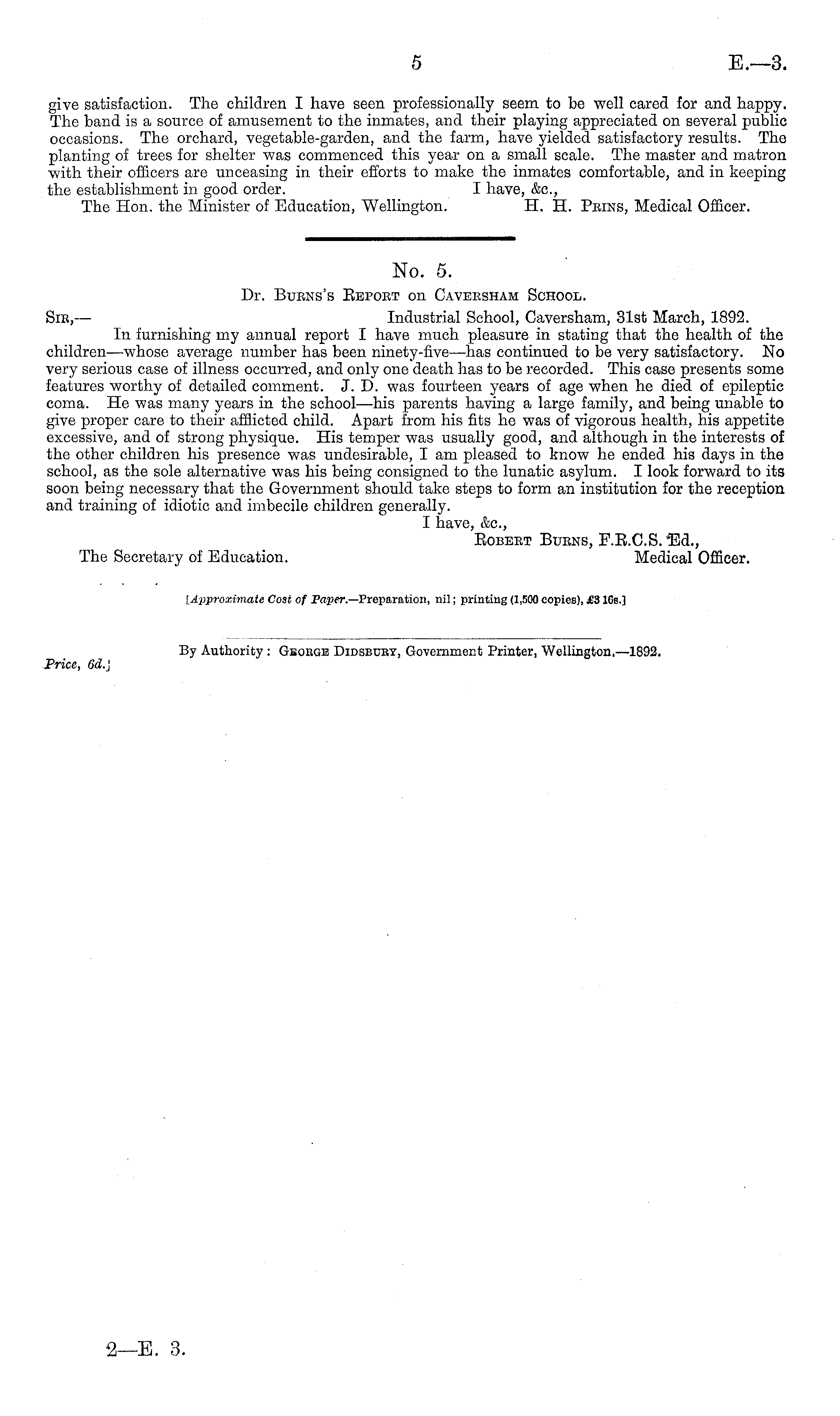 No. 5. Dr. Buens's Bepobt on Cavebsham School. Sic, — Industrial School, Caversham, 31st March, 1892. In furnishing my annual report I have much pleasure in stating that the health of the children—whose average number has been ninety-five —has continued to be very satisfactory. No very serious case of illness occurred, and only one death has to be recorded. This case presents some features worthy of detailed comment. J. D. was fourteen years of age when he died of epileptic coma. He was many years in the school—his parents having a large family, and being unable to give proper care to their afflicted child. Apart from his fits he was of vigorous health, his appetite excessive, and of strong physique. His temper was usually good, and although in the interests of the other children his presence was undesirable, I am pleased to know he ended his days in the school, as the sole alternative was his being consigned to the lunatic asylum. I look forward to its soon being necessary that the Government should take steps to form an institution for the reception and training of idiotic and imbecile children generally. I have, &c, Eobebt Bubns, F.E.C.S. -Ed., The Secretary of Education. Medical Officer. [Approximate Cost of Paper.— Preparation, nil; printing (1,500 copies), £3 165.]