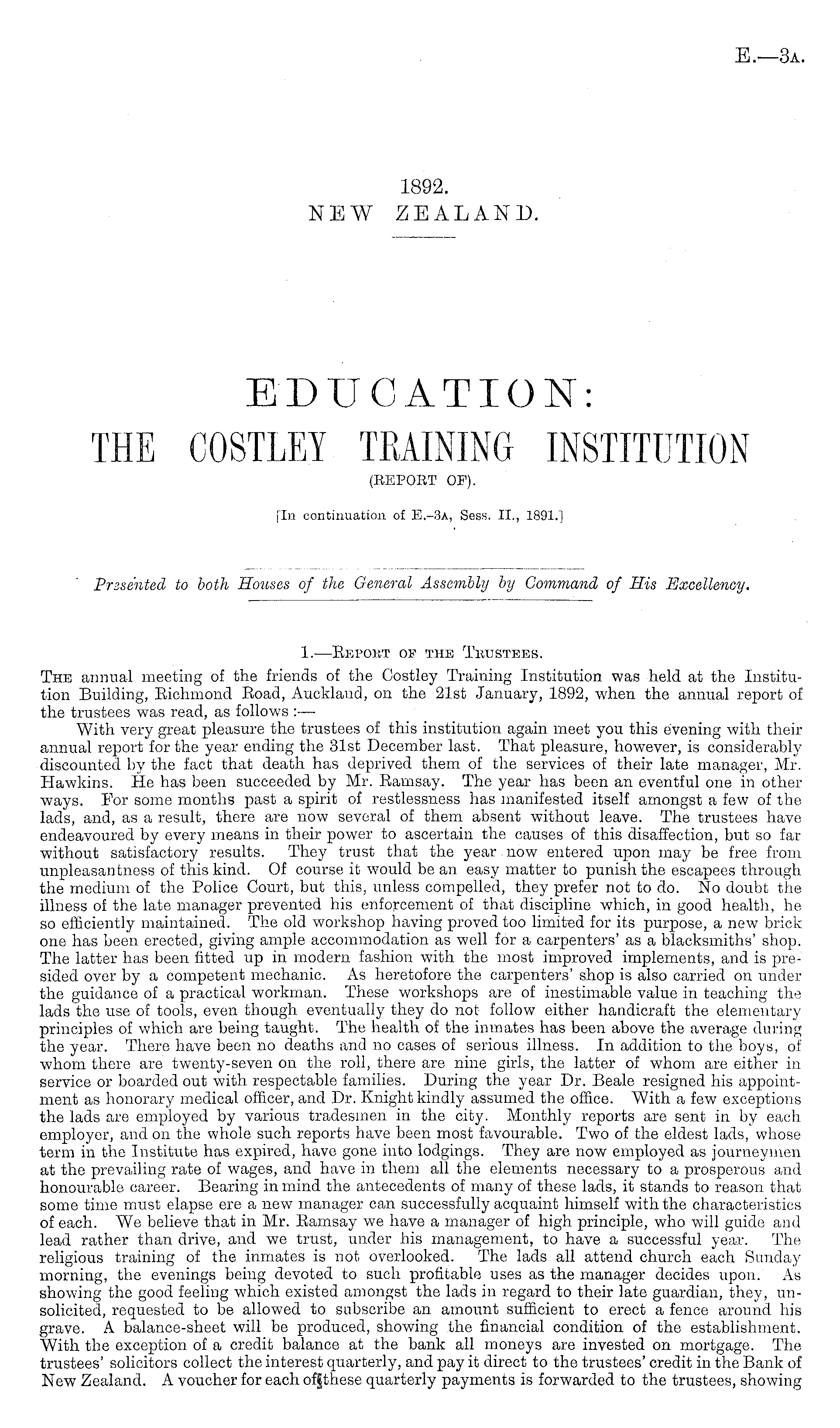 EDUCATION: THE COSTLEY TRAINING INSTITUTION (REPORT OF). [In continuation of E.-3a, Sess. II., 1891.]