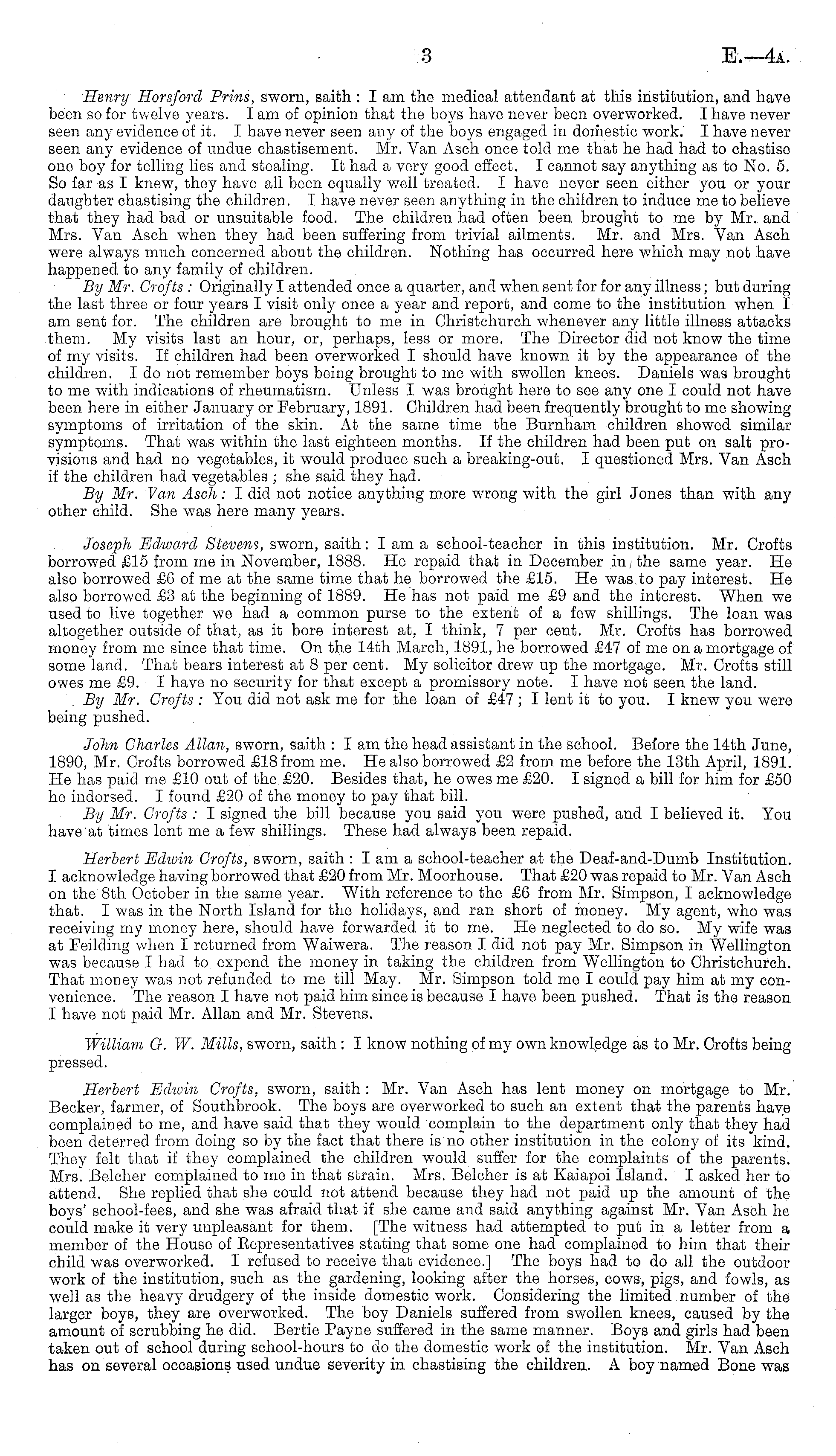 Henry Horsford Brims, sworn, saith : I am the medical attendant at this institution, and have been so for twelve years. lam of opinion that the boys have never been overworked. I have never seen any evidence of it. I have never seen any of the boys engaged in domestic work. I have never seen any evidence of undue chastisement. Mr. Van Asch once told me that he had had to chastise one boy for telling lies and stealing. It had a very good effect. I cannot say anything as to No. 5. So far as I knew, they have all been equally well treated. I have never seen either you or your daughter chastising the children. I have never seen anything in the children to induce me to believe that they had bad or unsuitable food. The children had often been brought to me by Mr. and Mrs. Van Asch when they had been suffering from trivial ailments. Mr. and Mrs. Van Asch were always much concerned about the children. Nothing has occurred here which may not have happened to any family of children. By Mr. Crofts : Originally I attended once a quarter, and when sent for for any illness; but during the last three or four years I visit only once a year and report, and come to the institution when I am sent for. The children are brought to me in Christchurch whenever any little illness attacks them. My visits last an hour, or, perhaps, less or more. The Director did not know the time of my visits. If children had been overworked I should have known it by the appearance of the children. Ido not remember boys being brought to me with swollen knees. Daniels was brought to me with indications of rheumatism. Unless I was brought here to see any one I could not have been here in either January or February, 1891. Children had been frequently brought to me showing symptoms of irritation of the skin. At the same time the Burnham children showed similar symptoms. That was within the last eighteen months. If the children had been put on salt provisions and had no vegetables, it would produce such a breaking-out. I questioned Mrs. Van Asch if the children had vegetables ; she said they had. By Mr. Van Asch: I did not notice anything more wrong with the girl Jones than with any other child. She was here many years. Joseph Edward Stevens, sworn, saith: lam a school-teacher in this institution. Mr. Crofts borrowed £15 from me in November, 1888. He repaid that in December in the same year. Hβ also borrowed £6 of me at the same time that he borrowed the £15. He was.to pay interest. He also borrowed £3 at the beginning of 1889. He has not paid me £9 and the interest. When we used to live together we had a common purse to the extent of a few shillings. The loan was altogether outside of that, as it bore interest at, I think, 7 per cent. Mr. Crofts has borrowed money from me since that time. On the 14th March, 1891, he borrowed £47 of me on a mortgage of some land. That bears interest at 8 per cent. My solicitor drew up the mortgage. Mr. Crofts still owes me £9. I have no security for that except a promissory note. I have not seen the land. By Mr. Crofts : You did not ask me for the loan of £47 ; I lent it to you. I knew you were being pushed. John Charles Allan, sworn, saith :I am the head assistant in the school. Before the 14th June, 1890, Mr. Crofts borrowed £18 from me. He also borrowed £2 from me before the 13th April, 1891. He has paid me £10 out of the £20. Besides that, he owes me £20. I signed a bill for him for £50 he indorsed. I found £20 of the money to pay that bill. By Mr. Crofts : I signed the bill because you said you were pushed, and I believed it. You have at times lent me a few shillings. These had always been repaid. Herbert Edwin Crofts, sworn, saith : I am a school-teacher at the Deaf-and-Dumb Institution. I acknowledge having borrowed that £20 from Mr. Moorhouse. That £20 was repaid to Mr. Van Asch on the Bth October in the same year. "With reference to the £6 from Mr. Simpson, I acknowledge that. I was in the North Island for the holidays, and ran short of money. My agent, who was receiving my money here, should have forwarded it to me. He neglected to do so. My wife was at Feilding when I returned from Waiwera. The reason I did not pay Mr. Simpson in Wellington was because I had to expend the money in taking the children from Wellington to Christchurch. That money was not refunded to me till May. Mr. Simpson told me I could pay him at my convenience. The reason I have not paid him since is because I have been pushed. That is the reason I have not paid Mr. Allan and Mr. Stevens. William G. W. Mills, sworn, saith : I know nothing of my own knowledge as to Mr. Crofts being pressed. Herbert Edwin Crofts, sworn, saith : Mr. Van Asch has lent money on mortgage to Mr. Becker, farmer, of Southbrook. The boys are overworked to such an extent that the parents have complained to me, and have said that they would complain to the department only that they had been deterred from doing so by the fact that there is no other institution in the colony of its kind. They felt that if they complained the children would suffer for the complaints of the parents. Mrs. Belcher complained to me in that strain. Mrs. Belcher is at Kaiapoi Island. I asked her to attend. She replied that she could not attend because they had not paid up the amount of the boys' school-fees, and she was afraid that if she came and said anything against Mr. Van Asch he could make it very unpleasant for them. [The witness had attempted to put in a letter from a member of the House of Eepresentatives stating that some one had complained to him that their child was overworked. I refused to receive that evidence.] The boys had to do all the outdoor work of the institution, such as the gardening, looking after the horses, cows, pigs, and fowls, as well as the heavy drudgery of the inside domestic work. Considering the limited number of the larger boys, they are overworked. The boy Daniels suffered from swollen knees, caused by the amount of scrub