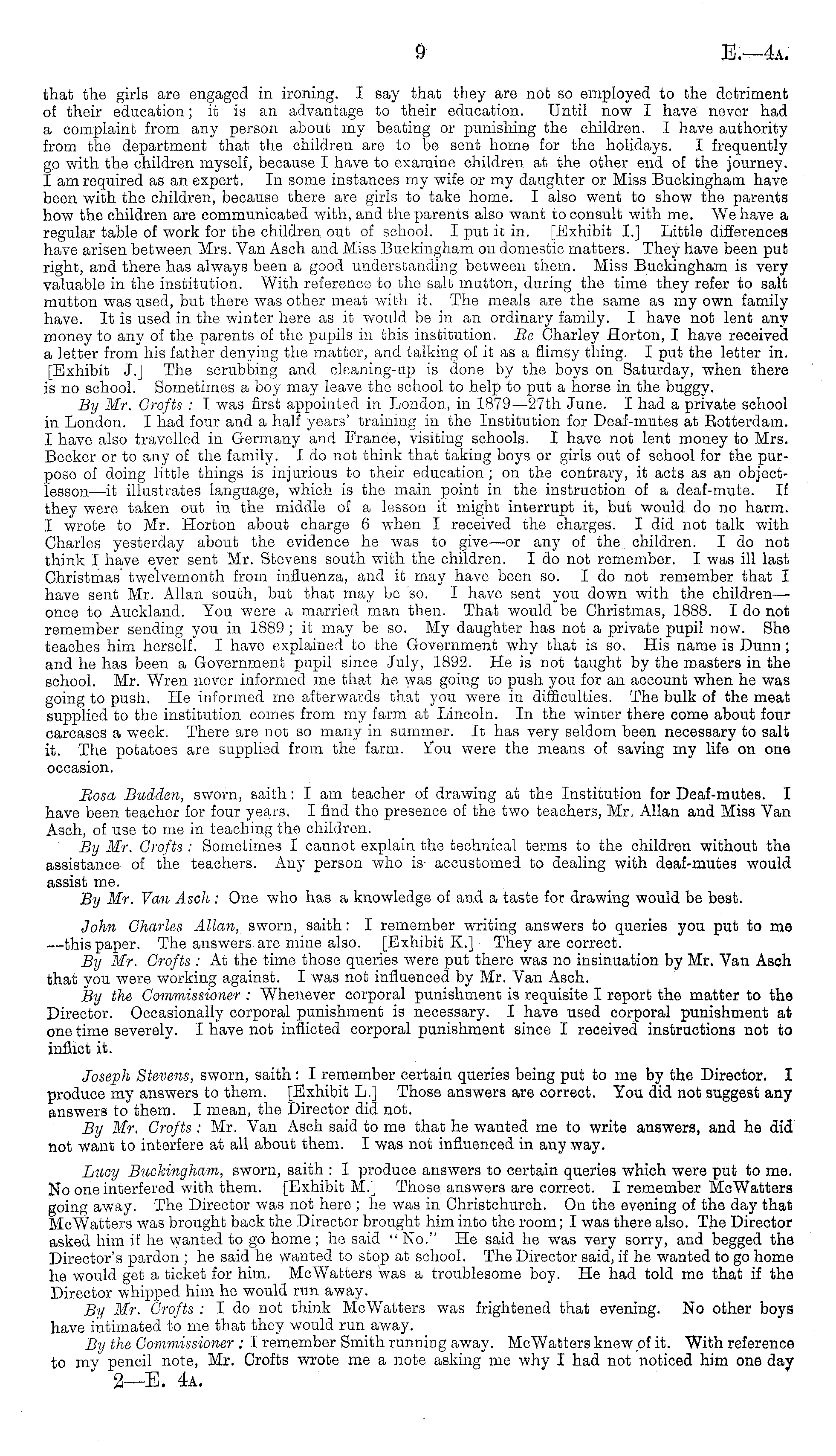 that the girls are engaged in ironing. I say that they are not so employed to the detriment of their education; it is an advantage to their education. Until now I have never had a complaint from any person about my beating or punishing the children. I have authority from the department that the children are to be sent home for the holidays. I frequently go with the children myself, because I have to examine children at the other end of the journey. lam required as an expert. In some instances my wife or my daughter or Miss Buckingham have been with the children, because there are girls to take home. I also went to show the parents how the children are communicated with, and the parents also want to consult with me. We have a regular table of work for the children out of school. I put ie in. [Exhibit I.] Little differences have arisen between Mrs. Van Asch and Miss Buckingham on domestic matters. They have been put right, and there has always been a good understanding between them. Miss Buckingham is very valuable in the institution. With reference to the salt mutton, during the time they refer to salt mutton was used, but there was other meat with it. The meals are the same as my own family have. It is used in the winter here as it would be in an ordinary family. I have not lent any money to any of the parents of the pupils in this institution. Be Charley Horton, I have received a letter from his father denying the matter, and talking of it as a flimsy thing. I put the letter in. [Exhibit J.] The scrubbing and cleaning-up is done by the boys on Saturday, when there is no school. Sometimes a boy may leave the school to help to put a horse in the buggy. By Mr. Crofts : I was first appointed in London, in 1879 —27th June. I had a private school in London. I had four and a half years' training in the Institution for Deaf-mutes at Botterdam. I have also travelled in Germany and Prance, visiting schools. I have not lent money to Mrs. Becker or to any of the family. Ido not think that taking boys or girls out of school for the parpose of doing little things is injurious to their education ; on the contrary, it acts as an objectlesson —it illustrates language, which is the main point in the instruction of a deaf-mute. If they were taken out in the middle of a lesson it might interrupt it, but would do no harm. I wrote to Mr. Horton about charge 6 when I received the charges. I did not talk with Charles yesterday about the evidence he was to give—or any of the children. I do not think I have ever sent Mr. Stevens south with the children. Ido not remember. I was ill last Christmas' twelvemonth from influenza, and it may have been so. Ido not remember that I have sent Mr. Allan south, but that may be so. I have sent you down with the children—■ once to Auckland. You were a married man then. That would be Christmas, 1888. Ido not remember sending you in 1889 ;it may be so. My daughter has not a private pupil now. She teaches him herself. I have explained to the Government why that is so. His name is Dunn ; and he has been a Government pupil since July, 1892. He is not taught by the masters in the school. Mr. Wren never informed me that he was going to push you for an account when he was going to push. He informed me afterwards that you were in difficulties. The bulk of the meat supplied to the institution comes from my farm at Lincoln. In the winter there come about four carcases a week. There arc not so many in summer. It has very seldom been necessary to salt it. The potatoes are supplied from the farm. You were the means of saving my life on one occasion. Bosa Budde?i, sworn, saith: I am teacher of drawing at the Institution for Deaf-mutes. I have been teacher for four years. I find the presence of the two teachers, Mr, Allan and Miss Van Asch, of use to me in teaching the children. By Mr. Crofts : Sometimes I cannot explain the technical terms to the children without the assistance of the teachers. Any person who is- accustomed to dealing with deaf-mutes would assist me. By Mr. Van Asch : One who has a knowledge of and a taste for drawing would be best. John Charles Allan, sworn, saith: I remember writing answers to queries you put to me this paper. The answers are mine also. [Exhibit X.] They are correct. By Mr. Crofts : At the time those queries were put there was no insinuation by Mr. Van Asch that you were working against. I was not influenced by Mr. Van Asch. By the Commissioner : Whenever corporal punishment is requisite I report the matter to the Director. Occasionally corporal punishment is necessary. I have used corporal punishment at one time severely. I have not inflicted corporal punishment since I received instructions not to inflict it. Joseph Stevens, sworn, saith : I remember certain queries being put to me by the Director. I produce my answers to them. [Exhibit L.] Those answers are correct. You did not suggest any answers to them. I mean, the Director did not. By Mr. Crofts : Mr. Van Asch said to me that he wanted me to write answers, and he did not want to interfere at all about them. I was not influenced in any way. Lucy Buckingham, sworn, saith : I produce answers to certain queries which were put to me. No one interfered with them. [Exhibit M.] Those answers are correct. I remember McWatters going away. The Director was not here ; he was in Christchurch. On the evening of the day that McWatters was brought back the Director brought him into the room; I was there also. The Director asked him if he wanted to go home; he said " No." He said he was very sorry, and begged the Director's pardon ; he said he wanted to stop at school. The Director said, if he wanted to go home he would get a ticket for him. McWatters was a troublesome boy. He had told me that if the Director whipped him he would run away. By Mr. Crofts : Ido not think McWatters was frightened that evening. No other boys have intimated to me that they would run away. By the Commissioner ; I remember Smith 