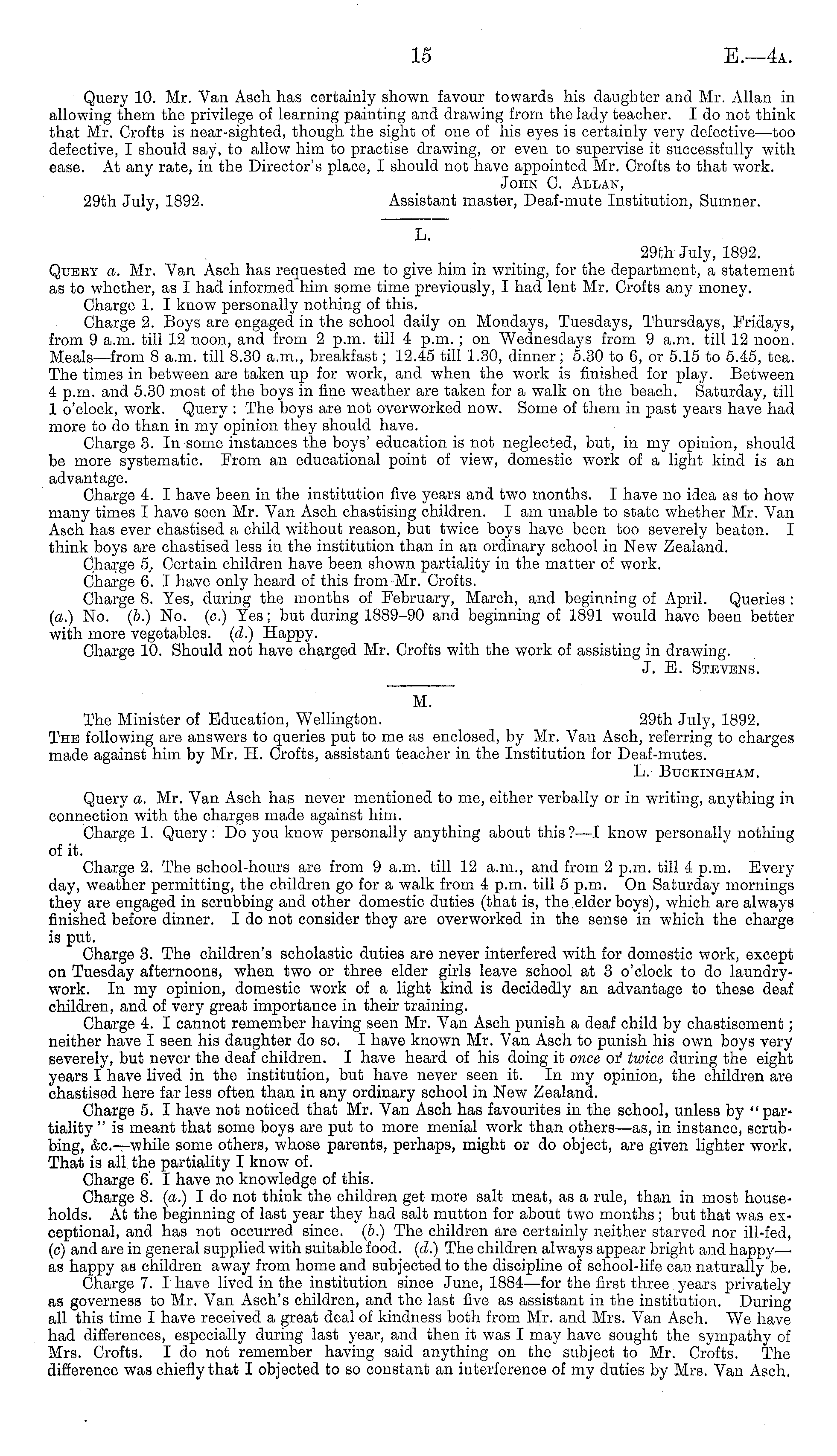 M. The Minister of Education, Wellington. 29th July, 1892. The following are answers to queries put to me as enclosed, by Mr. Van Asch, referring to charges made against him by Mr. H. Crofts, assistant teacher in the Institution for Deaf-mutes. L. Buckingham. Query a. Mr. Van Asch has never mentioned to me, either verbally or in writing, anything in connection with the charges made against him. Charge 1. Query: Do you know personally anything about this?—l know personally nothing of it. Charge 2. The school-hours are from 9 a.m. till 12 a.m., and from 2 p.m. till 4 p.m. Every day, weather permitting, the children go for a walk from 4 p.m. till 5 p.m. On Saturday mornings they are engaged in scrubbing and other domestic duties (that is, the.elder boys), which are always finished before dinner. Ido not consider they are overworked in the sense in which the charge is put. Charge 3. The children's scholastic duties are never interfered with for domestic work, except on Tuesday afternoons, when two or three elder girls leave school at 3 o'clock to do laundrywork. In my opinion, domestic work of a light kind is decidedly an advantage to these deaf children, and of very great importance in their training. Charge 4. I cannot remember having seen Mr. Van Asch punish a deaf child by chastisement; neither have I seen his daughter do so. I have known Mr. Van Asch to punish his own boys very severely, but never the deaf children. I have heard of his doing it once or , twice during the eight years I have lived in the institution, but have never seen it. In my opinion, the children are chastised here far less often than in any ordinary school in New Zealand.. Charge 5. I have not noticed that Mr. Van Asch has favourites in the school, unless by "partiality " is meant that some boys are put to more menial work than others—as, in instance, scrubbing,"&c.—while some others, whose parents, perhaps, might or do object, are given lighter work. That is all the partiality I know of. Charge 6. I have no knowledge of this. Charge 8. (a.) I do not think the children get more salt meat, as a rule, than in most households. At the beginning of last year they had salt mutton for about two months; but that was exceptional, and has not occurred since, (b.) The children are certainly neither starved nor ill-fed, (c) and are in general supplied with suitable food, (d.) The children always appear bright and happy—■ as happy as children away from home and subjected to the discipline of school-life can naturally be. Charge 7. I have lived in the institution since June, 1884—for the first three years privately as governess to Mr. Van Asch's children, and the last five as assistant in the institution. During all this time I have received a great deal of kindness both from Mr. and Mrs. Van Asch. We have had differences, especially during last year, and then it was I may have sought the sympathy of Mrs. Crofts. Ido not remember having said anything on the subject to Mr. Crofts. The difference was chiefly that I objected to so constant an interference of my duties by Mrs. Van Asch,