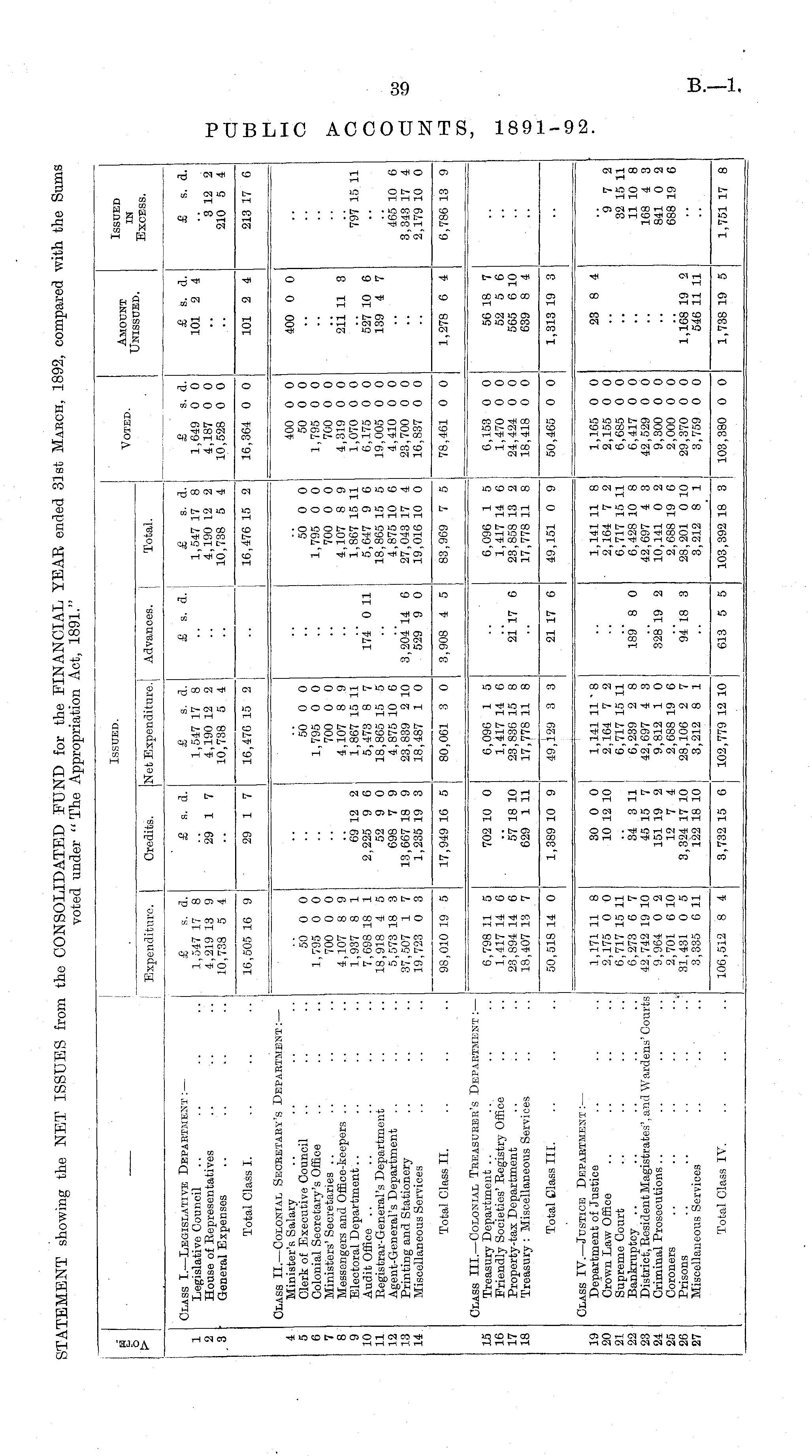 STATEMENT showing the NET ISSUES from the CONSOLIDATED FUND for the FINANCIAL YEAR ended 31st March, 1892, compared with the Sums voted under "The Appropriation Act, 1891."