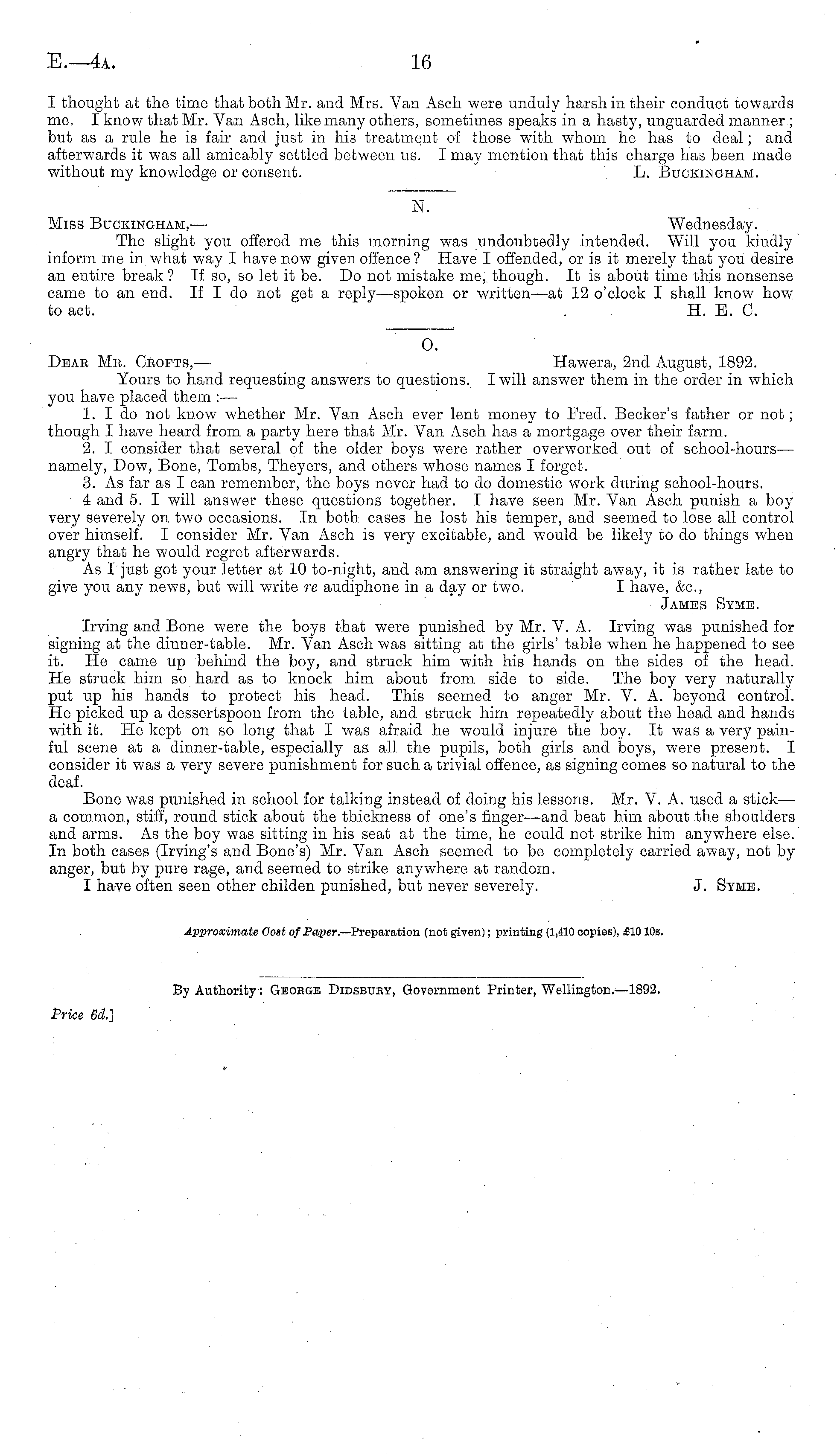 0. Dbae Mk. Crofts, — Hawera, 2nd August, 1892. Yours to hand requesting answers to questions. I will answer them in the order in which you have placed them : — 1. I do not know whether Mr. Van Asch ever lent money to Fred. Becker's father or not; though I have heard from a party here that Mr. Van Asch has a mortgage over their farm. 2. I consider that several of the older boys were rather overworked out of school-hours— namely, Dow, Bone, Tombs, Theyers, and others whose names I forget. 3. As far as I can remember, the boys never had to do domestic work during school-hours. 4 and 5. I will answer these questions together. I have seen Mr. Van Asch punish a boy very severely on two occasions. In both cases he lost his temper, and seemed to lose all control over himself. I consider Mr. Van Asch is very excitable, and would be likely to do things when angry that he would regret afterwards. As I just got your letter at 10 to-night, and am answering it straight away, it is rather late to give you any news, but will write re audiphone in a day or two. I have, &c, James Syme. Irving and Bone were the boys that were punished by Mr. V. A. Irving was punished for signing at the dinner-table. Mr. Van Asch was sitting at the girls' table when he happened to see it. He came up behind the boy, and struck him with his hands on the sides of the head. He struck him so hard as to knock him about from side to side. The boy very naturally put up his hands to protect his head. This seemed to anger Mr. V. A. beyond control. He picked up a dessertspoon from the table, and struck him repeatedly about the head and hands with it. He kept on so long that I was afraid he would injure the boy. It was a very painful scene at a dinner-table, especially as all the pupils, both girls and boys, were present. I consider it was a very severe punishment for such a trivial offence, as signing comes so natural to the deaf. Bone was punished in school for talking instead of doing his lessons. Mr. V. A. used a stick— a common, stiff, round stick about the thickness of one's finger —and beat him about the shoulders and arms. As the boy was sitting in his seat at the time, he could not strike him anywhere else. In both cases (Irving's and Bone's) Mr. Van Asch seemed to be completely carried away, not by anger, but by pure rage, and seemed to strike anywhere at random. I have often seen other childen punished, but never severely. J. Syme. Approximate Cost of Paper.— Preparation (not given); printing (1,410 copies), £10 10s.