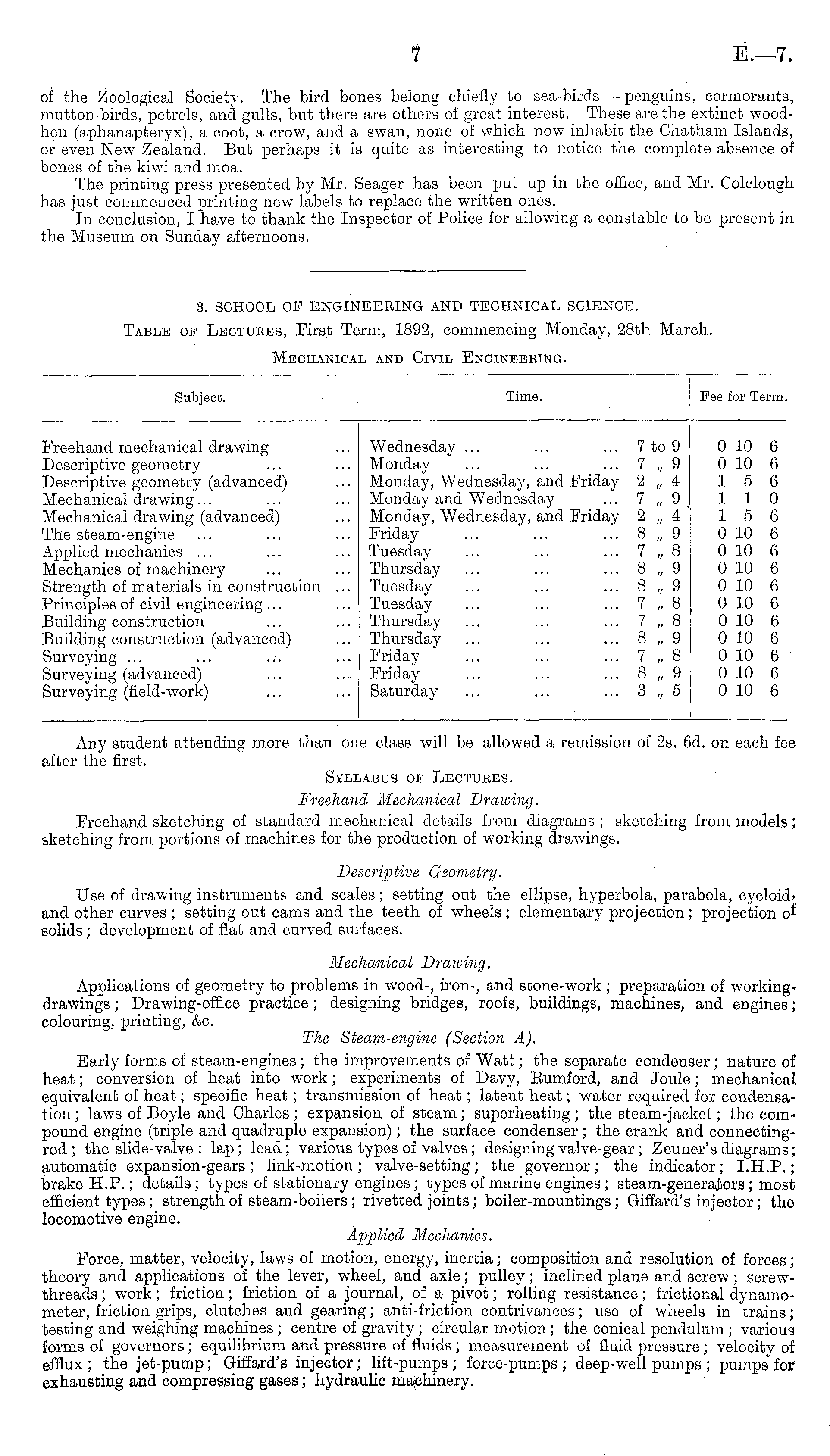 Subject. Time. Fee for Term. Freehand mechanical drawing Descriptive geometry Descriptive geometry (advanced) Mechanical drawing... Mechanical drawing (advanced) The steam-engine Applied mechanics ... Mechanics of machinery Strength of materials in construction ... Principles of civil engineering ... Building construction Building construction (advanced) Surveying ... Surveying (advanced) Surveying (field-work) Wednesday ... Monday Monday, Wednesday, and Friday Monday and Wednesday Monday, Wednesday, and Friday Friday Tuesday Thursday Tuesday Tuesday Thursday Thursday Friday Friday Saturday 7 to 9 7 „ 9 2 „ i 7 „ 9 2 „ 4 8 „ 9 7 „ 8 8 „ 9 8 „ 9 7 „ 8 7 „ 8 8 „ 9 7 „ 8 8 „ 9 3 „ 5 0 10 0 10 1 5 1 1 1 5 0 10 0 10 0 10 0 10 0 10 0 10 0 10 0 10 0 10 0 10 6 6 6 0 6 6 6 6 6 6 6 6 6 6 6