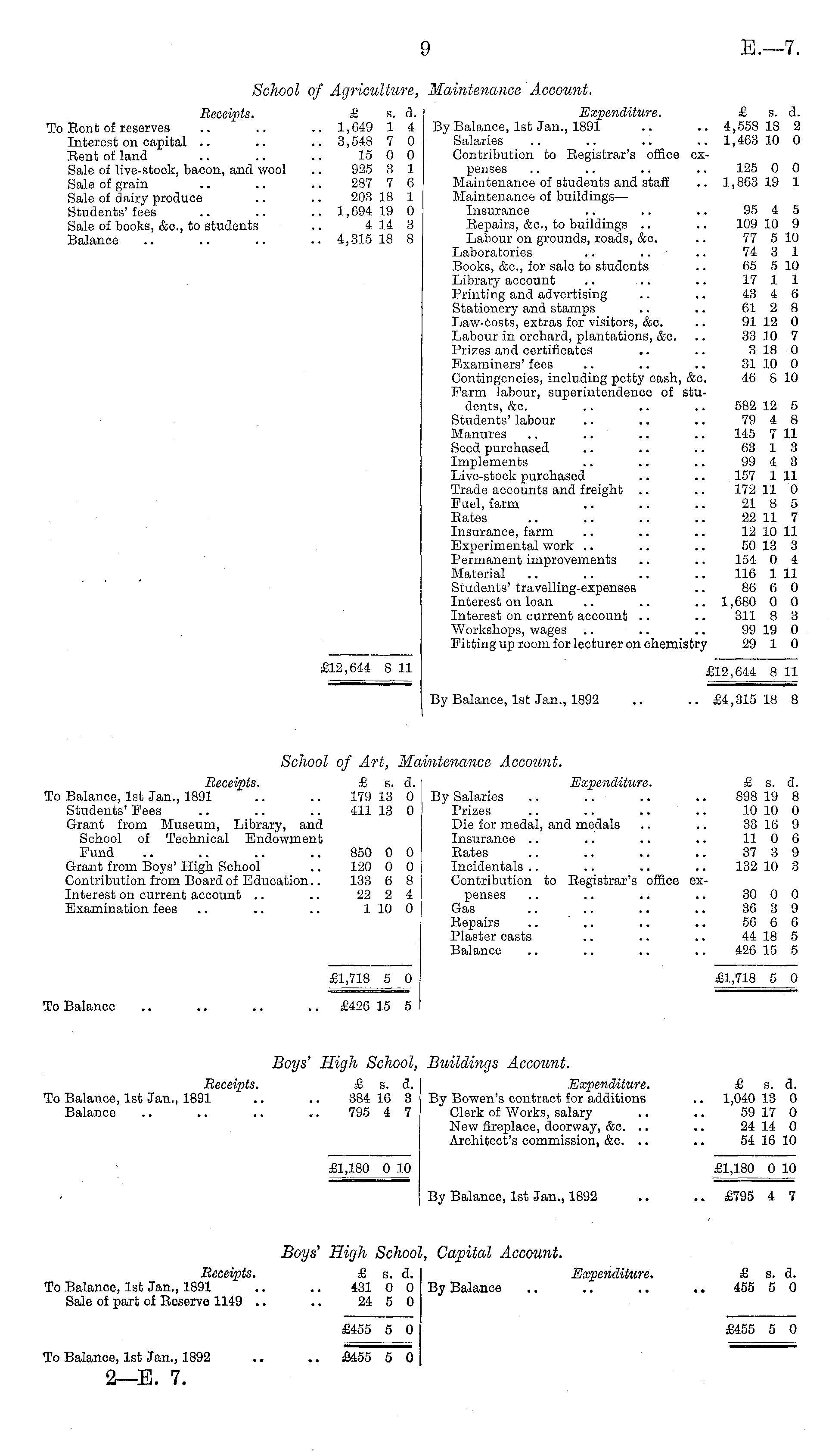 School of Art, Maintenance Account. Receipts. £ s. d. Expenditure. £ s. d. To Balance, 1st Jan., 1891 .. .. 179 13 0 By Salaries .. .. .. .. 898 19 8 Students' Fees .. .. .. 411 13 0 Prizes .. .. .. .. 10 10 0 Grant from Museum, Library, and Die for medal, and medals .. .. 33 16 9 School of Technical Endowment Insurance .. .. .. .. 110 6 Fund .. .. .. .. 850 0 0 Rates .. .. .. .. 37 3 9 Grant from Boys' High School .. 120 0 0 Incidentals .. .. .. .. 132 10 3 Contribution from Board of Education.. 133 6 8 Contribution to Registrar's office exInterest on current account .. .. 22 2 4 penses .. .. .. .. 30 0 0 Examination fees .. .. .. 1 10 0 Gas .. .. .. .. 36 3 9 Repairs .. .. .. .. 56 6 6 Plaster casts .. .. .. 44 18 5 Balance .. .. .. .. 426 15 5 £1,718 5 0 £1,718 5 0 To Balance .. .. .. .. £426 15 5 Boys' High School, Buildings Accottnt. Receipts. £ s. d. Expenditure. £ s. d. To Balance, 1st Jan., 1891 .. .. 384 16 3 By Bowen's contract for additions .. 1,040 13 0 Balance .. .. .. .. 795 4 7 Clerk of Works, salary .. .. 59 17 0 New fireplace, doorway, &c. .. .. 24 14 0 Architect's commission, &c. .. .. 54 16 10 £1,180 0 10 £1,180 0 10 By Balance, 1st Jan., 1892 .. .. £795 4 7 Boys' High School, Capital Account. Receipts. £ s. d. Expenditure. £ s. d. To Balance, 1st Jan., 1891 .. .. 431 0 0 By Balance .. .. .. .. 455 5 0 Sale of part of Reserve 1149 .. .. 24 5 0 £455 5 0 £455 5 0 To Balance, 1st Jan., 1892 .. .. £455 5 0 2—B. 7.