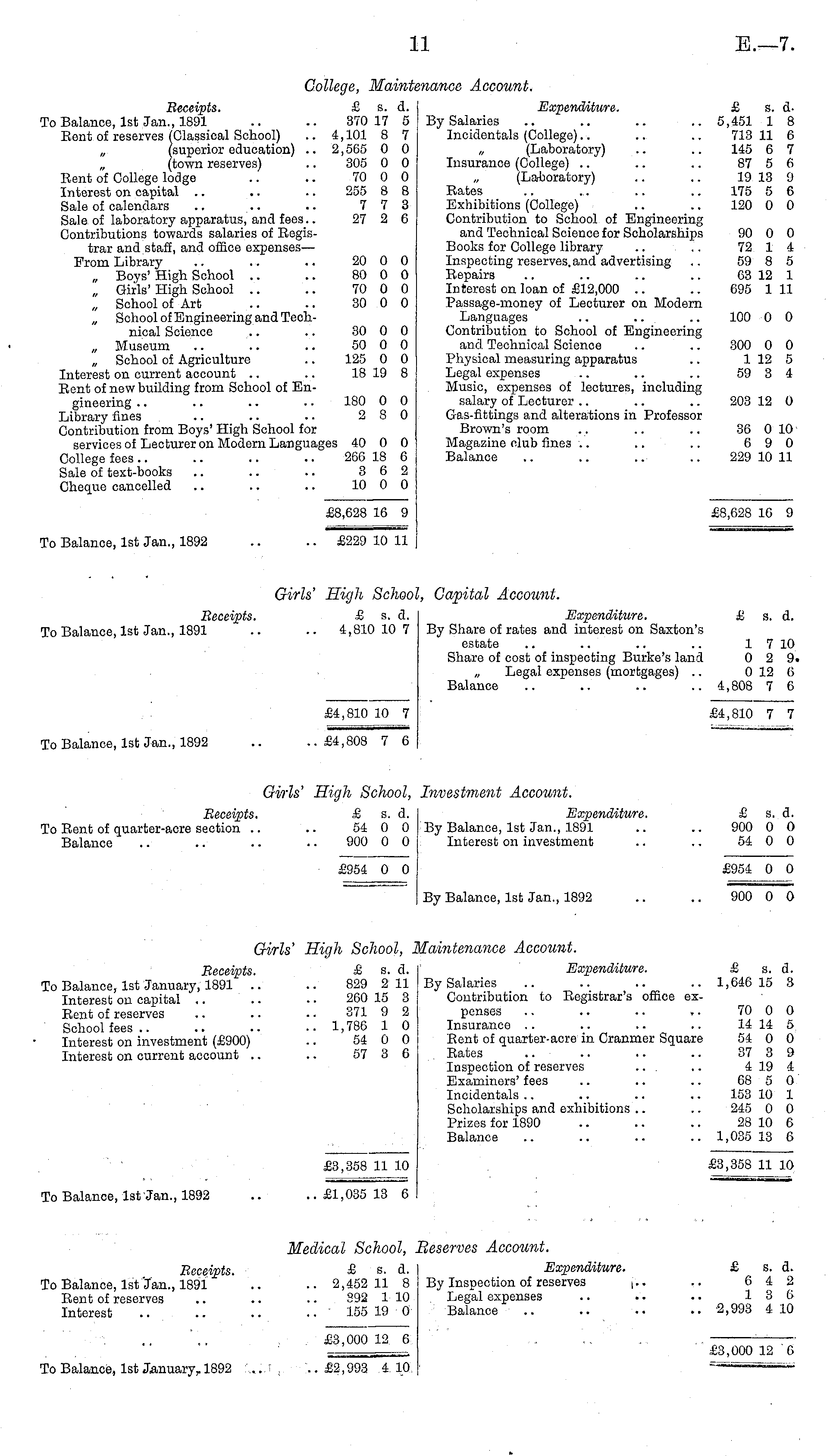 College, Maintenance Account. Receipts. £ s. d. Expenditure. £ s. dTo Balance, Ist Jan., 1891 .. .. 370 17 5 By Salaries .. .. .. .. 5,451 1 8 Eent of reserves (Classical School) .. 4,101 8 7 Incidentals (College).. .. .. 713 11 6 „ (superior education) .. 2, 5G5 0 0 „ (Laboratory) .. .. 145 6 7 „ (town reserves) .. 305 0 0 Insurance (College) .. .. .. 87 5 6 Bent of College lodge .. .. 70 0 0 „ (Laboratory) .. .. 19 13 9 Interest on capital .. .. .. 255 8 8 Bates .. .. .. .. 175 5 6 Sale of calendars .. .. .. 7 7 3 Exhibitions (College) .. .. 120 0 0 Sale of laboratory apparatus, and fees.. 27 2 6 Contribution to School of Engineering Contributions towards salaries of Regis- and Technical Science for Scholarships 90 0 0 trar and staff, and office expenses— Books for College library .. .. 72 1 4 Prom Library .. .. .. 20 0 0 Inspecting reserves, and advertising .. 59 8 5 „ Boys' High School .. .. 80 0 0 Repairs .. .. .. .. 63 12 1 „ Girls' High School .. .. 70 0 0 Interest on loan of £12,000 .. .. 695 111 „ School of Art .. .. 30 0 0 Passage-money of Lecturer on Modern „ School of Engineering and Teoh- Languages .. .. .. 100 0 0 nical Science .. .. 30 0 0 Contribution to School of Engineering „ Museum .. .. .. 50 0 0 and Technical Science .. .. 300 0 0 „ School of Agriculture .. 125 0 0 Physical measuring apparatus .. 112 5 Interest on current account .. .. 18 19 8 Legal expenses .. .. .. 59 3 4 Rent of new building from School of En- Music, expenses of lectures, including gineering .. .. .. .. 180 0 0 salary of Lecturer .. .. .. 203 12 0 Library fines .. .. .. 2 8 0 Gas-fittings and alterations in Professor Contribution from Boys' High School for Brown's room ... .. .. 36 0 10 services of Lecturer on Modern Languages 40 0 0 Magazine olub fines .. .. .. 6 9 0 College fees.. .. .. .. 266 18 6 Balance .. .. .. .. 229 10 11 Sale of text-books .. .. .. 3 6 2 Cheque cancelled .. .. .. 10 0 0 £8,628 16 9 £8,628 16 9 To Balance, Ist Jan., 1892 .. .. £229 10 11 Girls' High School, Capital Account. Receipts. £ s. d. Expenditure. £ s. d. To Balance, Ist Jan., 1891 .. .. 4,810 10 7 By Share of rates and interest on Saxton's estate .. .. .. .. 1 710 Share of cost of inspecting Burkes land 0 2 9. Legal expenses (mortgages) .. 0 12 6 Balance .. .. .. .. 4,808 7 6 £4,810 10 7 £4,810 7 7 To Balance, Ist Jan., 1892 .. ..£4,808 7 6 Girls' High School, Investment Account. Receipts. £ s. d. Expenditure. £ s. d. To Rent of quarter-acre section .. .. 54 0 0 By Balance, Ist Jan., 1891 .. .. 900 0 0 Balance .. .. .. .. 900 0 0 Interest on investment .. .. 54 0 0 £954 0 0 £954 0 0 By Balance, Ist Jan., 1892 .. .. 900 0 0 Girls' High School, Maintenance Account. Receipts. £ s. d. Expenditure. £ s. d. To Balance, Ist January, 1891 .. .. 829 211 By Salaries .. .. .. .. 1,646 15 8 Interest on capital .. .. .. 260 15 3 Contribution to Registrar's office exRent of reserves .. .. .. 371 9 2 penses .. .. .. .. 70 0 0 School fees.. .. .. -■ 1,786 1 0 Insurance .. .. .. .. 14 14 5 Interest on investment (£900) .. 54 0 0 Rent of quarter-acre in Cranmer Square 54 0 0 Interest on current account .. .. 57 3 6 Rates .. .. .. .. 37 3 9 Inspection of reserves .. .. 4 19 4 Examiners' fees .. .. .. 68 5 0 Incidentals .. .. .. .. 153 10 1 Scholarships and exhibitions .. .. 245 0 0 Prizes for 1890 .. .. .. 28 10 6 Balance .. .. .. .. 1,035 13 6 £3,358 11 10 £3,358 11 10 To Balance, Ist Jan., 1892 .. ..£1,035 13 6 Medical School, Beserves Account. Receipts. £ s. d. Expenditure. £ s. a. To Balance, Ist Jan., 1891 .. .. 2,452 11 8 By Inspection of reserves [.. .. 6 4 2 Rent of reserves .. .. .. 292 1 10 Legal expenses .. .. .. 13 6 Interest .. .. .. .. 155 19 0 Balance .. .. .. .. 2,993 410 £3,000 12 6 —— _ , £3,000 12 6 To Balance, Ist January, 1892 '..... i . ..£2,993 4 10 —