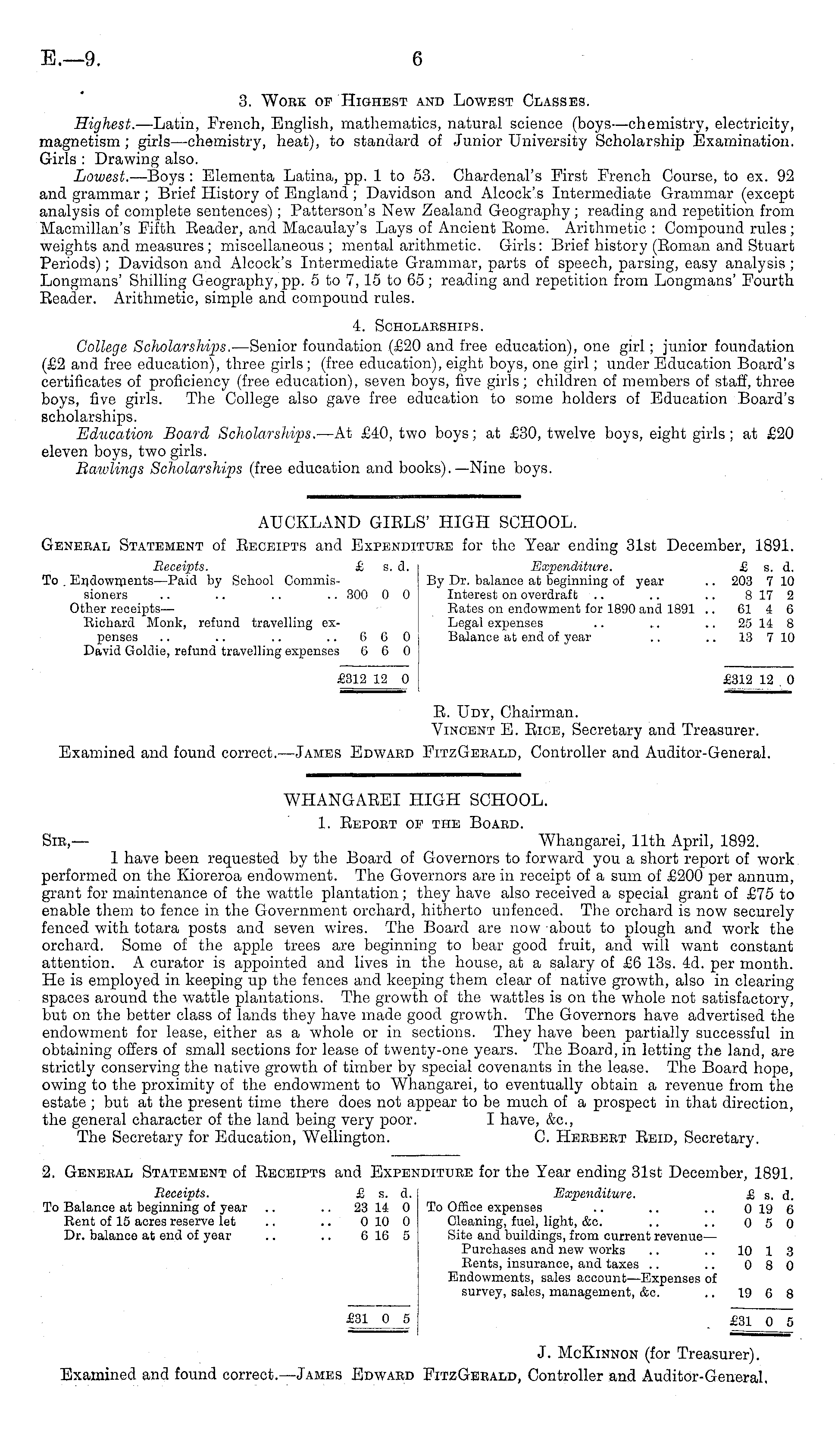 3. Work op Highest and Lowest Classes. Highest. —Latin, French, English, mathematics, natural science (boys—chemistry, electricity, magnetism; girls—chemistry, heat), to standard of Junior University Scholarship Examination. Girls : Drawing also. Lowest. —Boys : Elementa Latina, pp. Ito 53. Chardenal's First French Course, to ex. 92 and grammar ; Brief History of England ; Davidson and Alcock's Intermediate Grammar (except analysis of complete sentences); Patterson's New Zealand Geography; reading and repetition from Macmillan's Fifth Reader, and Macaulay's Lays of Ancient Rome. Arithmetic : Compound rules; weights and measures ; miscellaneous; mental arithmetic. Girls: Brief history (Roman and Stuart Periods); Davidson and Alcock's Intermediate Grammar, parts of speech, parsing, easy analysis; Longmans' Shilling Geography, pp. sto 7,15 to 65; reading and repetition from Longmans' Fourth Reader. Arithmetic, simple and compound rules. i. Scholarships. College Scholarships. —Senior foundation (£2O and free education), one girl; junior foundation (£2 and free education), three girls; (free education), eight boys, one girl; under Education Board's certificates of proficiency (free education), seven boys, five girls; children of members of staff, three boys, five girls. The College also gave free education to some holders of Education Board's scholarships. Education Board Scholarships. —At £40, two boys; at £30, twelve boys, eight girls; at £20 eleven boys, two girls. Bawlings Scholarships (free education and books). —Nine boys.