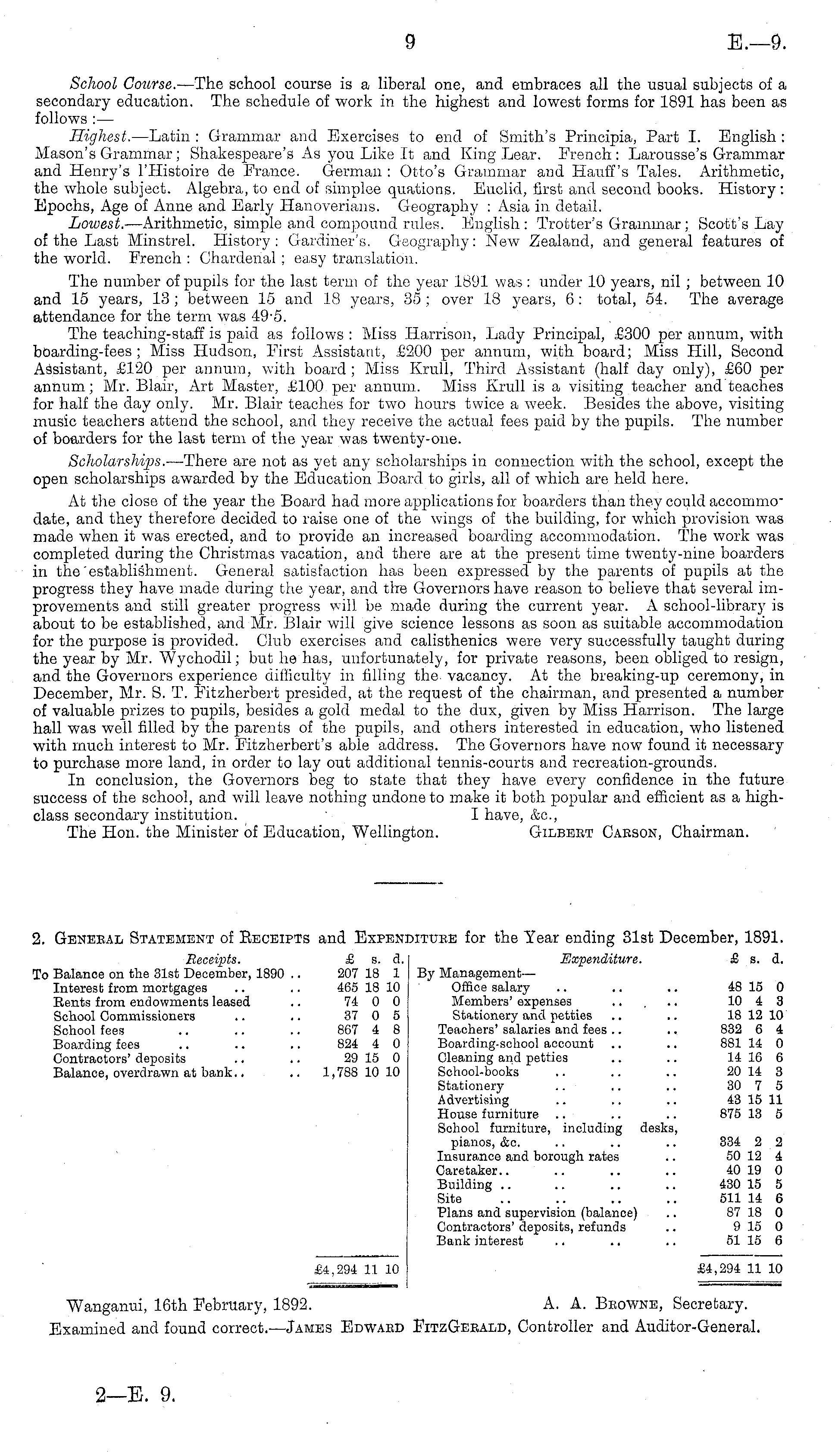 School Course. —The school course is a liberal one, and embraces all the usual subjects of a secondary education. The schedule of work in the highest and lowest forms for 1891 has been as follows :— Highest. —Latin : Grammar and Exercises to end of Smith's Principia, Part I. English : Mason's Grammar; Shakespeare's As you Like It and King Lear. French: Larousse's Grammar and Henry's l'Histoire de France. German : Otto's Grammar and Hauff's Tales. Arithmetic, the whole subject. Algebra, to end of simplee quations. Euclid, first and second books. History : Epochs, Age of Anne and Early Hanoverians. Geography : Asia in detail. Lowest. —Arithmetic, simple and compound rules. English: Trotter's Grammar; Scott's Lay of the Last Minstrel. History: Gardiner's. Geography: New Zealand, and general features of the world. French : Chardenal ; easy translation. The number of pupils for the last term of the year 1891 was : under 10 years, nil ; between 10 and 15 years, 13; between 15 and 18 years, 35 ; over 18 years, 6: total, 54. The average attendance for the term was 495. The teaching-staff is paid as follows : Miss Harrison, Lady Principal, £300 per annum, with boarding-fees; Miss Hudson, First Assistant, £200 per annum, with board; Miss Hill, Second Assistant, £120 per annum, with board ; Miss Krull, Third Assistant (half day only), £60 per annum ; Mr. Blair, Art Master, £100 per annum. Miss Krull is a visiting teacher and teaches for half the day only. Mr. Blair teaches for two hours twice a week. Besides the above, visiting music teachers attend the school, and they receive the actual fees paid by the pupils. The number of boarders for the last term of the year was twenty-one. Scholarships. —There are not as yet any scholarships in connection with the school, except the open scholarships awarded by the Education Board to girls, all of which are held here. At the close of the year the Board had more applications for boarders than they could accommodate, and they therefore decided to raise one of the wings of the building, for which provision was made when it was erected, and to provide an increased boarding accommodation. The work was completed during the Christmas vacation, and there are at the present time twenty-nine boarders in the ■establishment. General satisfaction has been expressed by the parents of pupils at the progress they have made during the year, and the Governors have reason to believe that several improvements and still greater progress will be made during the current year. A school-library is about to be established, and Mr. Blair will give science lessons as soon as suitable accommodation for the purpose is provided. Club exercises and calisthenics were very successfully taught during the year by Mr. Wychodil; but he has, unfortunately, for private reasons, been obliged to resign, and the Governors experience difficulty in filling the vacancy. At the breaking-up ceremony, in December, Mr. S. T. Fitzherbert presided, at the request of the chairman, and presented a number of valuable prizes to pupils, besides a gold medal to the dux, given by Miss Harrison. The large hall was well filled by the parents of the pupils, and others interested in education, who listened with much interest to Mr. Fitzherbert's able address. The Governors have now found it necessary to purchase more land, in order to lay out additional tennis-courts and recreation-grounds. In conclusion, the Governors beg to state that they have every confidence in the future success of the school, and will leave nothing undone to make it both popular and efficient as a highclass secondary institution. I have, &c, The Hon. the Minister of Education, Wellington. Gilbert Carson, Chairman.