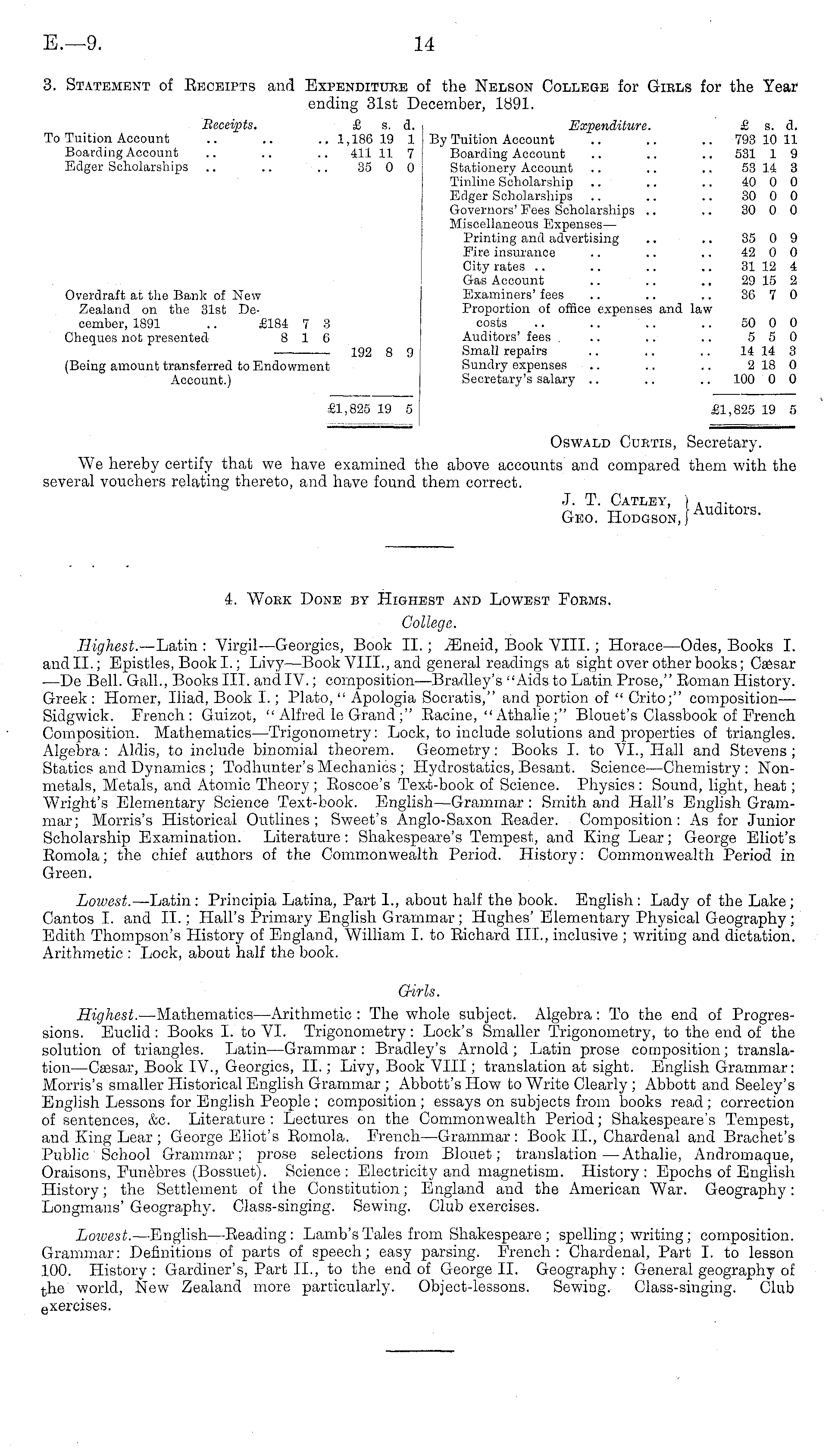 3. Statement of Receipts and Expenditure of the Nelson College for Girls for the Year ending 31st December, 1891. Receipts. £ s. d. Expenditure. £ s. d. To Tuition Account .. .. .. 1,186 19 1 By Tuition Account .. .. .. 793 10 11 Boarding Account .. .. .. 411 11 7 Boarding Account .. .. .. 531 1 9 Edger Scholarships .. .. .. 35 0 0 Stationery Account .. .. .. 53 14 3 Tinline Scholarship .. .. .. 40 0 0 Edger Scholarships .. .. .. 30 0 0 Governors' Fees Scholarships .. .. 30 0 0 Miscellaneous Expenses— Printing and advertising .. .. 35 0 9 Fire insurance .. .. .. 42 0 0 City rates .. .. .. .. 31 12 4 Gas Account .. .. .. 29 15 2 Overdraft at the Bank of New Examiners' fees .. .. .. 36 7 0 Zealand on the 31st De- Proportion of office expenses and law cember, 1891 .. £184 7 3 costs .. .. .. .. 50 0 0 Cheques not presented 8 16 Auditors' fees . .. .. .. 5 5 0 192 8 9 Small repairs .. .. .. 14 14 3 (Being amount transferred to Endowment Sundry expenses .. .. .. 218 0 Account.) Secretary's salary .. .. .. 100 0 0 £1,825 19 5 £1,825 19 5 Oswald Cuiitis, Secretary. We hereby certify that we have examined the above accounts and compared them with the several vouchers relating thereto, and have found them correct. J. T. Catley, ) . ~, Geo. Hodgson, ) Audltors -