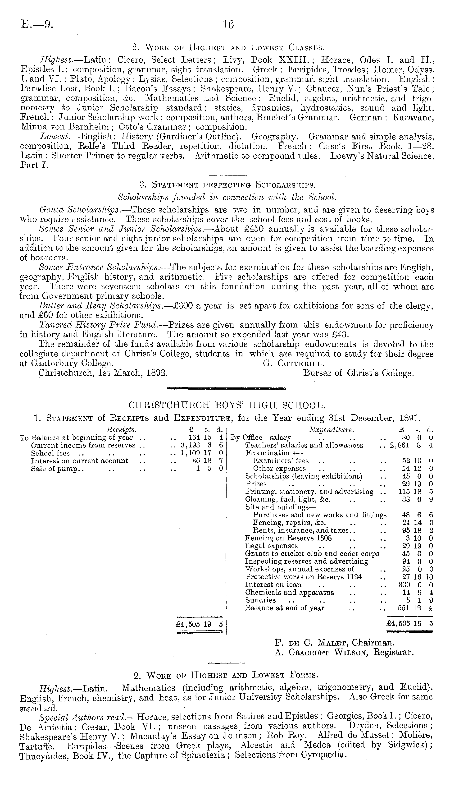 CHEISTCHUECH BOYS' HIGH SCHOOL. 1. Statement of Beceipts and Expenditure, for the Year ending 31st December, 1891. Receipts. & s. d. Expenditure. £ s. d. To Balance at beginning of year .. .. 164 15 4 By Office —salary .. .. .. 80 0 0 Current income from reserves .. .. 3,193 3 6 Teachers'salaries and allowances .. 2,864 8 4 School fees .. .. .. .. 1,109 17 0 Examinations— Interest on current account .. .. 36 18 7 Examiners' fees .. .. .. 52 10 0 Sale of pump.. .. .. .. 15 0 Other expenses .. .. .. 14 12 0 Scholarships (leaving exhibitions) .. 45 0 0 Prizes .. .. .. .. 29 19 0 Printing, stationery, and advertising .. 115 18 5 Cleaning, fuel,.light, &c. .. .. 38 0 9 Site and buildings— Purchases and new works and fittings 48 6 6 Fencing, repairs, &o. .. .. 24 14 0 Rents, insurance, and taxes.. .. 95 18 2 Fencing on Reserve 1308 .. .. 3 10 0 Legal expenses .. .. .. 29 19 0 Grants to cricket club and cadet corps 45 0 0 Inspecting reserves and advertising 94 3 0 Workshops, annual expenses of .. 25 0 0 Protective works on Reserve 1124 .. 27 16 10 Interest on loan .. .. .. 300 0 0 Chemicals and apparatus .. .. 14 9 4 Sundries .. .. .. .. 5 19 Balance at end of year .. .. 551 12 4 £4,505 19 5 £4,505 19 5 F. de C. Malet, Chairman. A. Ceaceopt Wilson, Eegistrar.