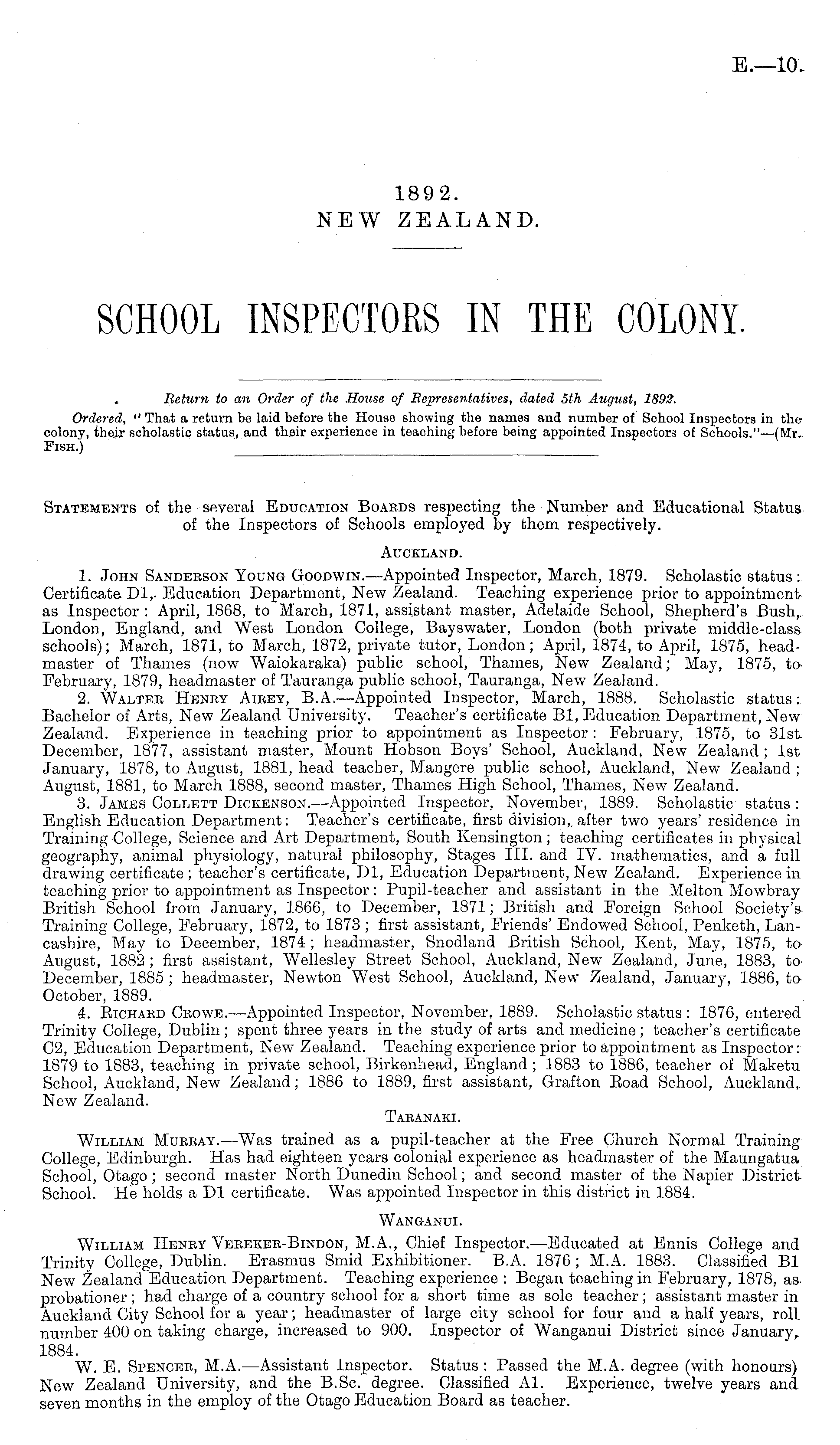 Statements of the several Education Boards respecting the Number and Educational Status of the Inspectors of Schools employed by them respectively. Auckland. 1. John Sandeeson Young Goodwin.—Appointed Inspector, March, 1879. Scholastic status: Certificate Dl,. Education Department, New Zealand. Teaching experience prior to appointment as Inspector : April, 1868, to March, 1871, assistant master, Adelaide School, Shepherd's Bush,. London, England, and West London College, Bayswater, London (both private middle-class schools); March, 1871, to March, 1872, private tutor, London; April, 1874, to April, 1875, headmaster of Thames (now Waiokaraka) public school, Thames, New Zealand; May, 1875, toFebruary, 1879, headmaster of Tauranga public school, Tauranga, New Zealand. 2. Walter Henry Airey, B.A. —Appointed Inspector, March, 1888. Scholastic status: Bachelor of Arts, New Zealand University. Teacher's certificate 81, Education Department, New Zealand. Experience in teaching prior to appointment as Inspector : February, 1875, to 31st December, 1877, assistant master, Mount Hobson Boys' School, Auckland, New Zealand ; Ist January, 1878, to August, 1881, head teacher, Mangere public school, Auckland, New Zealand ; August, 1881, to March 1888, second master, Thames High School, Thames, New T Zealand. 3. James Collett Dickenson. —Appointed Inspector, November, 1889. Scholastic status : English Education Department: Teacher's certificate, first division,, after two years' residence in Training College, Science and Art Department, South Kensington; teaching certificates in physical geography, animal physiology, natural philosophy, Stages 111. and IV. mathematics, and a full drawing certificate; teacher's certificate, Dl, Education Department, New Zealand. Experience in teaching prior to appointment as Inspector: Pupil-teacher and assistant in the Melton Mowbray British School from January, 1866, to December, 1871; British and Foreign School Society'sTraining College, February, 1872, to 1873 ; first assistant, Friends' Endowed School, Penketh, Lancashire, May to December, 1874 ; headmaster, Snodland British School, Kent, May, 1875, to August, 1882 ; first assistant, Wellesley Street School, Auckland, New Zealand, June, 1883, toDecember, 1885 ; headmaster, Newton West School, Auckland, New Zealand, January, 1886, to October, 1889. 4. Eichaed Crowe. —Appointed Inspector, November, 1889. Scholastic status : 1876, entered Trinity College, Dublin ; spent three years in the study of arts and medicine ; teacher's certificate C 2, Education Department, New Zealand. Teaching experience prior to appointment as Inspector: 1879 to 1883, teaching in private school, Birkenhead, England; 1883 to 1886, teacher of Maketu School, Auckland, New Zealand; 1886 to 1889, first assistant, Grafton Eoad School, Auckland, New Zealand. Taranaki. William Murray.—Was trained as a pupil-teacher at the Free Church Normal Training College, Edinburgh. Has had eighteen years colonial experience as headmaster of the Maungatua School, Otago ; second master North Dunedin School; and second master of the Napier District School. He holds aDI certificate. Was appointed Inspector in this district in 1884. Wanganui. William Henry Vereker-Bindon, M.A., Chief Inspector.—Educated at Ennis College and Trinity College, Dublin. Erasmus Smid Exhibitioner. B.A. 1876; M.A. 1883. Classified Bl New Zealand Education Department. Teaching experience : Began teaching in February, 1878. as probationer ; had charge of a country school for a short time as sole teacher; assistant master in Auckland City School for a year; headmaster of large city school for four and a half years, roll number 400 on taking charge, increased to 900. Inspector of Wanganui District since January, 1884. W. E. Spencer, M.A. —Assistant Inspector. Status : Passed the M.A. degree (with honours) New Zealand University, and the B.Sc. degree. Classified Al. Experience, twelve years and seven months in the employ of the Otago Education Board as teacher.