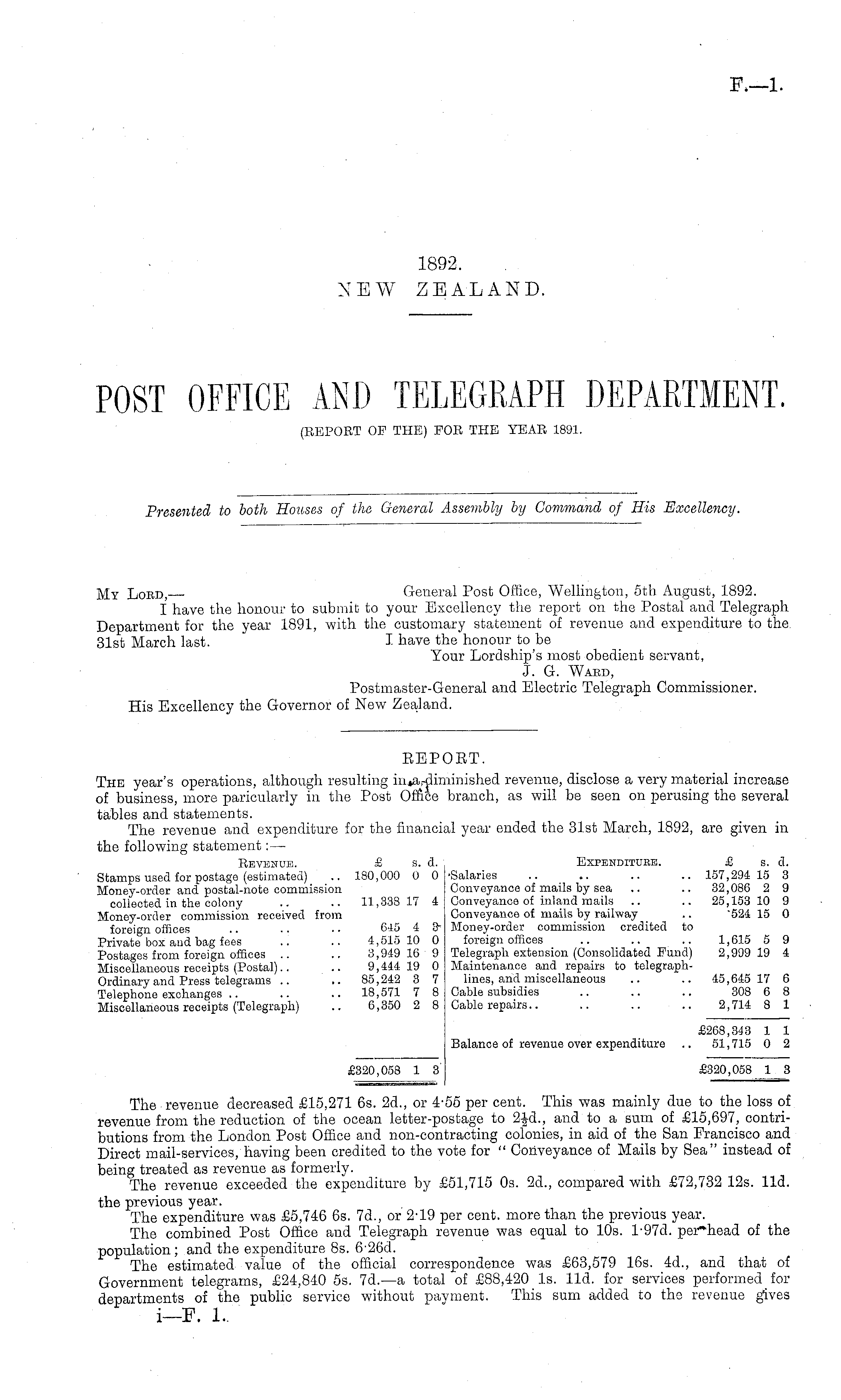 My Loed, General Post Office, Wellington, otb August, 1892. I have the honour to submit to your Excellency the report on the Postal and Telegraph Department for the year 1891, with the customary statement of revenue and expenditure to the. 31st March last. I have the honour to be Your Lordship's most obedient servant, J. G. Ward, Postmaster-General and Electric Telegraph Commissioner. His Excellency the Governor of New Zealand.