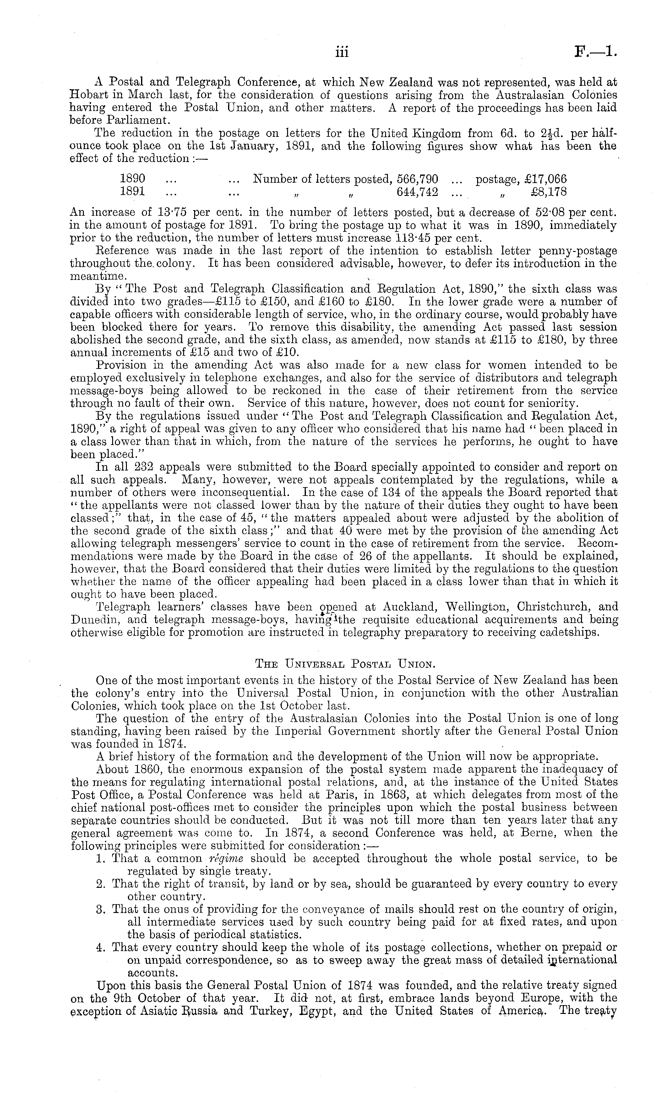 A Postal and Telegraph Conference, at which New Zealand was not represented, was held at Hobart in March last, for the consideration of questions arising from the Australasian Colonies having entered the Postal Union, and other matters. A report of the proceedings has been laid before Parliament. The reduction in the postage on letters for the United Kingdom from 6d. to 2-Jd. per halfounce took place on the Ist January, 1891, and the following figures show what has been the effect of the reduction : — 1890 ... ... Number of letters posted, 566,790 ... postage, £17,066 1891 ... ... „ „ 644,742 ... „ £8,178 An increase of 13-75 per cent, in the number of letters posted, but a decrease of 52-08 per cent, in the amount of postage for 1891. To bring the postage up to what it was in 1890, immediately prior to the reduction, the number of letters must increase 113-45 per cent. Eeference was made in the last report of the intention to establish letter penny-postage throughout the. colony. It has been considered advisable, however, to defer its introduction in the meantime. By " The Post and Telegraph Classification and Regulation Act, 1890," the sixth class was divided into two grades —£115 to £150, and £160 to £180. In the lower grade were a number of capable officers with considerable length of service, who, in the ordinary course, would probably have been blocked there for years. To remove this disability, the amending Act passed last session abolished the second grade, and the sixth class, as amended, now stands at £115 to £180, by three annual increments of £15 and two of £10. Provision in the amending Act was also made for a new class for women intended to be employed exclusively in telephone exchanges, and also for the service of distributors and telegraph message-boys being allowed to be reckoned in the case of their retirement from the service through no fault of their own. Service of this nature, however, does not count for seniority. By the regulations issued under " The Post and Telegraph Classification and Regulation Act, 1890," a right of appeal was given to any officer who considered that his name had " been placed in a class lower than that in which, from the nature of the services he performs, he ought to have been placed." In all 232 appeals were submitted to the Board specially appointed to consider and report on all such appeals. Many, however, were not appeals contemplated by the regulations, while a number of others were inconsequential. In the case of 134 of the appeals the Board reported that " the appellants were not classed lower than by the nature of their duties they ought to have been classed;" that, in the case of 45, "the matters appealed about were adjusted by the abolition of the second grade of the sixth class;" and that 40 were met by the provision of the amending Act allowing telegraph messengers' service to count in the case of retirement from the service. Recommendations were made by the Board in the case of 26 of the appellants. It should be explained, however, that the Board considered that their duties were limited by the regulations to the question whether the name of the officer appealing had been placed in a class lower than that in which it ought to have been placed. Telegraph learners' classes have been opened at Auckland, Wellington, Christchurch, and Dunedin, and telegraph message-boys, having-Hhe requisite educational acquirements and being otherwise eligible for promotion are instructed in telegraphy preparatory to receiving cadetships. The Universal Postal Union. One of the most important events in the history of the Postal Service of New Zealand has been the colony's entry into the Universal Postal Union, in conjunction with the other Australian Colonies, which took place on the Ist October last. The question of the entry of the Australasian Colonies into the Postal Union is one of long standing, having been raised by the Imperial Government shortly after the General Postal Union was founded in 1874. A brief history of the formation and the development of the Union will now be appropriate. About 1860, the enormous expansion of the postal system made apparent the inadequacy of the means for regulating international postal relations, and, at the instance of the United States Post Office, a Postal Conference was held at Paris, in 1863, at which delegates from most of the chief national post-offices met to consider the principles upon which the postal business between separate countries should be conducted. But it was not till more than ten years later that any general agreement was come to. In 1874, a second Conference was held, at Berne, when the following principles were submitted for consideration: — 1. That a common regime should be accepted throughout the whole postal service, to be regulated by single treaty. 2. That the right of transit, by land or by sea, should be guaranteed by every country to every other country. 3. That the onus of providing for the conveyance of mails should rest on the country of origin, all intermediate services used by such country being paid for at fixed rates, and upon the basis of periodical statistics. 4. That every country should keep the whole of its postage collections, whether on prepaid or on unpaid correspondence, so as to sweep away the great mass of detailed international accounts. Upon this basis the General Postal Union of 1874 was founded, and the relative treaty signed on the 9th October of that year. It did not, at first, embrace lands beyond Europe, with the exception of Asiatic Russia and Turkey, Egypt, and the United States of America. The treaty