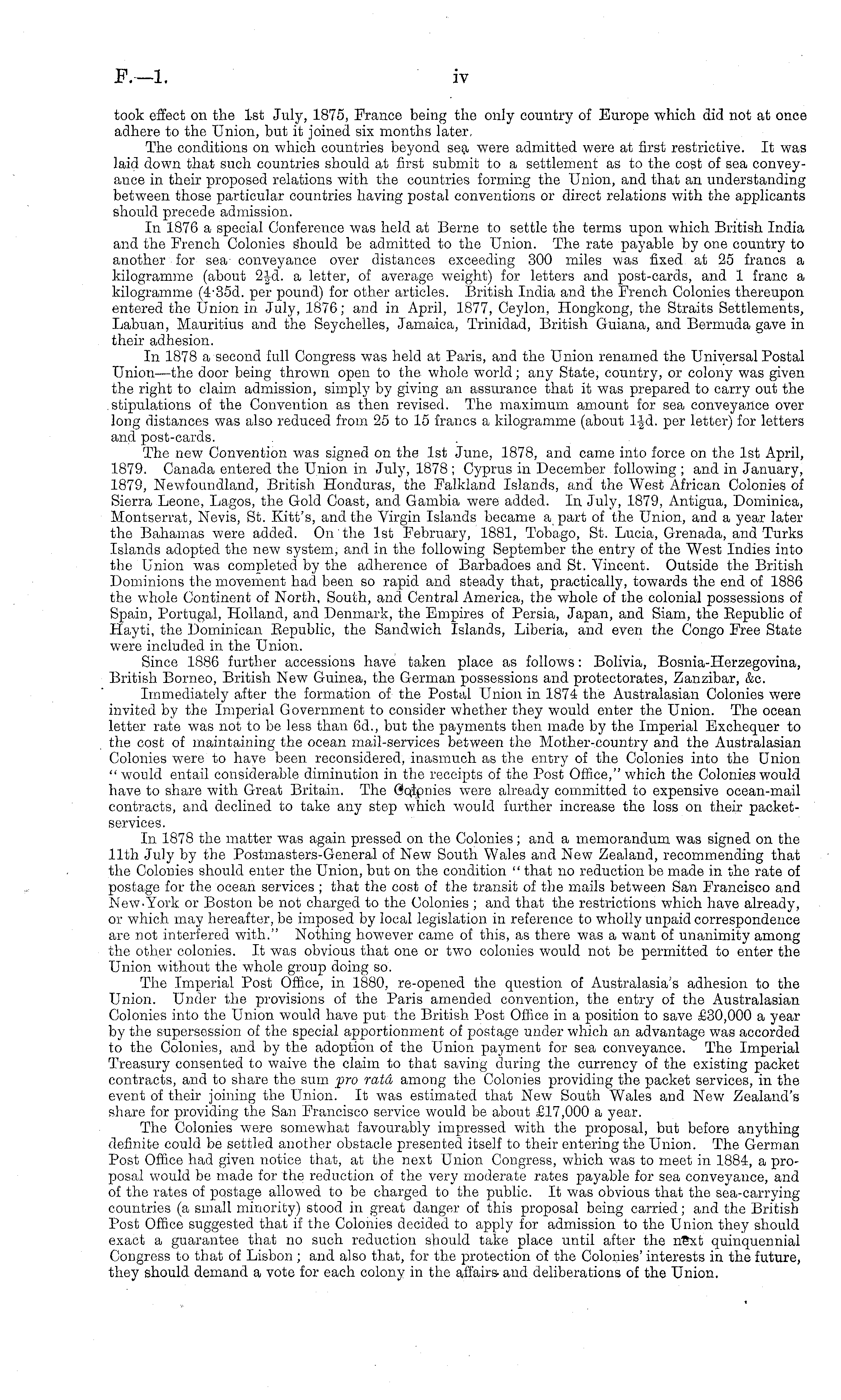 took effect on the Ist July, 1875, France being the only country of Europe which did not at once adhere to the Union, but it joined six months later. The conditions on which countries beyond sea were admitted were at first restrictive. It was laid down that such countries should at first submit to a settlement as to the cost of sea conveyance in their proposed relations with the countries forming the Union, and that an understanding between those particular countries having postal conventions or direct relations with the applicants should precede admission. In 1876 a special Conference was held at Berne to settle the terms upon which British India and the French Colonies should be admitted to the Union. The rate payable by one country to another for sea conveyance over distances exceeding 300 miles was fixed at 25 francs a kilogramme (about 2|-d. a letter, of average weight) for letters and post-cards, and 1 franc a kilogramme (4-35 d. per pound) for other articles. British India and the French Colonies thereupon entered the Union in July, 1876; and in April, 1877, Ceylon, Hongkong, the Straits Settlements, Labuan, Mauritius and the Seychelles, Jamaica, Trinidad, British Guiana, and Bermuda gave in their adhesion. In 1878 a second full Congress was held at Paris, and the Union renamed the Universal Postal Union—the door being thrown open to the whole world; any State, country, or colony was given the right to claim admission, simply by giving an assurance that it was prepared to carry out the stipulations of the Convention as then revised. The maximum amount for sea conveyance over long distances was also reduced from 25 to 15 francs a kilogramme (about 1-J-d. per letter) for letters and post-cards. The new Convention was signed on the Ist June, 1878, and came into force on the Ist April, 1879. Canada entered the Union in July, 1878 ; Cyprus in December following ; and in January, 1879, Newfoundland, British Honduras, the Falkland Islands, and the West African Colonies of Sierra Leone, Lagos, the Gold Coast, and Gambia were added. In July, 1879, Antigua, Dominica, Montserrat, Nevis, St. Kitt's, and the Virgin Islands became a part of the Union, and a year later the Bahamas were added. On the Ist February, 1881, Tobago, St. Lucia, Grenada, and Turks Islands adopted the new system, and in the following September the entry of the West Indies into the Union was completed by the adherence of Barbadoes and St. Vincent. Outside the British Dominions the movement had been so rapid and steady that, practically, towards the end of 1886 the whole Continent of North, South, and Central America, the whole of the colonial possessions of Spain, Portugal, Holland, and Denmark, the Empires of Persia, Japan, and Siam, the Republic of Hayti, the Dominican Eepublic, the Sandwich Islands, Liberia, and even the Congo Free State were included in the Union. Since 1886 further accessions have taken place as follows: Bolivia, Bosnia-Herzegovina, British Borneo, British New Guinea, the German possessions and protectorates, Zanzibar, &c. Immediately after the formation of the Postal Union in 1874 the Australasian Colonies were invited by the Imperial Government to consider whether they would enter the Union. The ocean letter rate was not to be less than 6d., but the payments then made by the Imperial Exchequer to the cost of maintaining the ocean mail-services between the Mother-country and the Australasian Colonies were to have been reconsidered, inasmuch as the entry of the Colonies into the Union " would entail considerable diminution in the receipts of the Post Office," which the Colonies would have to share with Great Britain. The Qqlpnies were already committed to expensive ocean-mail contracts, and declined to take any step which would further increase the loss on their packetservices. In 1878 the matter was again pressed on the Colonies; and a memorandum was signed on the 11th July by the Postmasters-General of New South Wales and New Zealand, recommending that the Colonies should enter the Union, but on the condition " that no reduction be made in the rate of postage for the ocean services ; that the cost of the transit of the mails between San Francisco and New •York or Boston be not charged to the Colonies ; and that the restrictions which have already, or which may hereafter, be imposed by local legislation in reference to wholly unpaid correspondence are not interfered with." Nothing however came of this, as there was a want of unanimity among the other colonies. It was obvious that one or two colonies would not be permitted to enter the Union without the whole group doing so. The Imperial Post Office, in 1880, re-opened the question of Australasia's adhesion to the Union. Under the provisions of the Paris amended convention, the entry of the Australasian Colonies into the Union would have put the British Post Office in a position to save £30,000 a year by the supersession of the special apportionment of postage under which an advantage was accorded to the Colonies, and by the adoption of the Union payment for sea conveyance. The Imperial Treasury consented to waive the claim to that saving during the currency of the existing packet contracts, and to share the sum pro raid among the Colonies providing the packet services, in the event of their joining the Union. It was estimated that New South Wales and New Zealand's share for providing the San Francisco service would be about £17,000 a year. The Colonies were somewhat favourably impressed with the proposal, but before anything definite could be settled another obstacle presented itself to their entering the Union. The German Post Office had given notice that, at the next Union Congress, which was to meet in 1884, a proposal would be made for the reduction of the very moderate rates payable for sea conveyance, and of the rates of postage allowed to be charged to the public. It was obvious that the sea-carrying countries (a small minority) stood i