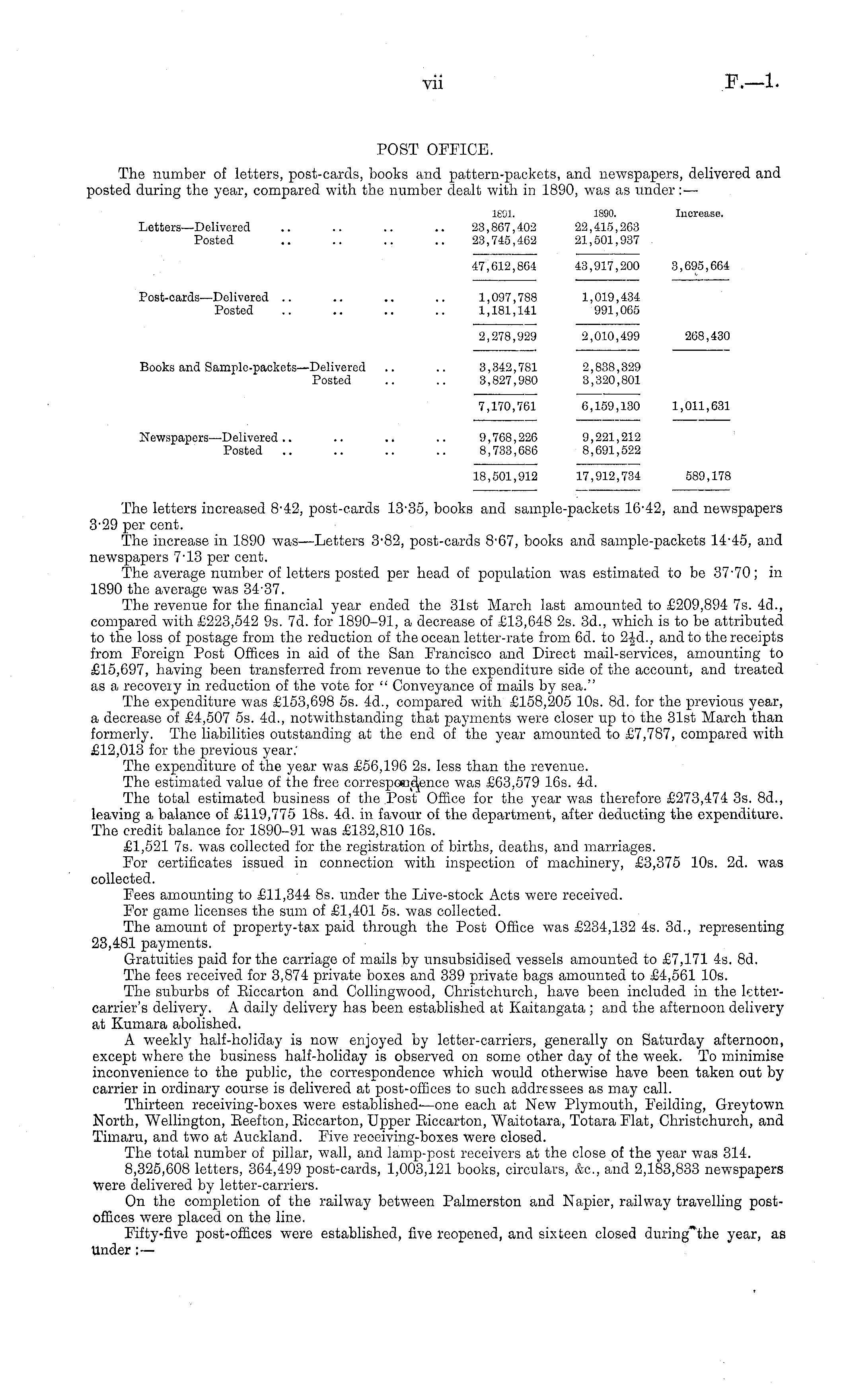 POST OFFICE. The number of letters, post-cards, books and pattern-packets, and newspapers, delivered and posted during the year, compared with the number dealt with in 1890, was as under :— 1891. 1800. Increase. Letters—Delivered .. .. .. .. 23,867,402 22,416,268 Posted .. .. .. .. 23,745,462 21,501,937 47,612,864 43,917,200 3,693,664 Post-cards—Delivered .. .. .. .. 1,097,788 1,019,434 Posted .. .. .. .. 1,181,141 991,065 2,278,929 2,010,499 268,430 Books and Sample-packets—Delivered .. .. 3,342,781 2,838,329 Posted .. .. 3,827,980 3,320,801 7,170,761 6,159,130 1,011,631 Newspapers—Delivered .. .. .. .. 9,768,226 9,221,212 Posted .. .. .. .. 8,733,680 8,691,522 18,501,912 17,912,734 589,178 The letters increased 8-42, post-cards 13-35, books and sample-packets 16-42, and newspapers 3-29 per cent. The increase in 1890 was—Letters 3-82, post-cards 8-67, books and sample-packets 14-45, and newspapers 7-13 per cent. The average number of letters posted per head of population was estimated to be 3770; in 1890 the average was 34-37. The revenue for the financial year ended the 31st March last amounted to £209,894 7s. 4d., compared with £223,542 9s. 7d. for 1890-91, a decrease of £13,648 2s. 3d., which is to be attributed to the loss of postage from the reduction of the ocean letter-rate from 6d. to 2-Jd., and to the receipts from Foreign Post Offices in aid of the San Francisco and Direct mail-services, amounting to £15,697, having been transferred from revenue to the expenditure side of the account, and treated as a recovery in reduction of the vote for " Conveyance of mails by sea." The expenditure was £153,698 ss. 4d., compared with £158,205 10s. Bd. for the previous year, a decrease of £4,507 ss. 4d., notwithstanding that payments were closer up to the 31st March than formerly. The liabilities outstanding at the end of the year amounted to £7,787, compared with £12,013 for the previous year. The expenditure of the year was £56,196 2s. less than the revenue. The estimated value of the free correspondence was £63,579 16s. 4d. The total estimated business of the Post Office for the year was therefore £273,474 3s. Bd., leaving a balance of £119,775 18s. 4d. in favour of the department, after deducting the expenditure. The credit balance for 1890-91 was £132,810 16s. £1,521 7s. was collected for the registration of births, deaths, and marriages. For certificates issued in connection with inspection of machinery, £3,375 10s. 2d. was collected. Fees amounting to £11,344 Bs. under the Live-stock Acts were received. For game licenses the sum of £1,401 ss. was collected. The amount of property-tax paid, through the Post Office was £234,132 4s. 3d., representing 23,481 payments. Gratuities paid for the carriage of mails by unsubsidised vessels amounted to £7,171 4s. Bd. The fees received for 3,874 private boxes and 339 private bags amounted to £4,561 10s. The suburbs of Eiccarton and Collingwood, Christchurch, have been included in the lettercarrier's delivery. A daily delivery has been established at Kaitangata ; and the afternoon delivery at Kumara abolished. A weekly half-holiday is now enjoyed by letter-carriers, generally on Saturday afternoon, except where the business half-holiday is observed on some other day of the week. To minimise inconvenience to the public, the correspondence which would otherwise have been taken out by carrier in ordinary course is delivered at post-offices to such addressees as may call. Thirteen receiving-boxes were established- —one each at New Plymouth, Feilding, Greytown North, Wellington, Eeef ton, Eiccarton, Upper Eiccarton, Waitotara, Totara Flat, Christchurch, and Timaru, and two at Auckland. Five receiving-boxes were closed. The total number of pillar, wall, and lamp-post receivers at the close of the year was 314. 8,325,608 letters, 364,499 post-cards, 1,003,121 books, circulars, &c, and 2,183,833 newspapers were delivered by letter-carriers. On the completion of the railway between Palmerston and Napier, railway travelling postoffices were placed on the line. Fifty-five post-offices were established, five reopened, and sixteen closed during*the year, as Under:—