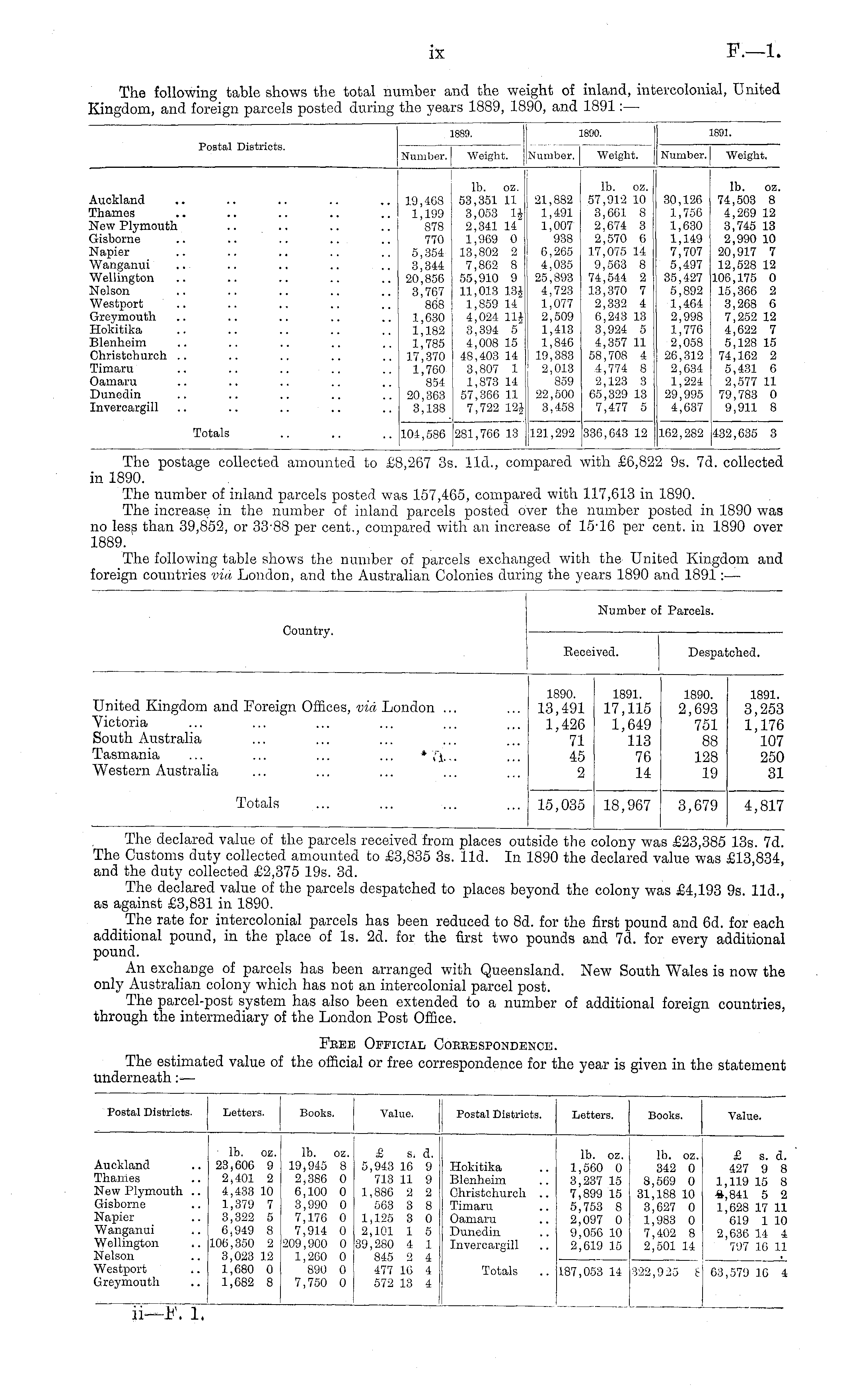 1889. 1890. 1891. Postal Districts. Number. Weight. I Number. Weight. Number. Weight. Auckland Thames New Plymouth Gisbome Napier Wanganui Wellington Nelson Westport Greymouth Hokitika Blenheim Christchurch .. Timaru Oamai'u Dunedin Inveroargill 19,468 1,199 878 ! 770 5,354 3,344 20,856 3,707 ; 868 1,630 1,182 ; 1,785 ; 17,370 1,760 854 20,303 3,138 lb. oz. 53,351 11 3,053 1J 2,341 14 1,969 0 13,802 2 j 7,862 8 J 55,910 9 11,013 18J 1,859 14 4,024 Hi 3,394 5" 4,008 15 48,403 14 3,807 1 1,873 14 57,366 11 7,722 12J 21,882 1,491 1,007 938 6,265 4,035 25,893 4,723 1,077 2,509 1,413 1,846 19,383 2,013 859 22,500 3,458 lb. oz. 57,912 10 3,661 8 2,674 3 2,570 6 17,075 14 9,503 8 74,544 2 13,370 7 2,332 4 6,243 13 3,924 5 4,357 11 58,708 4 4, 774 8 2,123 3 05,329 13 7,477 5 30,126 1,756 1,630 1,149 7,707 5,497 35,427 5,892 1,464 2,998 1,776 2,058 26,312 2,634 1,224 29,995 4,637 1b. oz. 74,503 8 4,269 12 3,745 13 2,990 10 20,917 7 12,528 12 106,175 0 15,366 2 3,268 6 7,252 12 4,622 7 5,128 15 74,162 2 5,431 6 2,577 11 79,783 0 9,911 8 Totals 281,766 13 121,292 336,643 12 162,282 432,635 3 104,5S6